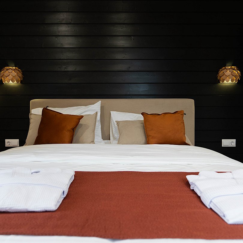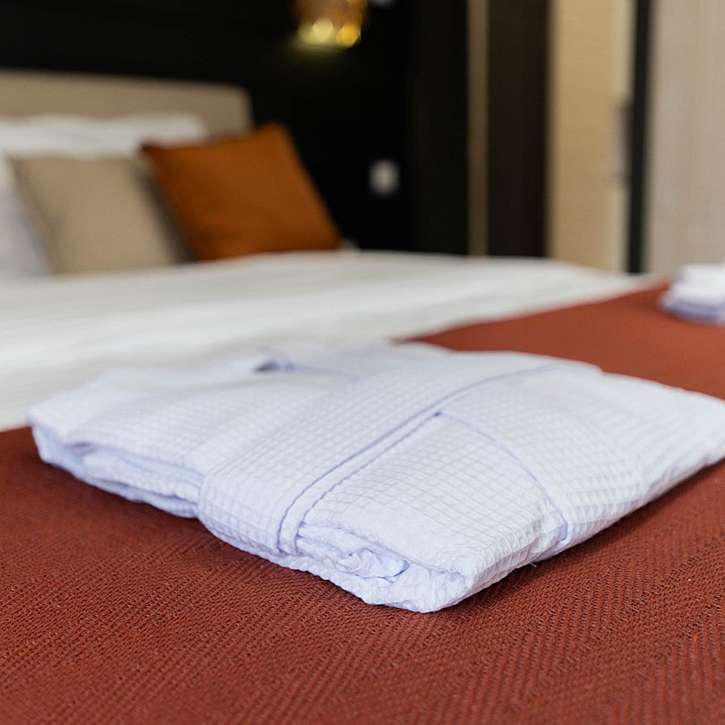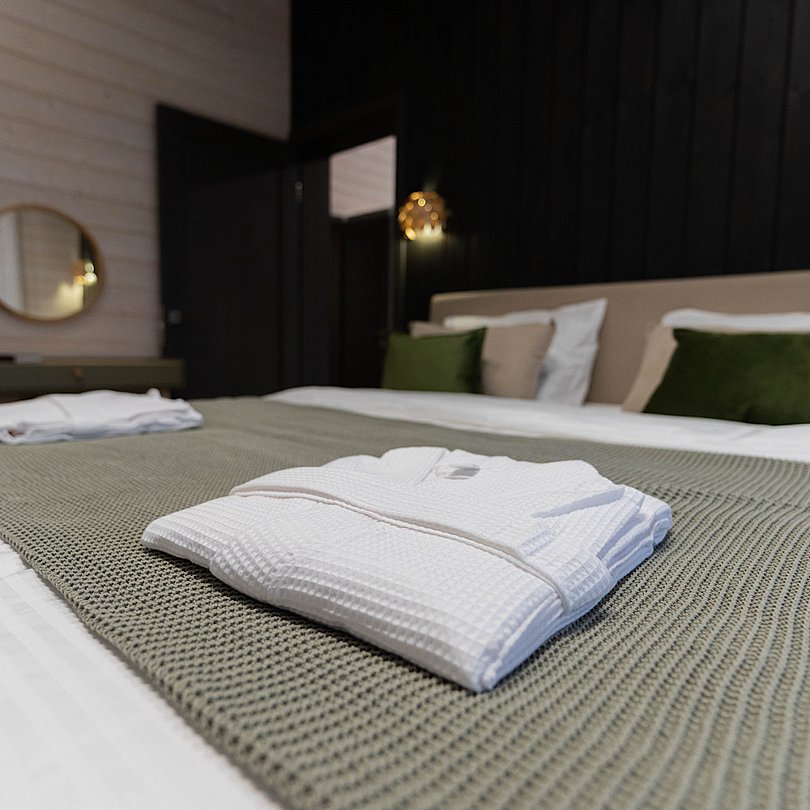- постельное бельё, полотенца, халаты и пледы — включены.