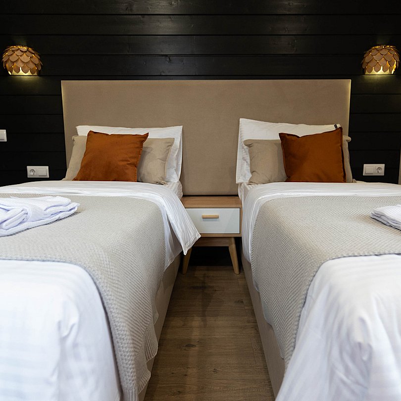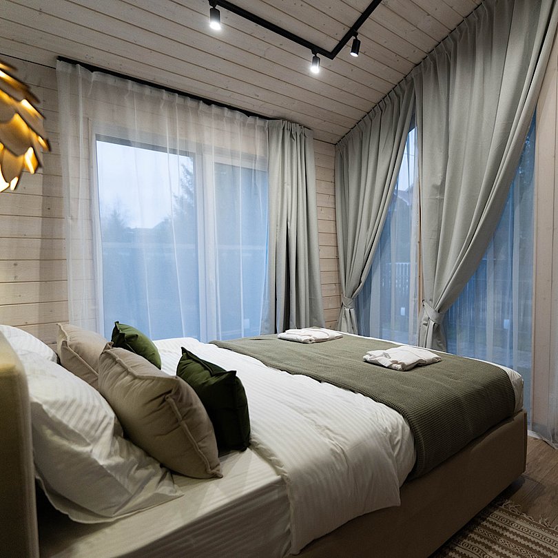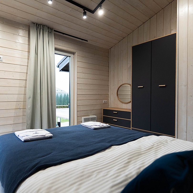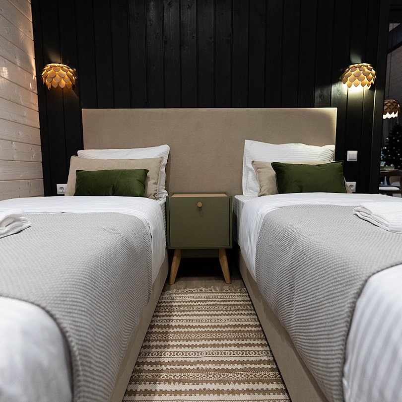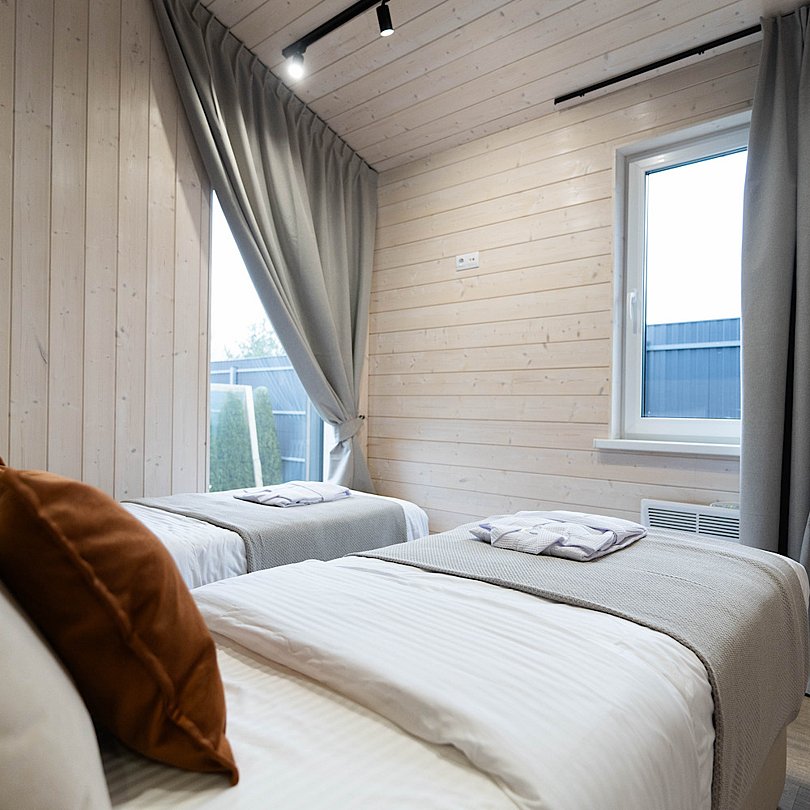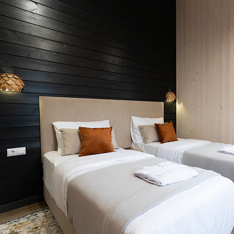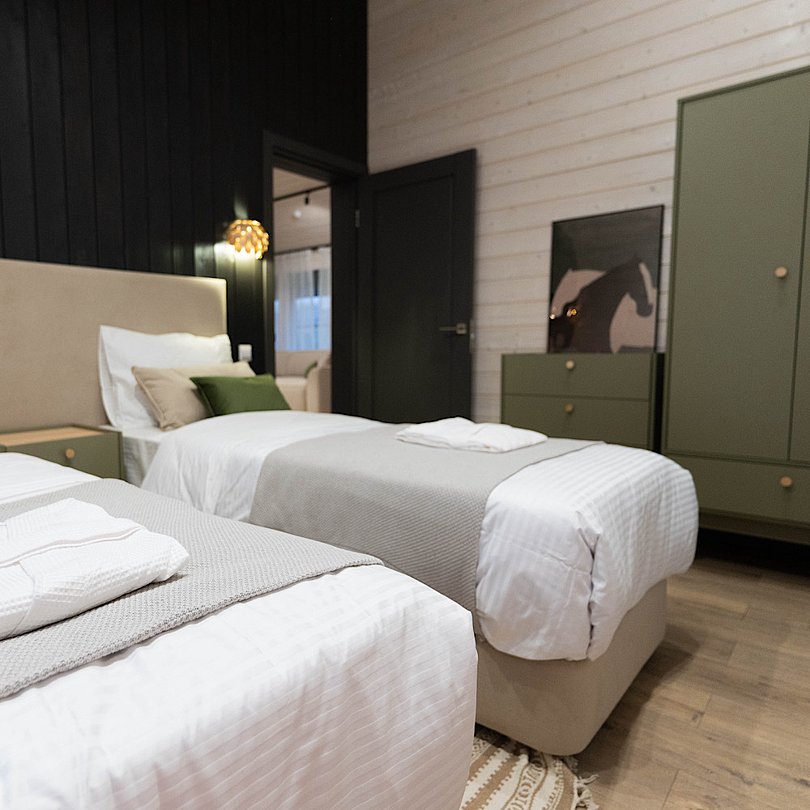 - 2 изолированные спальни: спальня с большой двуспальной кроватью; спальня со спринбоксами (можно использовать как одну большую или две отдельные кровати);
