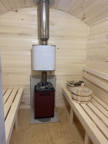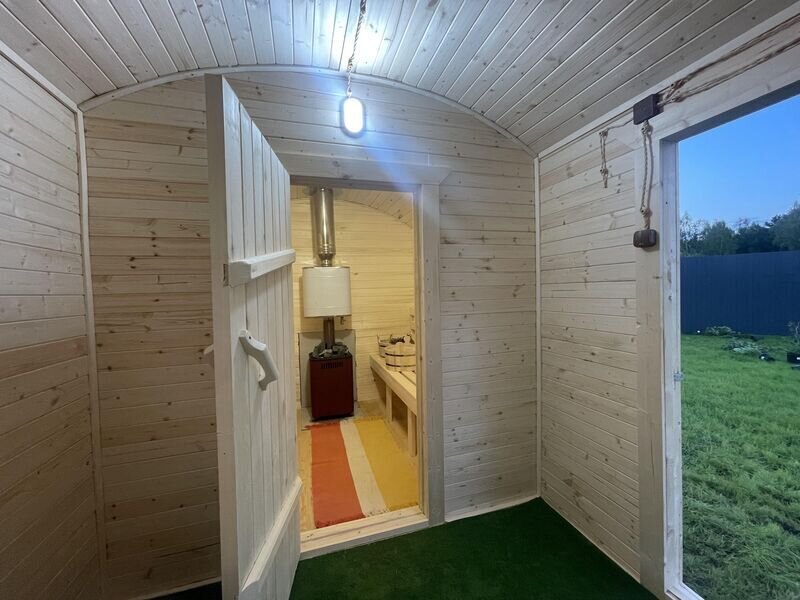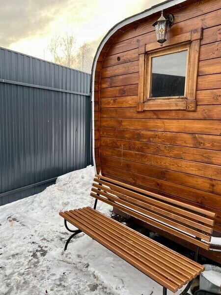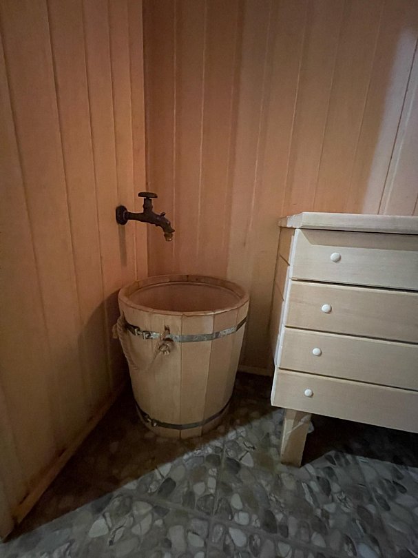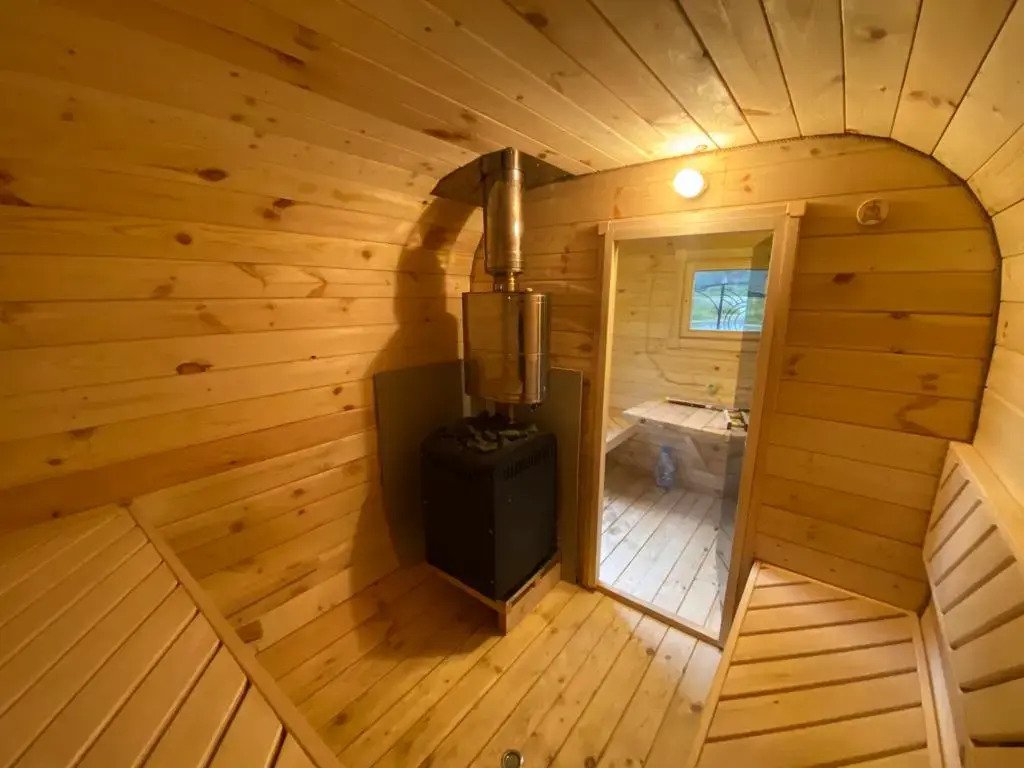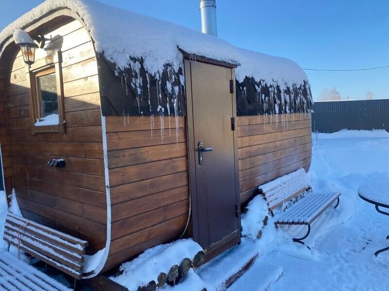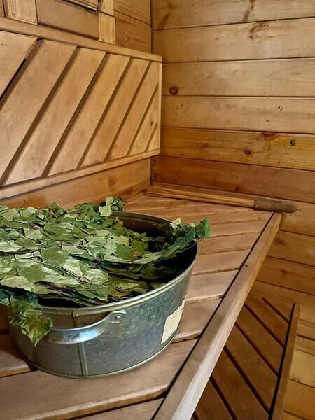 Баня бочка на дровах. Веники (береза , дуб, липа, разнотравье). После парной можно окунуться в речку (зимой делают прорубь).