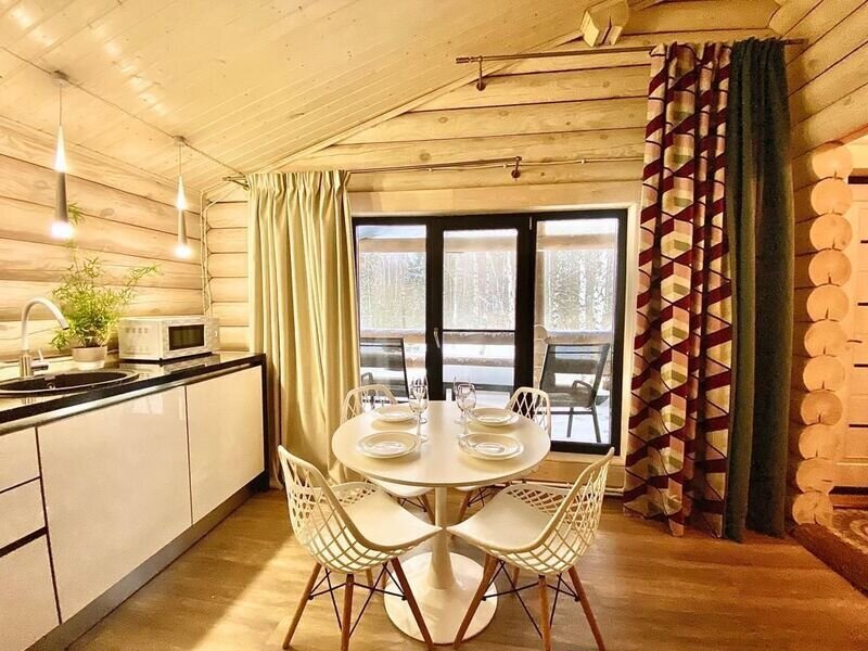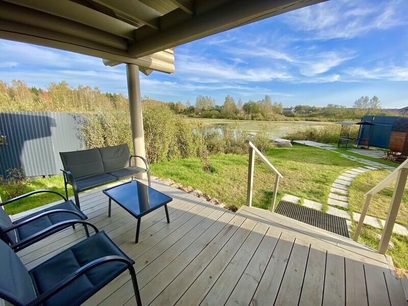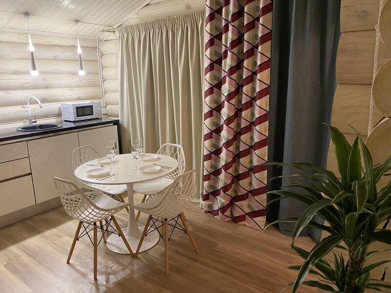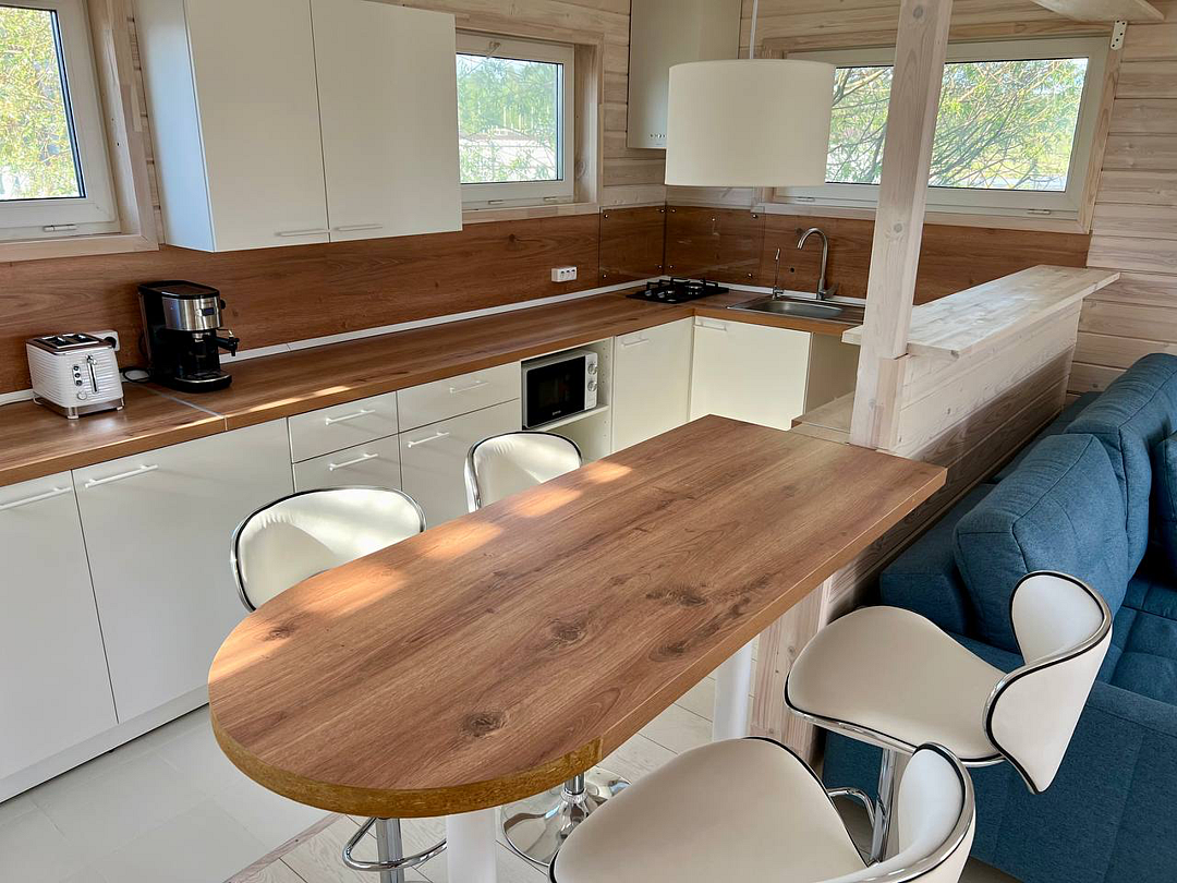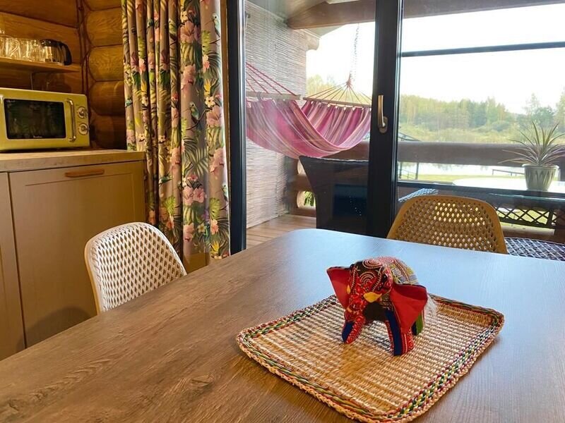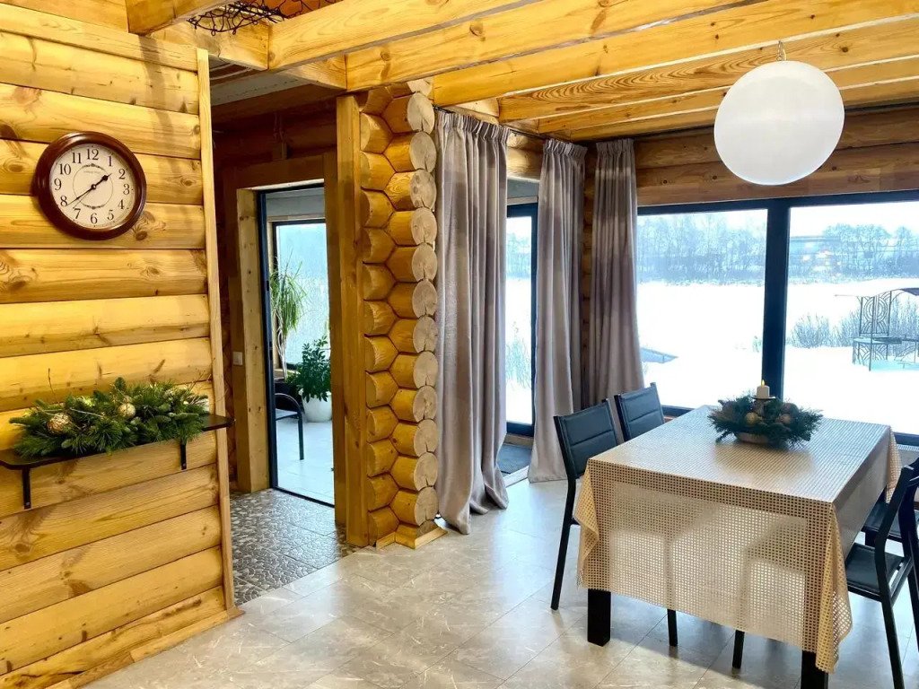 Внутри домика вы найдете все необходимое для комфортного проживания. Просторная гостиная с удобными мебелью создаст атмосферу уюта и тепла. На оборудованной кухне вы сможете приготовить свои любимые блюда и насладиться их вкусом в обеденной зоне с прекрасным видом на пруд.
