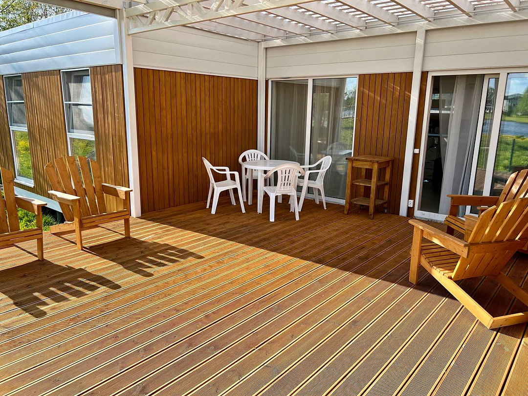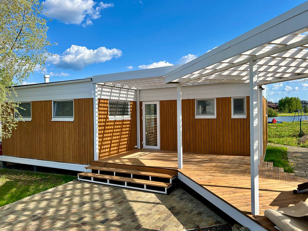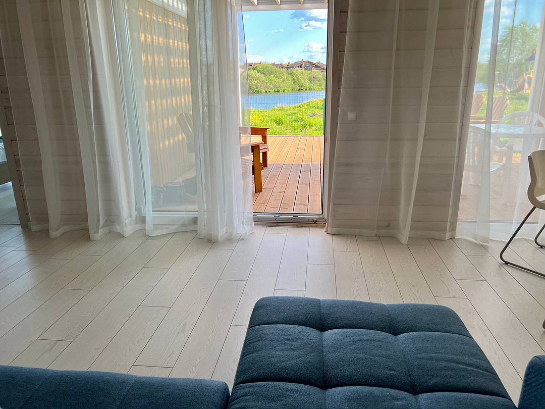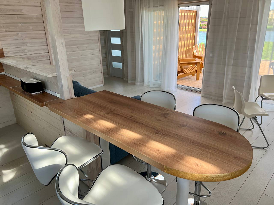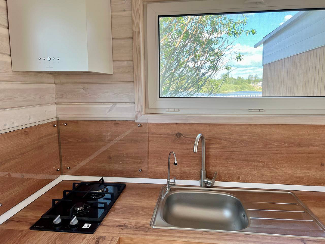 Внутри домика вы найдете все необходимое для комфортного проживания. Просторная гостиная с удобными мебелью создаст атмосферу уюта и тепла. На оборудованной кухне вы сможете приготовить свои любимые блюда и насладиться их вкусом в обеденной зоне с прекрасным видом на пруд.