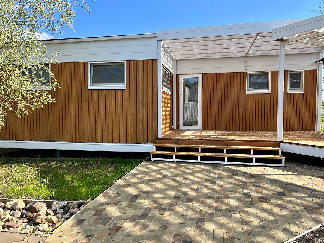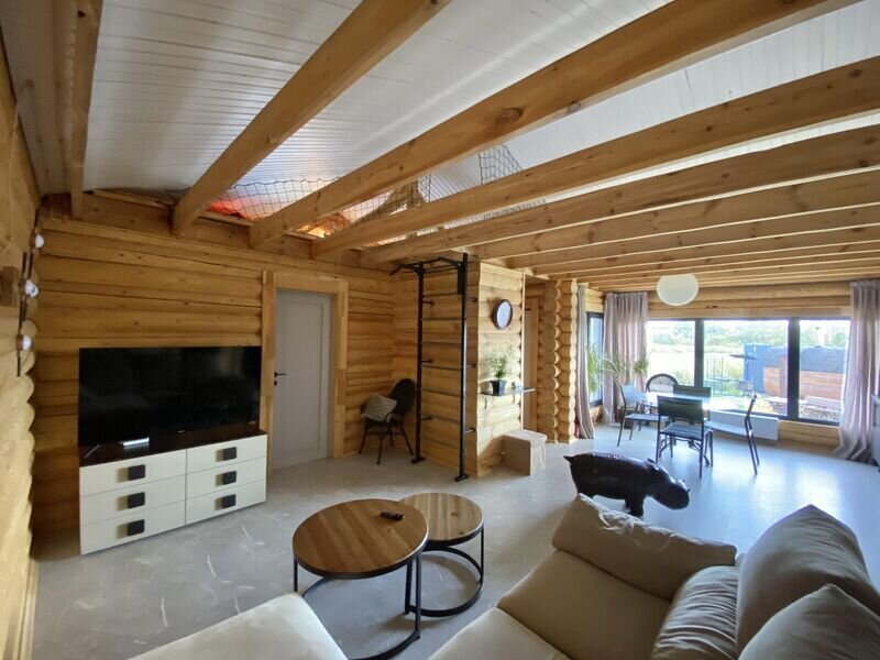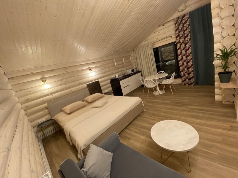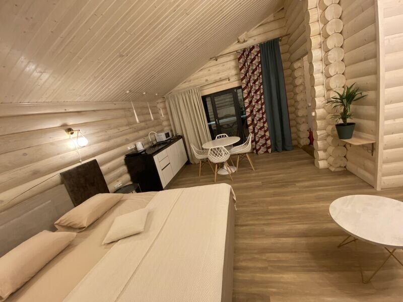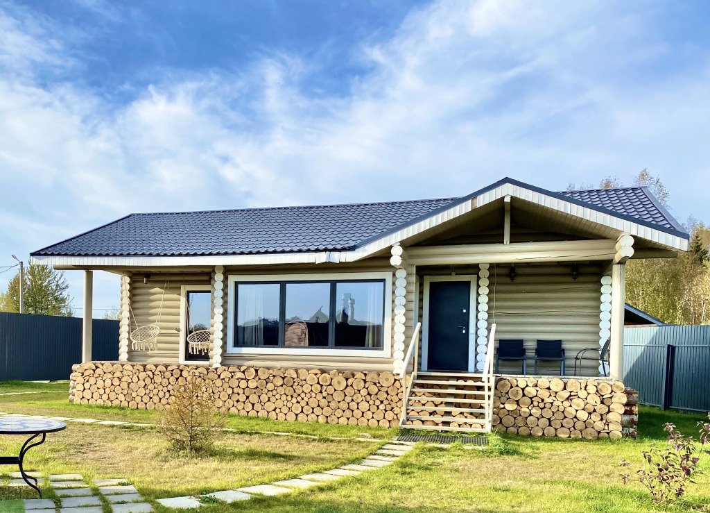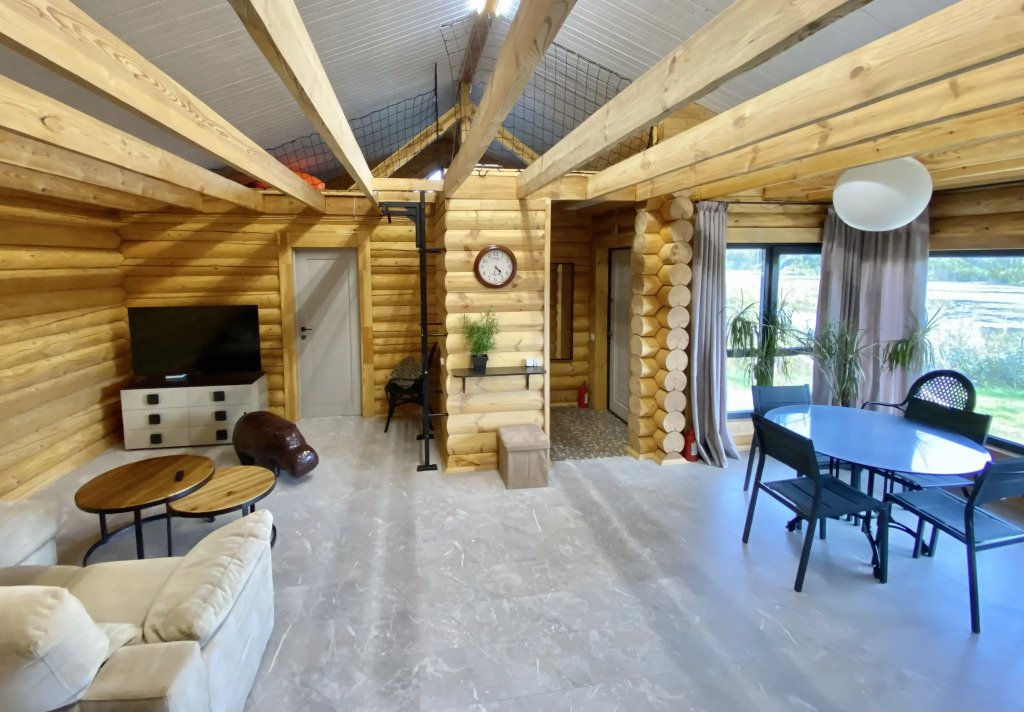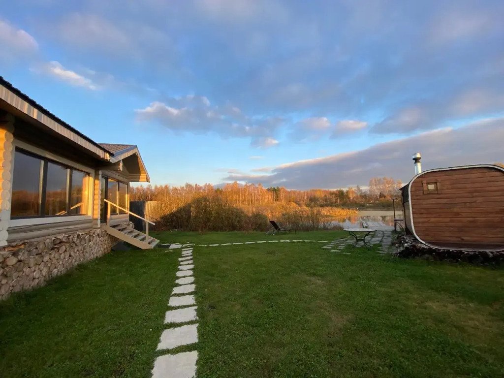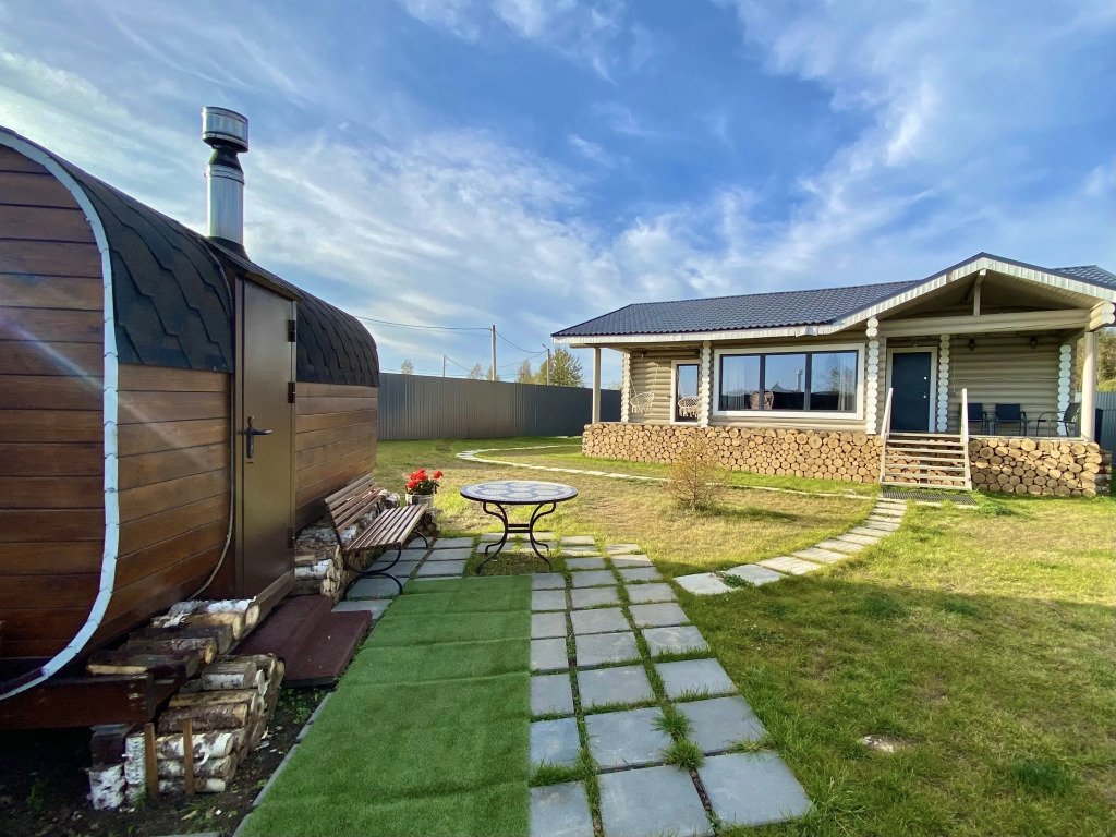 На речном берегу располагаются уютные домики, выполненные в русском стиле и изготовленные из круглого бревна. Каждый из этих домов обладает собственной территорией, на которой вы найдете мангальную зону, баню и банный чан, который работает на дровах.