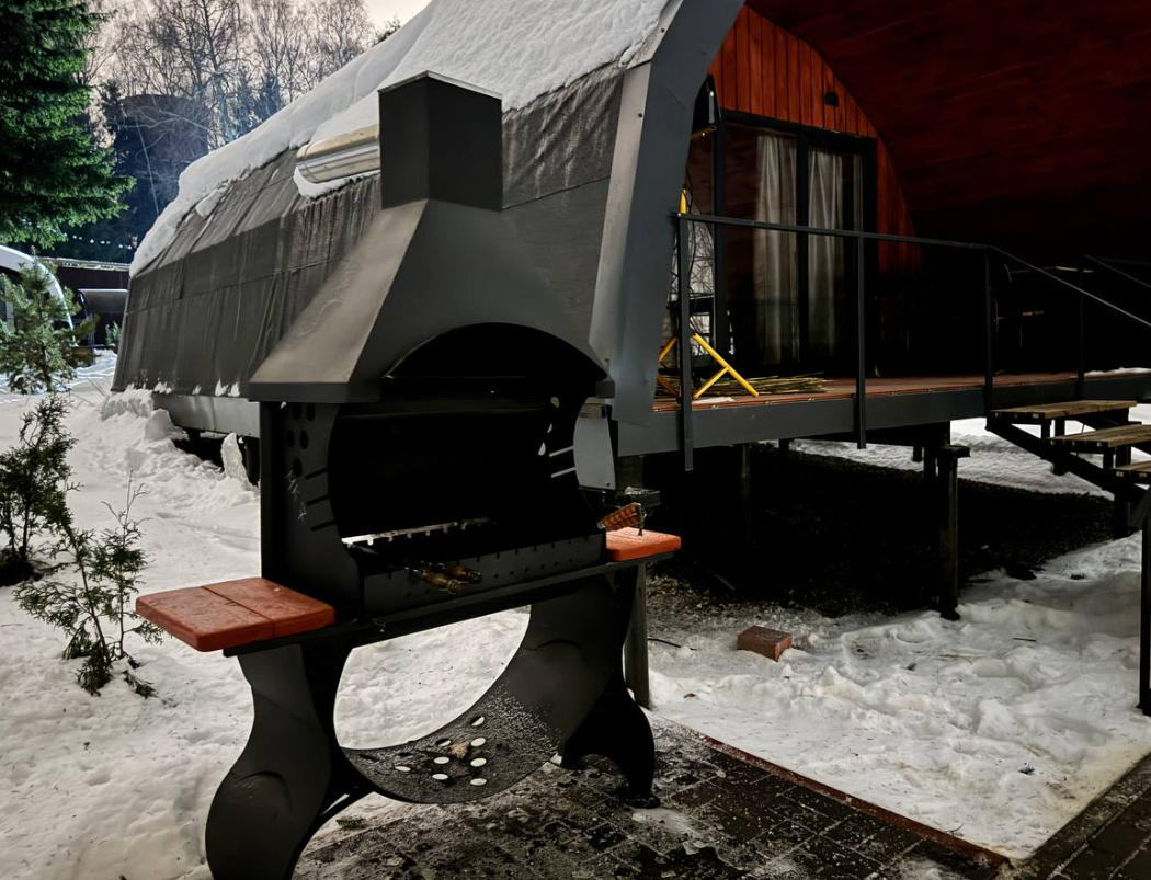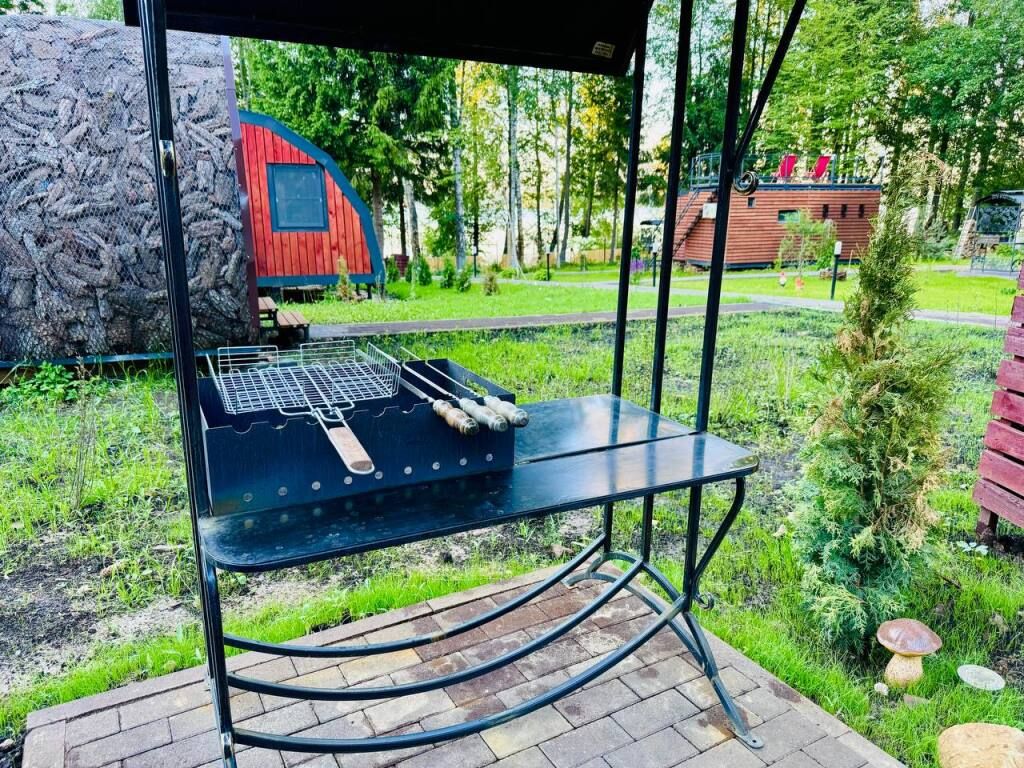 Каждый домик оснащён индивидуальной мангальной зоной, где для приготовления барбекю имеются посуда, шампуры, решетка. За дополнительную плату доступны казан и коптильня.