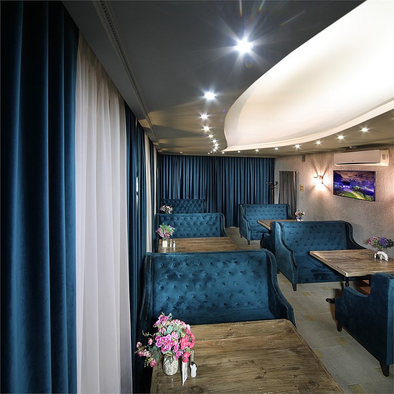 - Большой уютный зал с мягкими диванчиками и дубовым столом