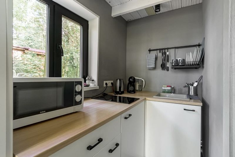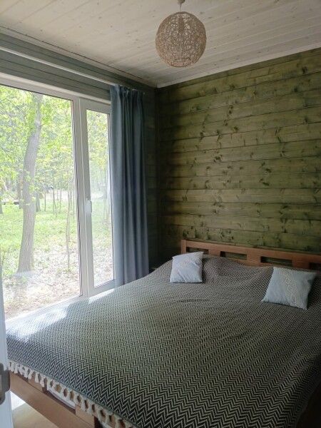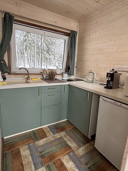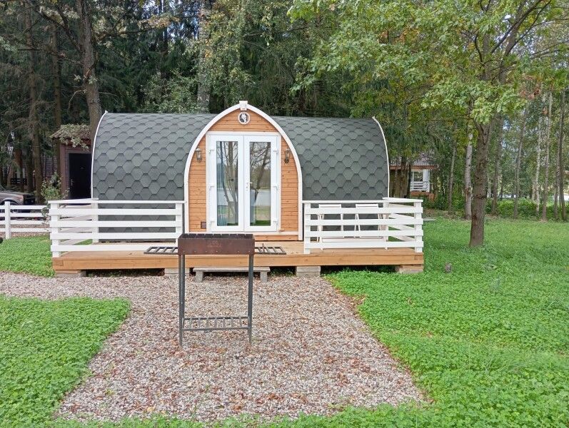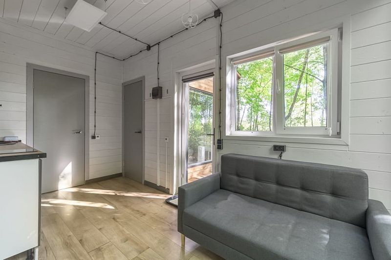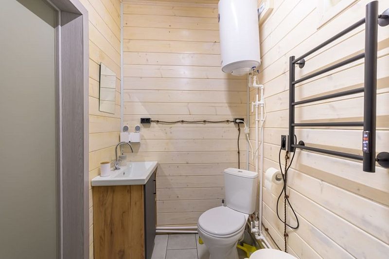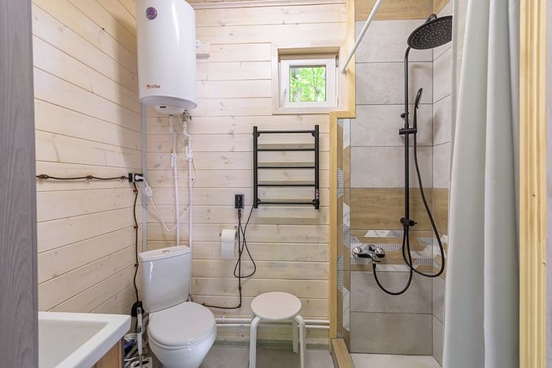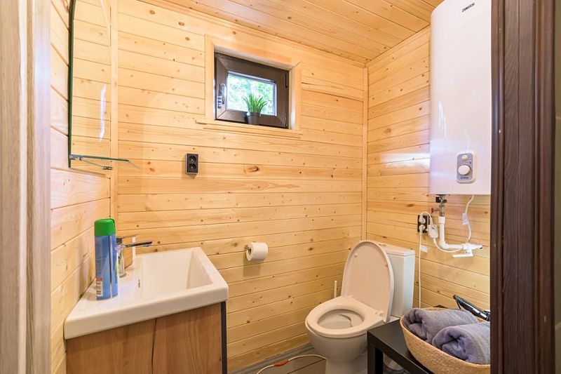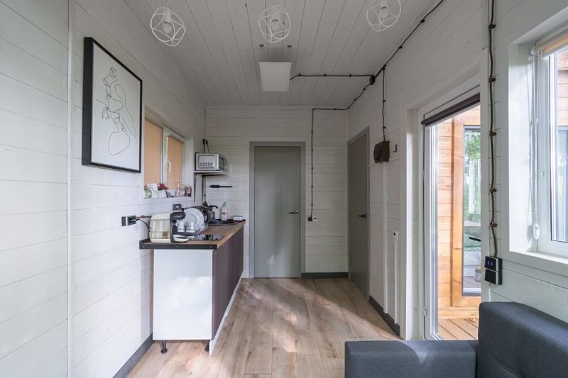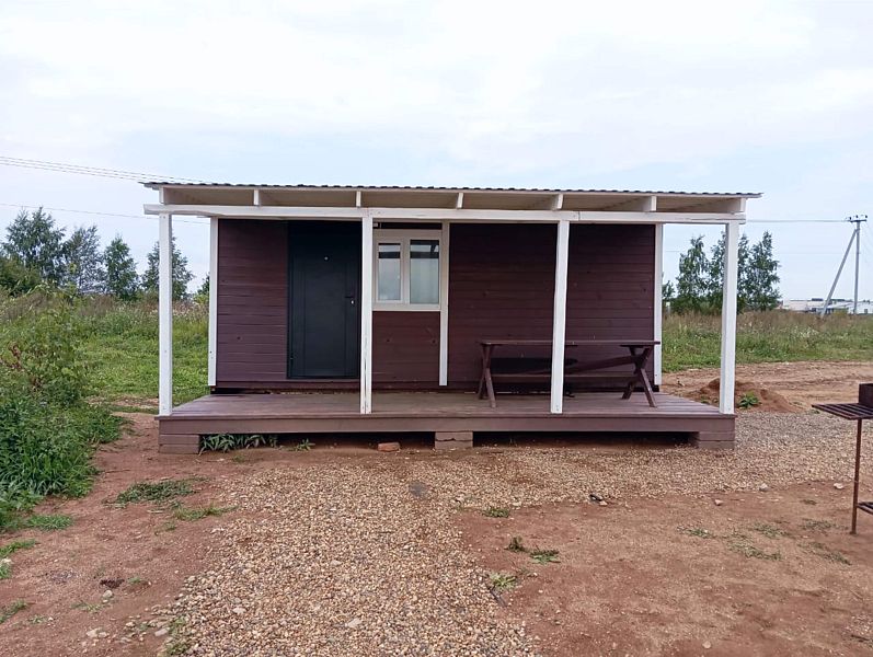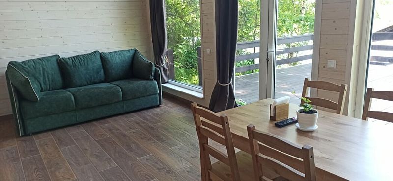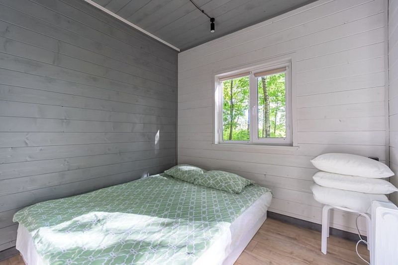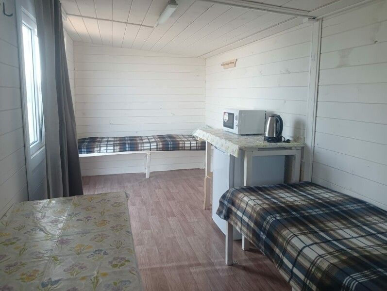 Одноэтажный домик (25 кв.м.) с отдельной спальней и общей кухней-гостиной. Рассчитан на комфортное проживание не более 3х взрослых или семью с детьми.
