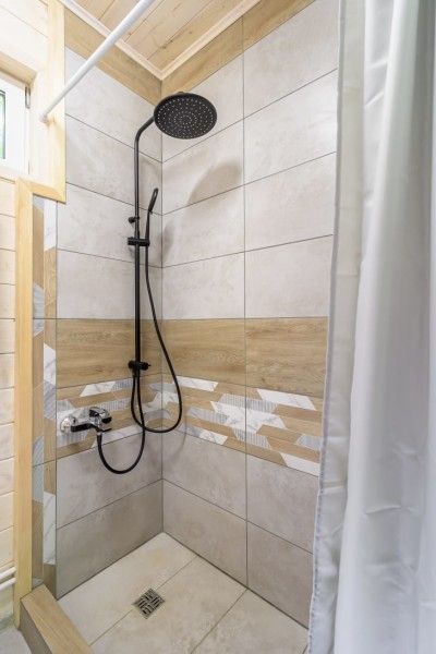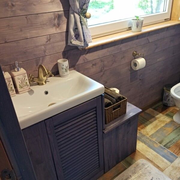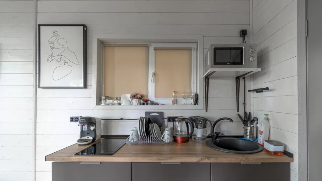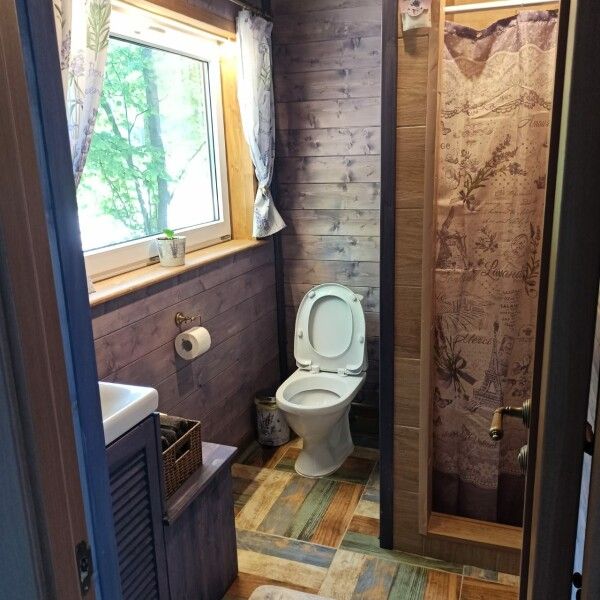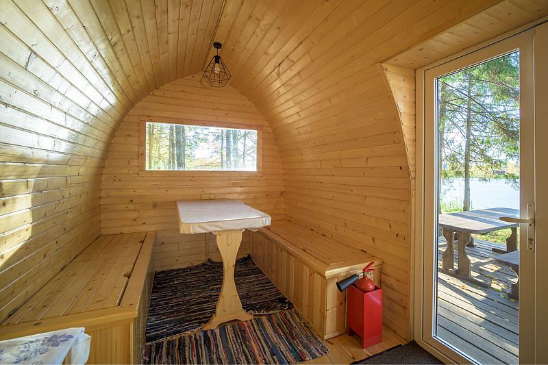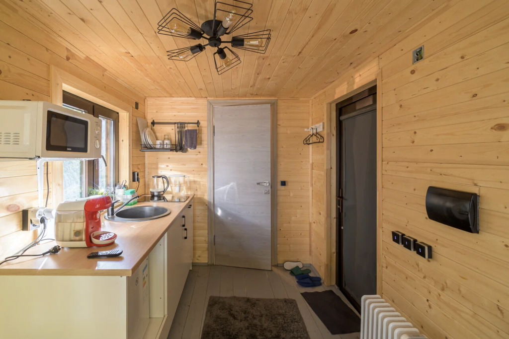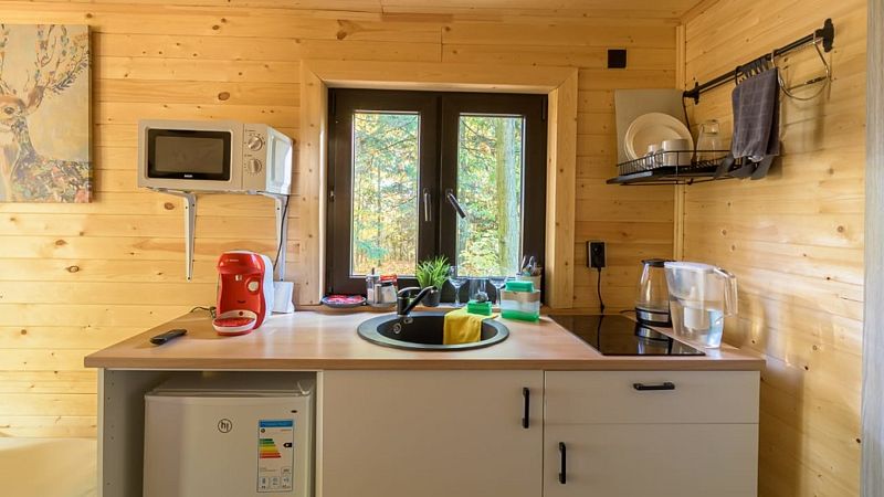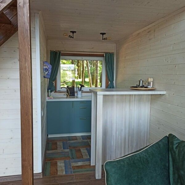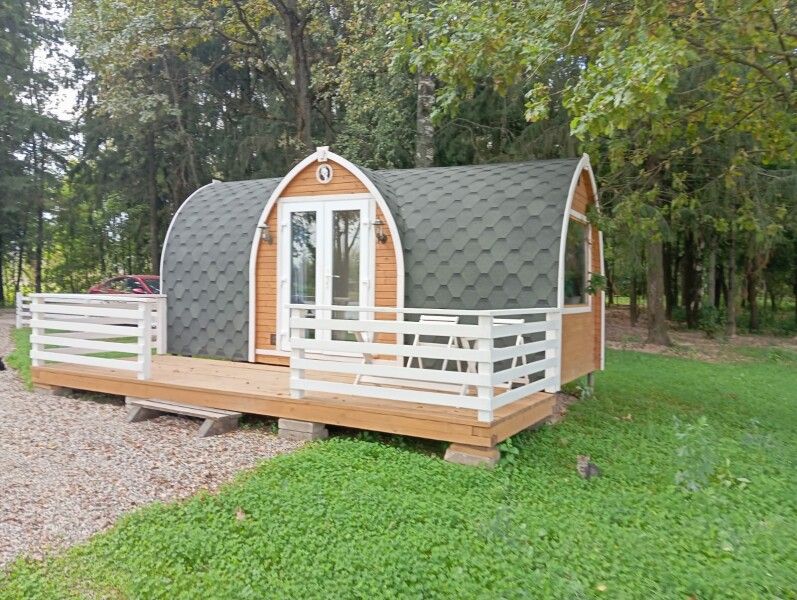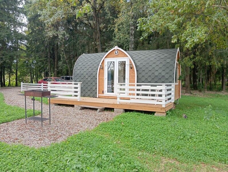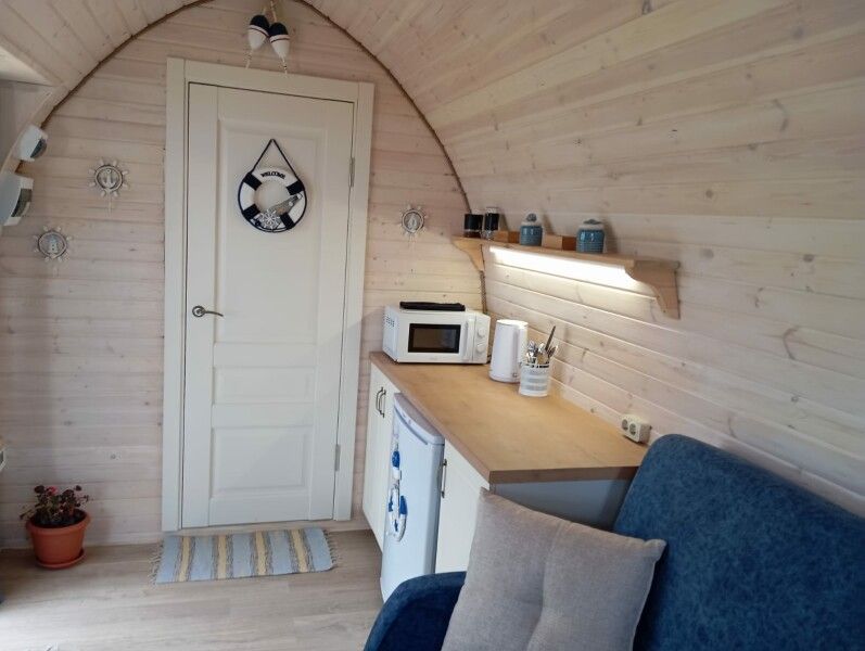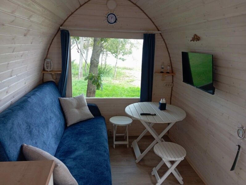 Одноэтажный домик (25 кв.м.) с отдельной спальней и общей кухней-гостиной. Рассчитан на комфортное проживание не более 3х взрослых или семью с детьми.