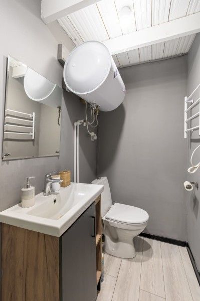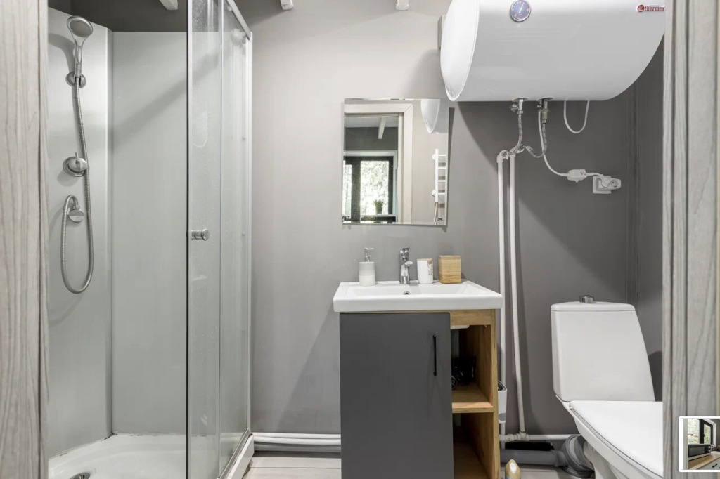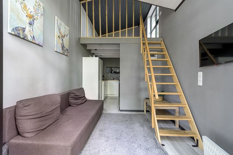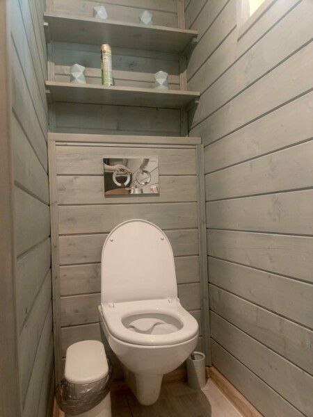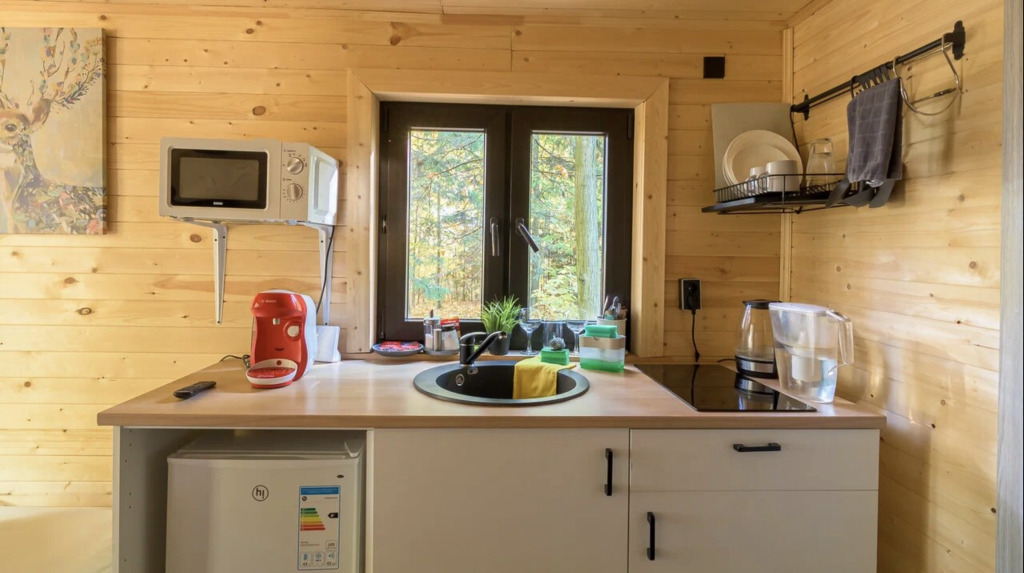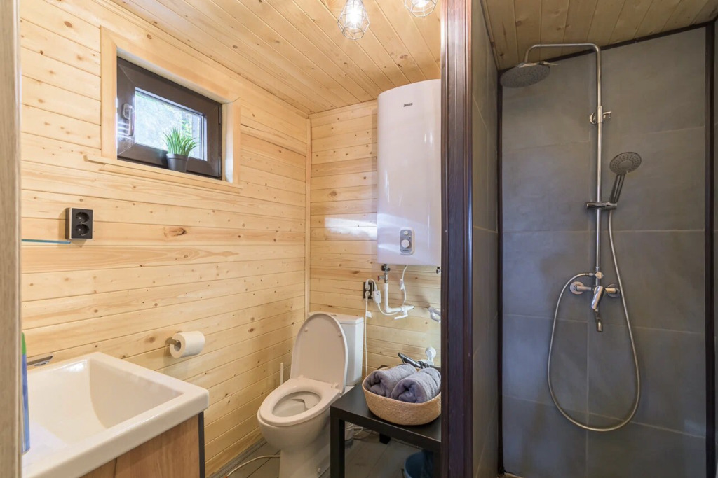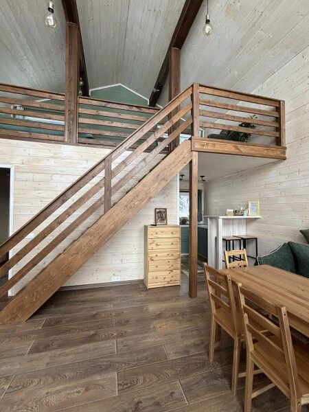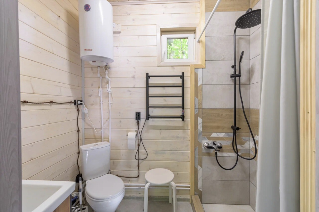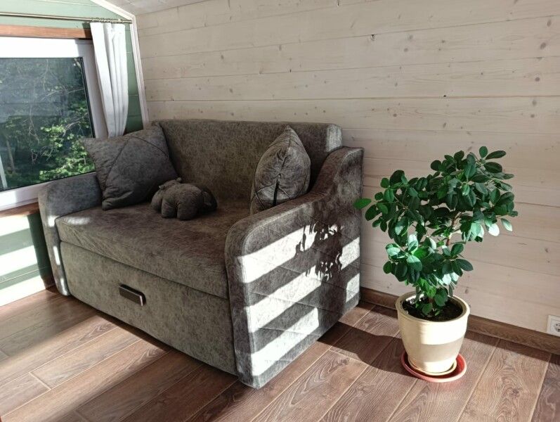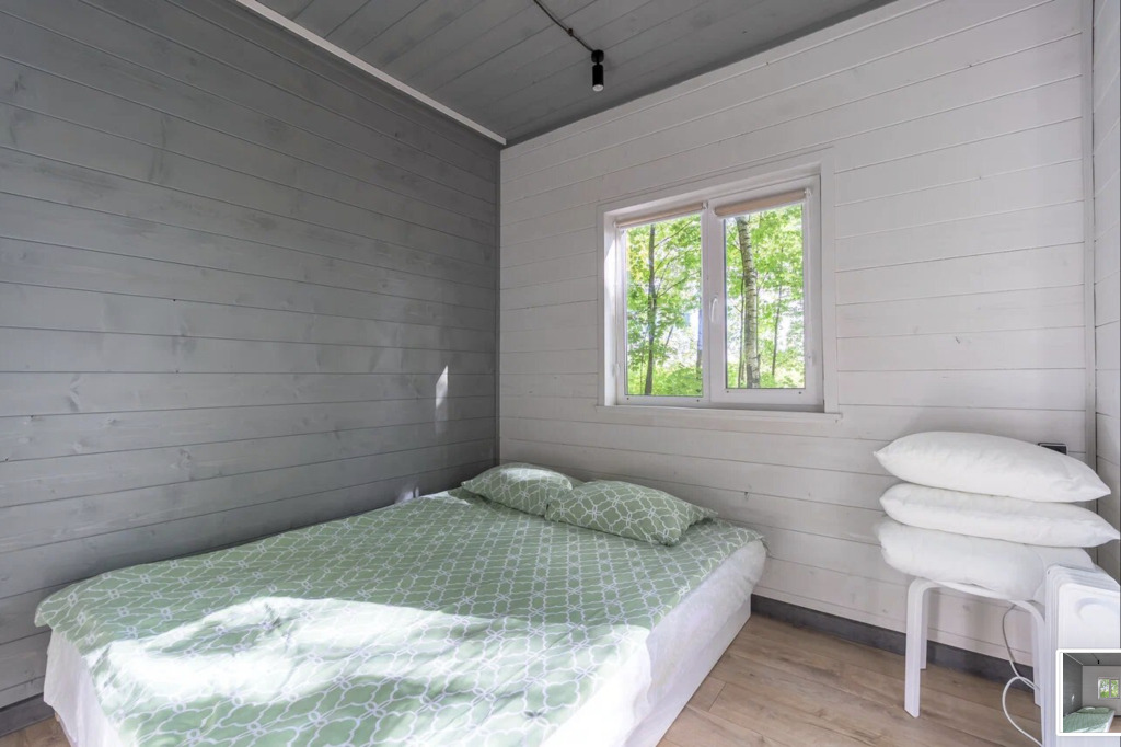 Очень комфортный двухэтажный дом (более 32 кв.м.) с панорамными окнами и «вторым светом». В доме теплый пол. Здесь удобно разместиться всей семьей даже с ребенком или компанией друзей.