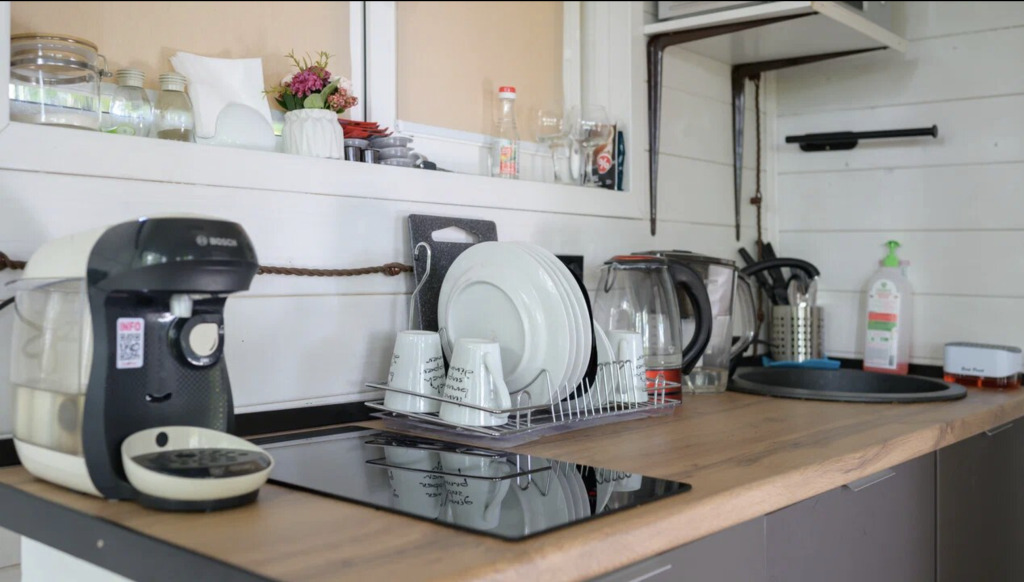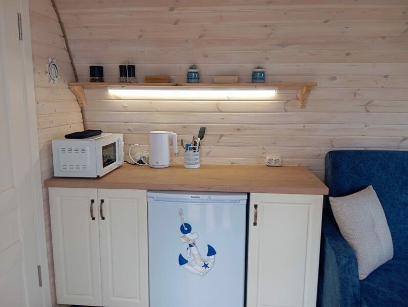 Двухместный Домик у воды. Рассчитан на двух гостей, в домике микроволновка, чайник, посуда, холодильник, сан узел, душевая кабина.