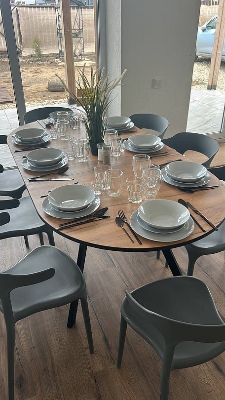 На огороженном участке предусмотрены парковка на три автомобиля, гриль-зона с мангалом, шампурами и решеткой для гриля, банный чан и просторный дом площадью 147 м², в котором расположены три изолированные спальни и большая терраса с уличной мебелью. Дом построен с использованием современных энергоэффективных технологий из теплобетона, что обеспечивает отличную звукоизоляцию и помогает сохранять тепло.