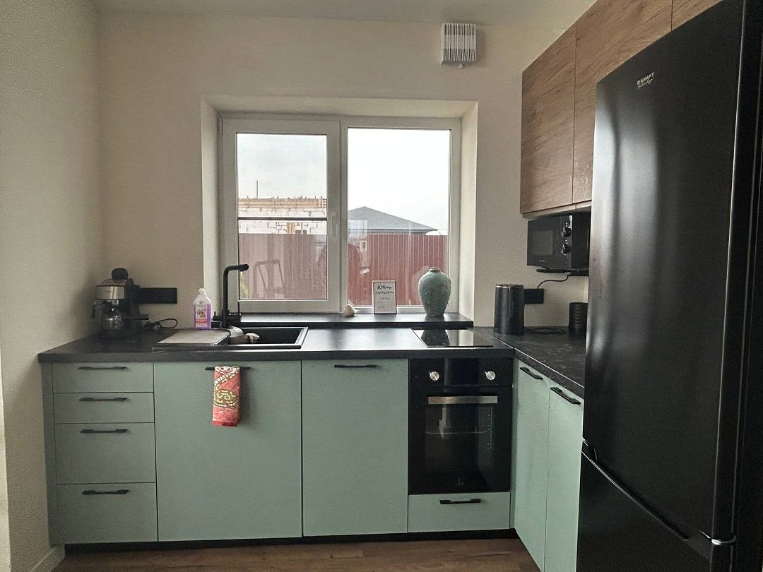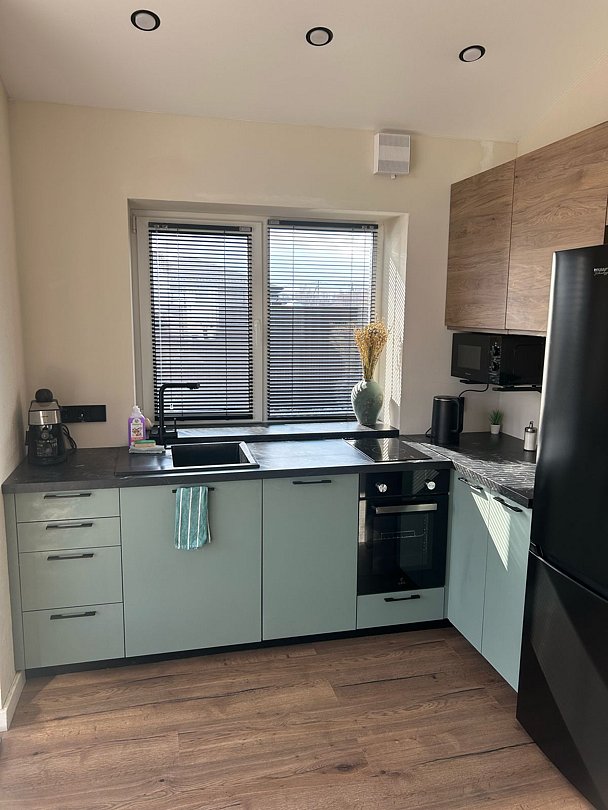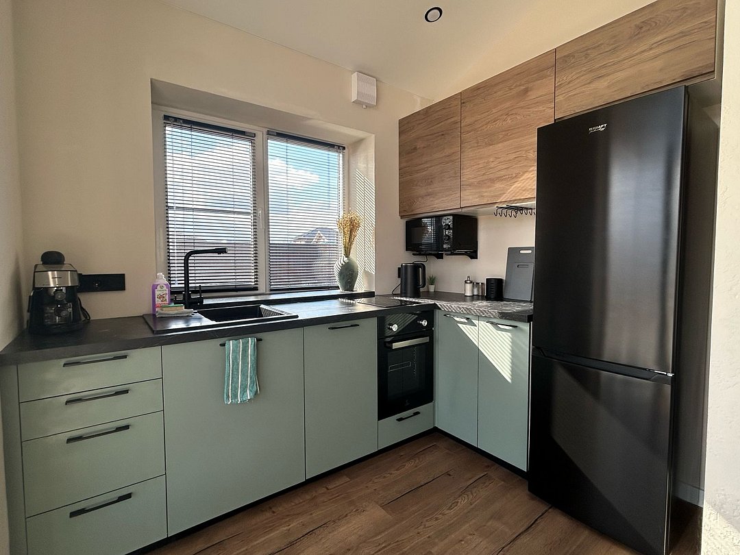 - полноценная кухня, полностью укомплектованная посудой и техникой: холодильник, варочная панель, духовка, посудомойка, СВЧ, кофеварка и чайник;