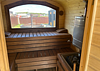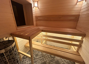 Сауна прогревается примерно за 40 мин. Рекомендуемое время сеанса 3-4 часа. При желании, на разогретые камни можно подливать горячую воду в разумных пределах.