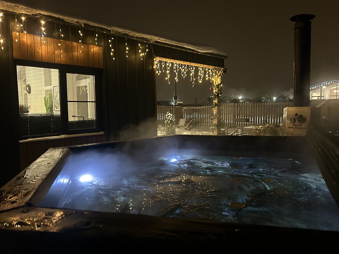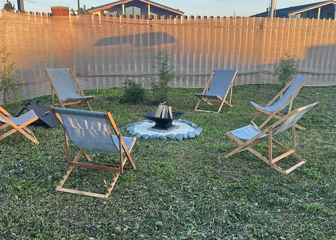 На огороженном участке есть: парковка на 3 машины, гриль-зона с мангалом, шампурами и решеткой для гриля, банный чан и просторный дом площадью 147 м² с 3-мя изoлиpoвaнными cпaльнями и большой теppacoй с уличной мебелью.