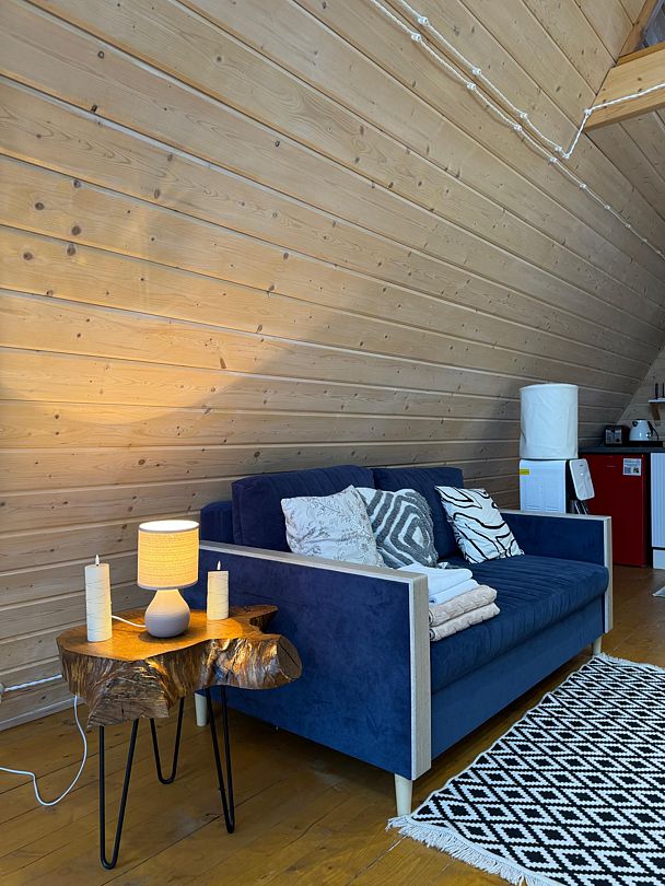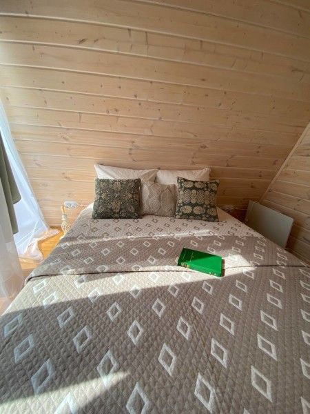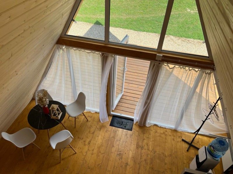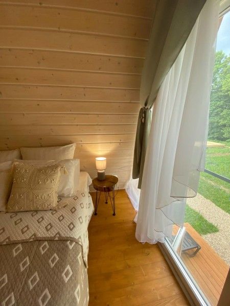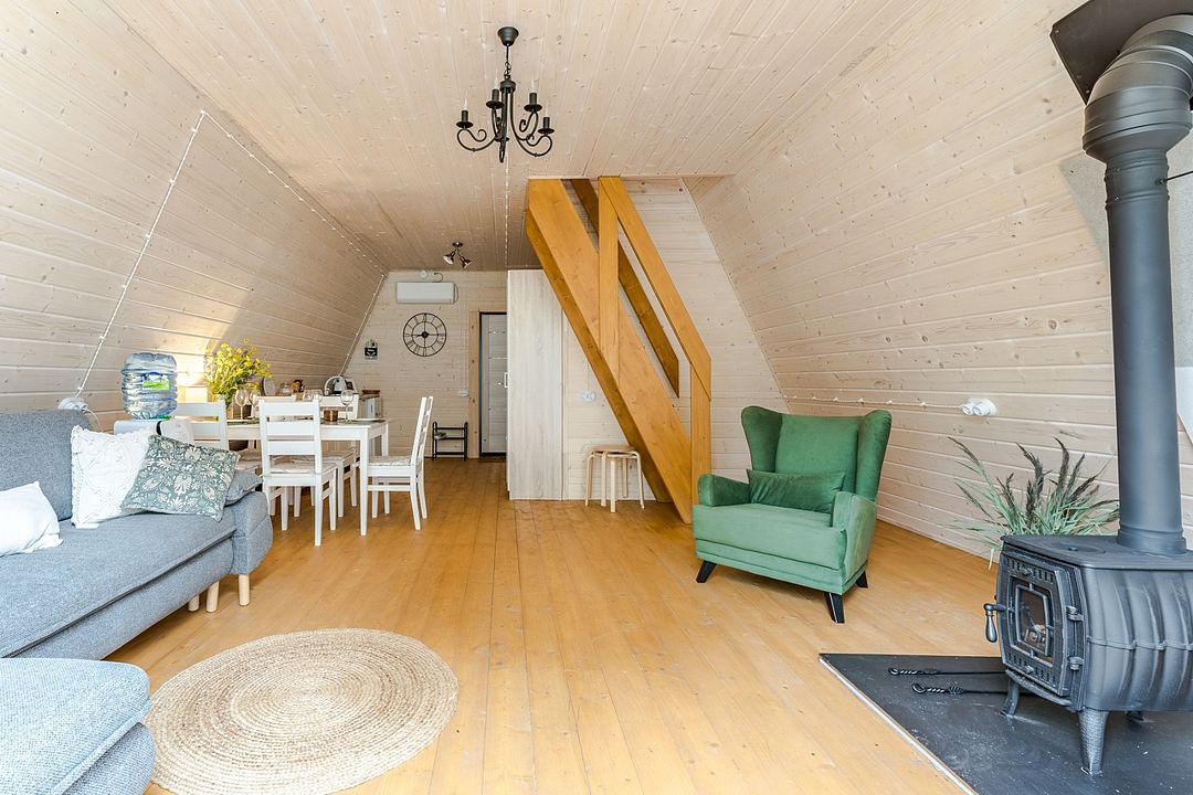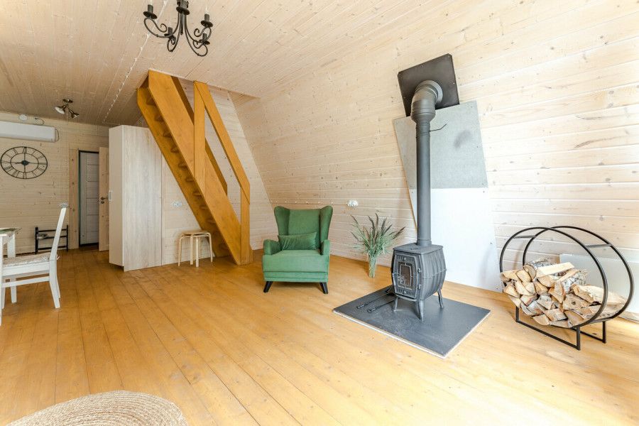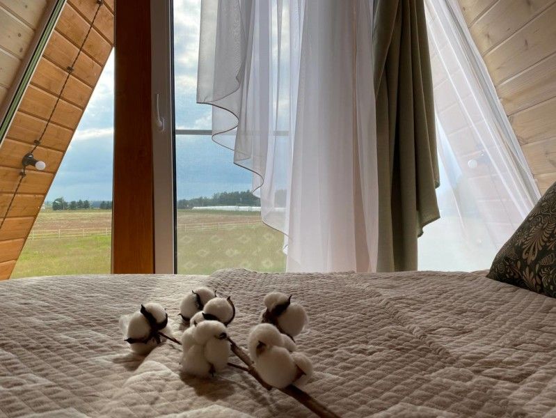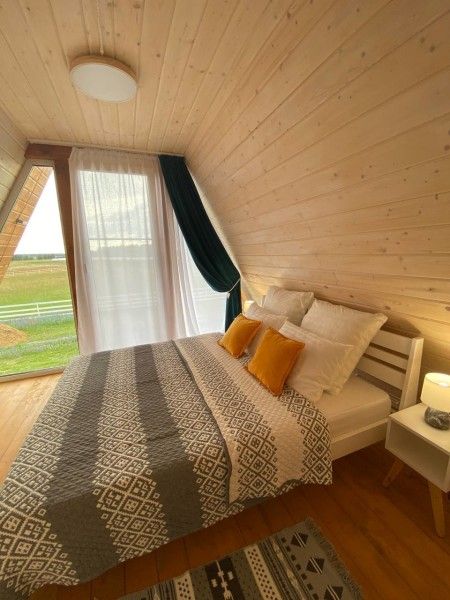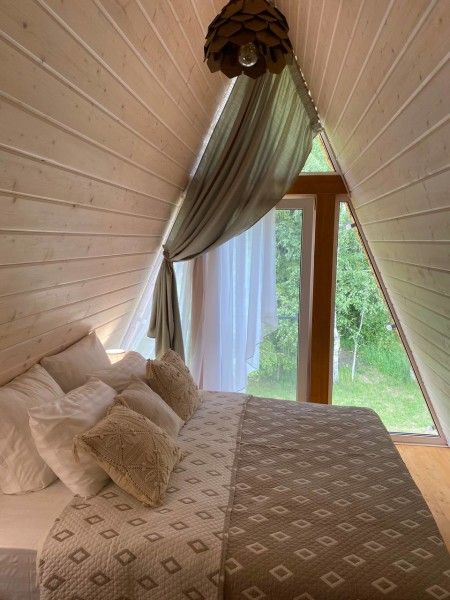 На красивой зеленой территории в 2 Га в окружении бескрайних полей и леса, вблизи реки Озерна и всего в 15 минутах езды до Озернинского водохранилища размещено 5 А-фрейм домов различной вместимости. В каждом из них предусмотрена отдельная костровая зона, терраса с лежаками, беседка и чан для парения под открытым небом.