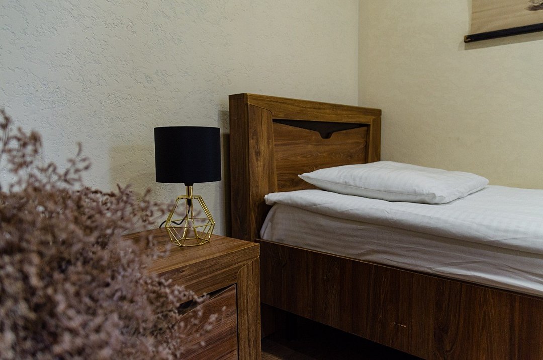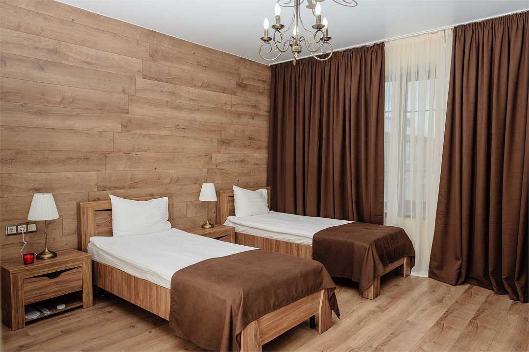 Этот номер немного более просторный, чем двухместный стандарт с двуспальной кроватью, его можно забронировать для проживания двух коллег, друзей или родственников. Помимо кроватей с высокими изголовьями в номере есть вместительный шкаф, две тумбочки для мелочей, стул и письменный стол, зеркало, телевизор, мини бар и сейф. Минеральная вода, набор для чая/кофе, комплект полотенец и душевых принадлежностей – всё рассчитано на двоих. Санузел компактный, но удобный и продуманный до мелочей, установлена современная душевая кабина. Площадь номеров данной категории 23 м2.Услуги и удобства