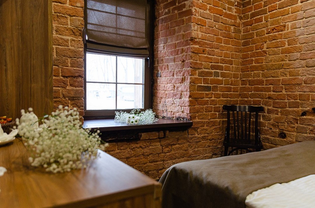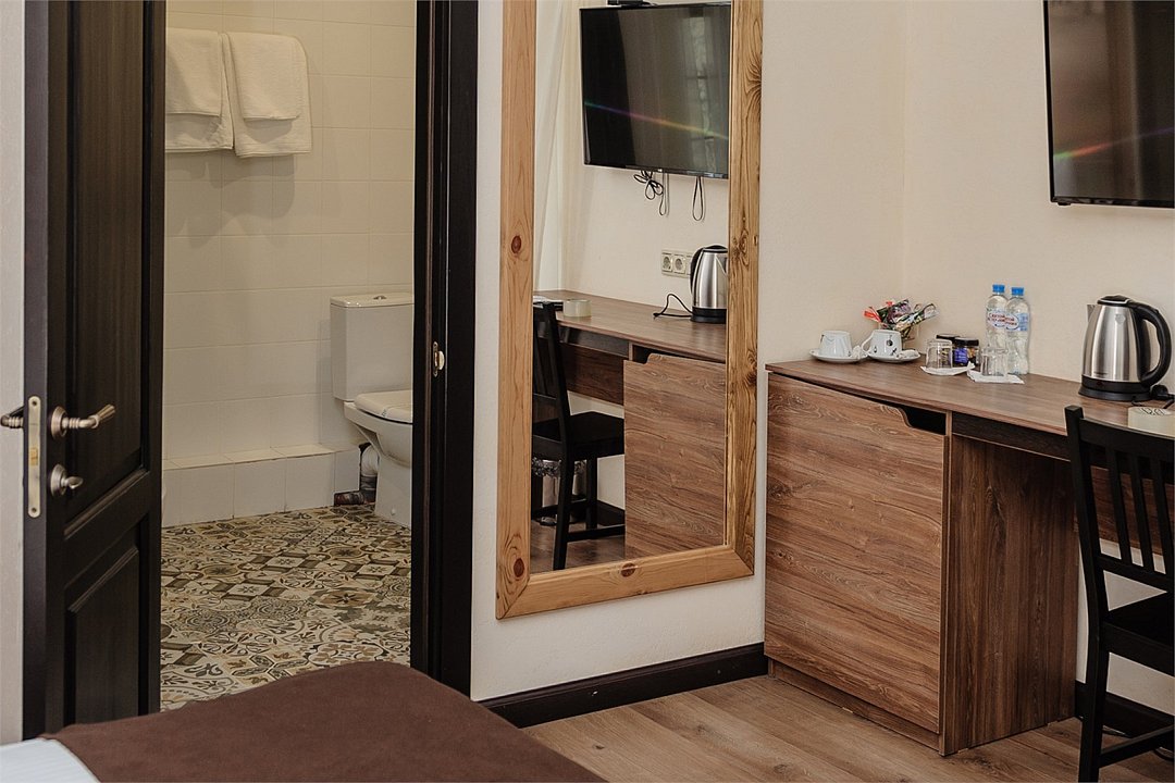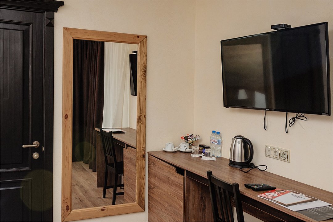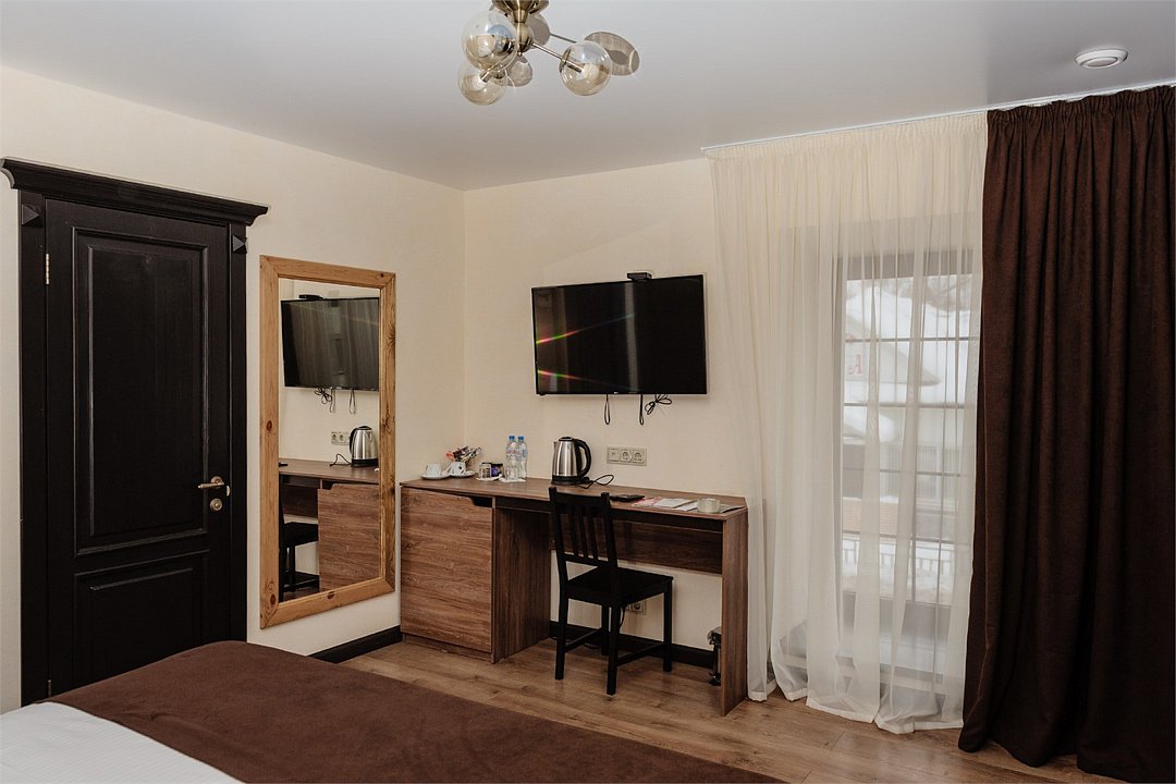 Полулюкс на двоих – это большой и красивый номер, оснащенный всем, что требуется для комфорта. В центре комнаты, оформленной в приятных бежевых тонах, расположена просторная двуспальная кровать с качественным современным матрасом. Постель заправлена приятным на ощупь белоснежным бельём. Помимо этого, в комнате находится вместительный шкаф, прикроватные тумбочки, зеркало, стул и письменный стол, надежный сейф, мини бар и телевизор с плоским экраном. В полулюксе вы найдёте просторный санузел с тумбочкой для косметики и прочих принадлежностей, душевой кабиной и зеркалом. Для каждого гостя нашего мини отеля предоставляются тапочки, полотенца и комплект фирменной косметики для душа на две персоны. Площадь номеров данной категории 30 м2.Услуги и удобства