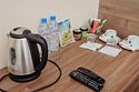 Wi-Fi, кондиционер, светильник, фен, душевая кабина, банные полотенца, тапочки, гигиенические средства, двуспальная кровать, тумбы, стулья, шкаф для одежды, вешалки, письменный стол, зеркало, чайный набор, чайник, унитаз, раковина, отопление, вид на город, кулер на этаже, стаканы, стол, туалетные средства, цифровое тв, телевизор с плоским экраном, мини-холодильник, без окнаВ гостиничном номере