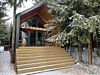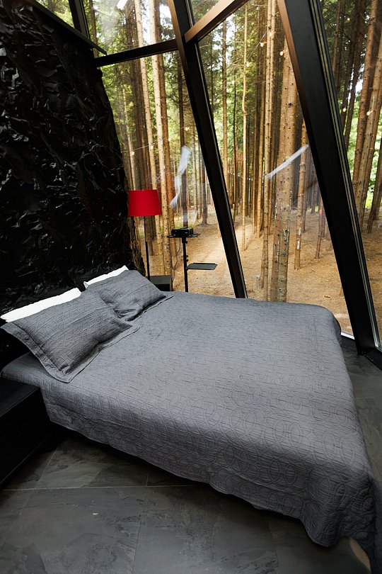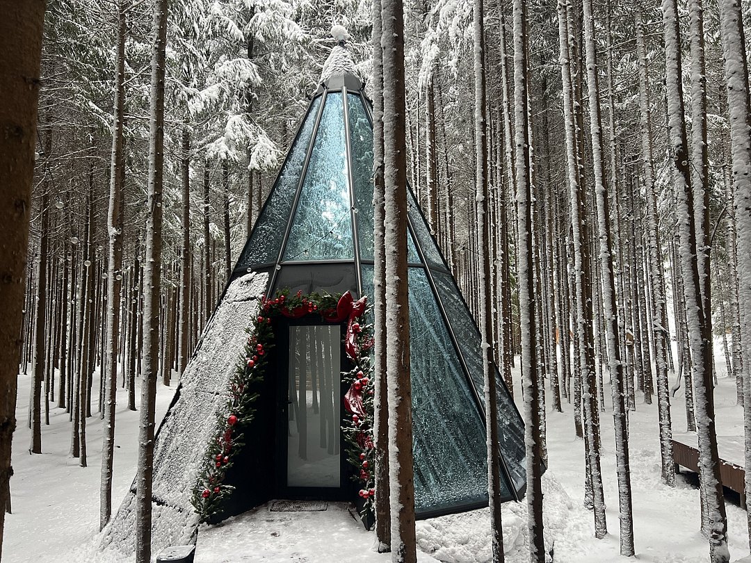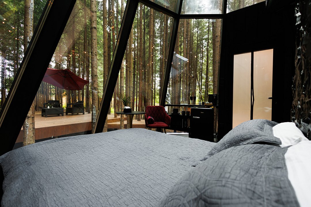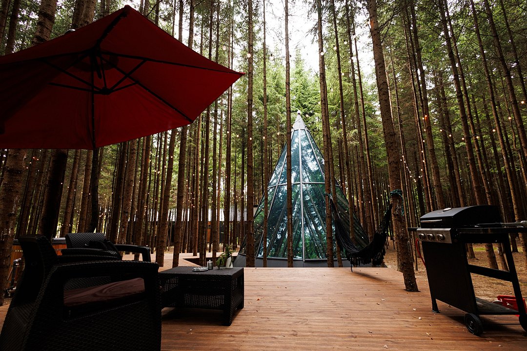 Атмосфера этого дома помогает раскрыть самые потаенные уголки вашей личности. Максимально погружает в состояние единения с энергией леса. Необычная форма пирамиды из стекла и металла.