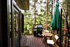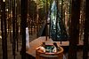 Романтический ужин на террасе с видом на хвойный лес.