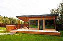 Удобная территория дома Путешественник комфортно вмещает 3-5 пар с несколькими детьми. Основной отдых проходит в доме, на открытой террасе в хорошую погоду или на закрытой террасе бани в дождливую погоду.