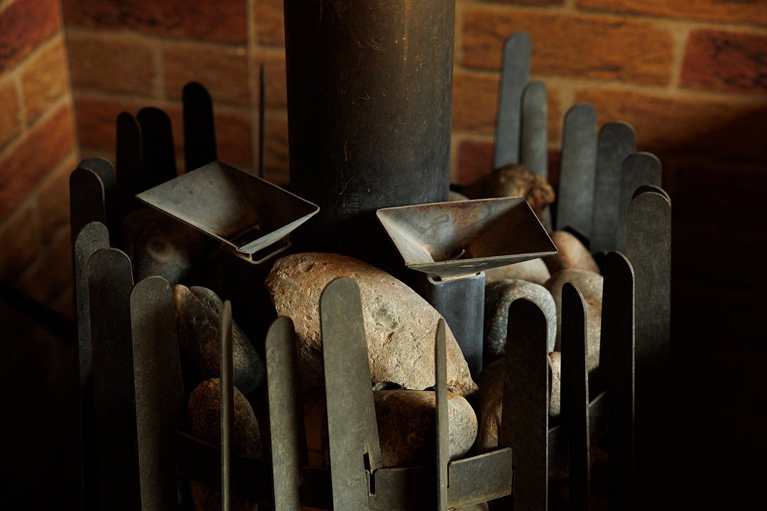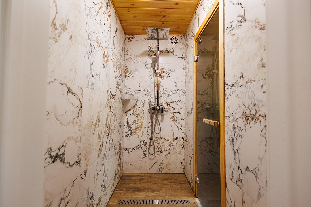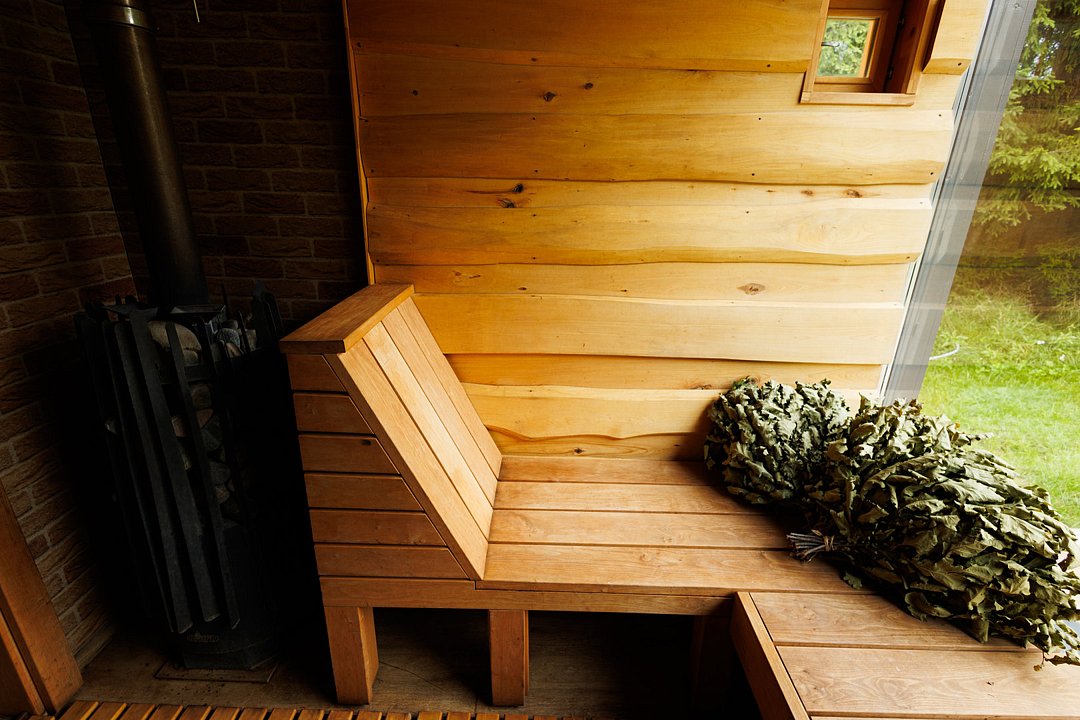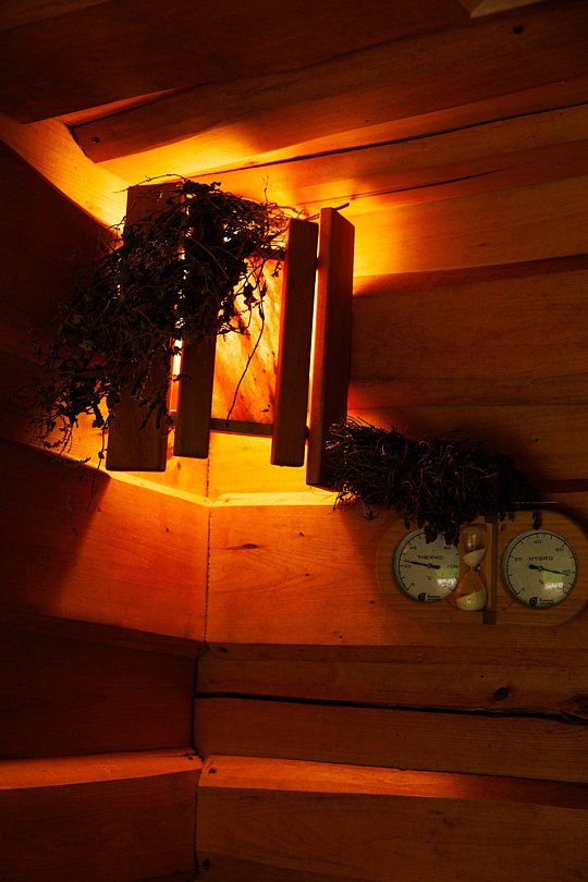 Панорамное окно в парной. Контраст температур — горячая и холодная купель, снег зимой. Травы, веники и матрас из сена. Массажный стол и профессиональный массаж. Банные церемонии от пармастеров.