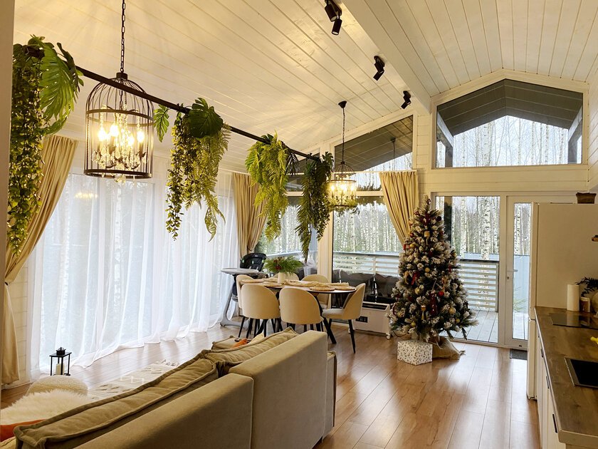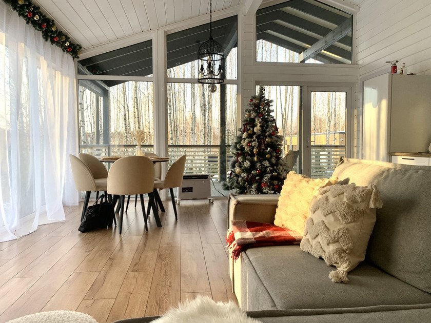 Просторная кухня-гостиная с панорамным остеклением, 3 уютные спальни и терраса с удобной мебелью создают атмосферу уюта и комфорта. Насладитесь просмотром любимых фильмов на огромном 150-дюймовом экране пректора. Система очистки воды Барьер с 5 ступенями очистки обеспечит вас чистой питьевой водой, а кондиционер – комфортной температурой в любое время года. Кухня полностью оборудована современной техникой, включая холодильник, микроволновую печь, варочную панель и посудомоечную машину.