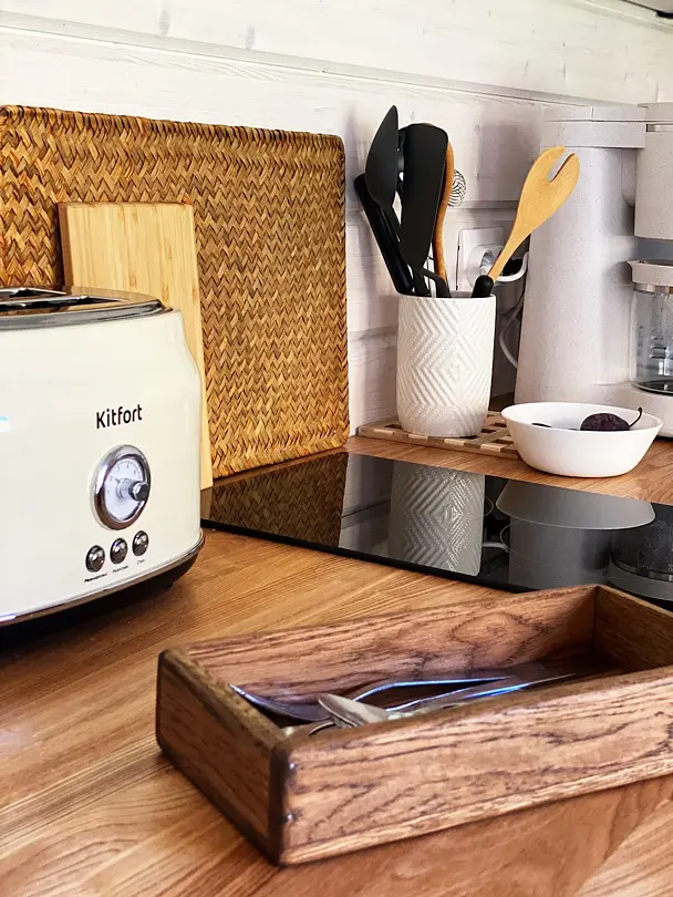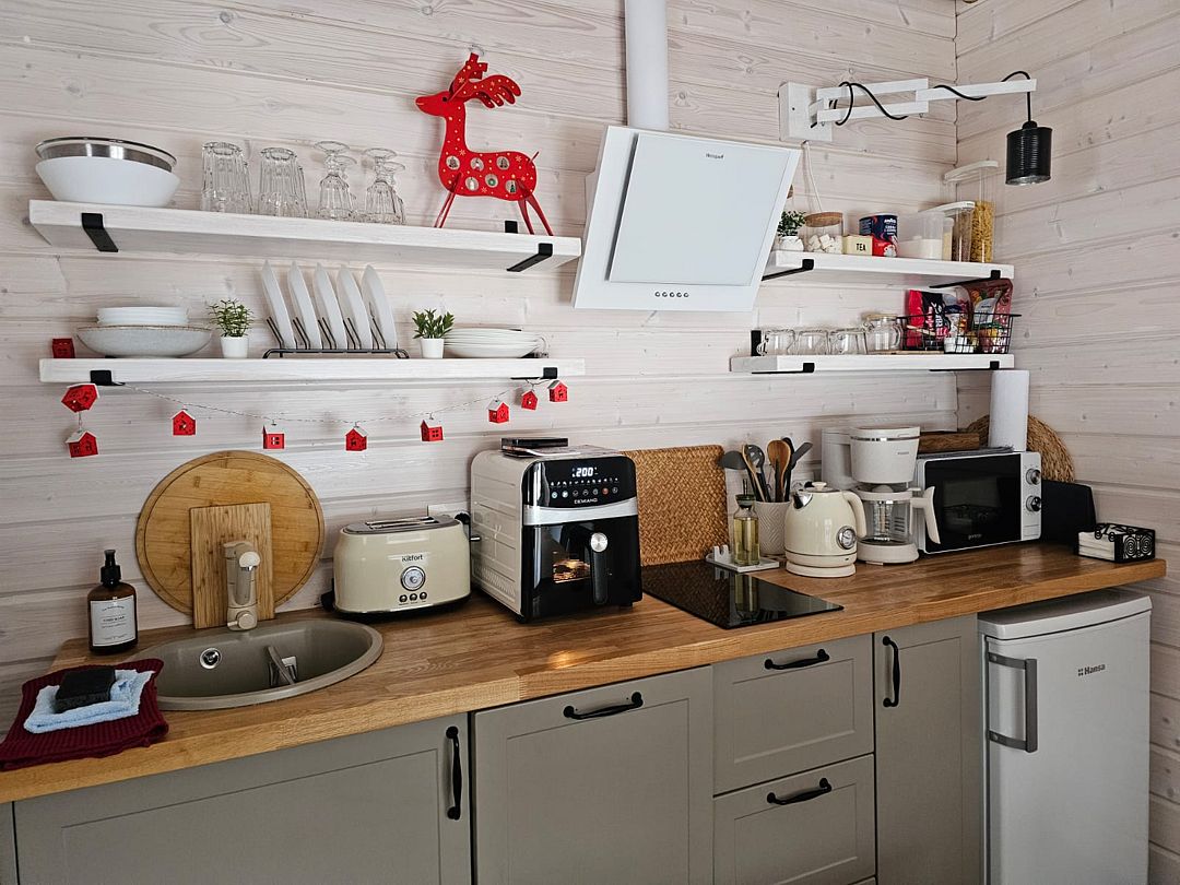 тостер, капельная кофеварка, посудомоечная машина, кастрюли, сковороды, ножи, посуда и столовые приборы, крупы, макароны, чай, кофе, соль, сахар, специи, масло, средства от комаров, зарядка для телефона, игры и книги, зонт и дождевики (лето и осень), пледы, отпариватель, тапочки, зубные щетки, аптечка, фонарик, колонка Алиса, аэрогриль.