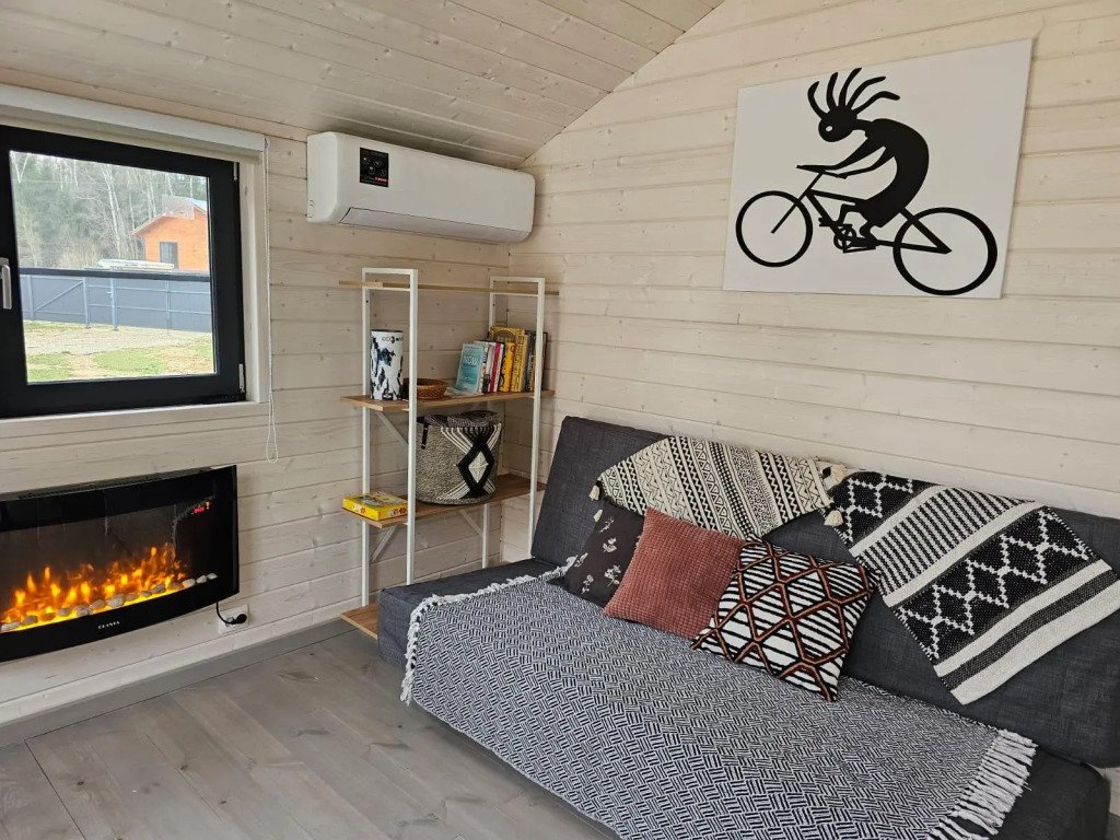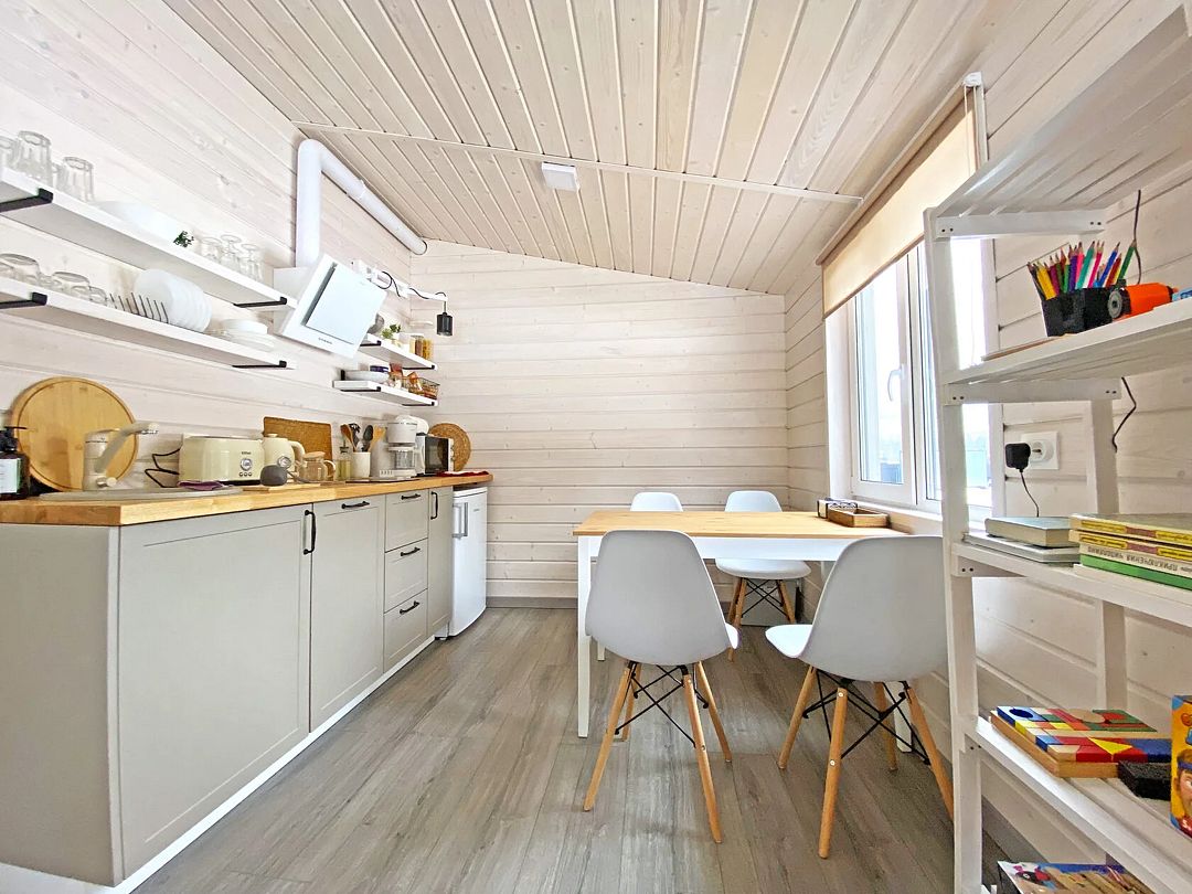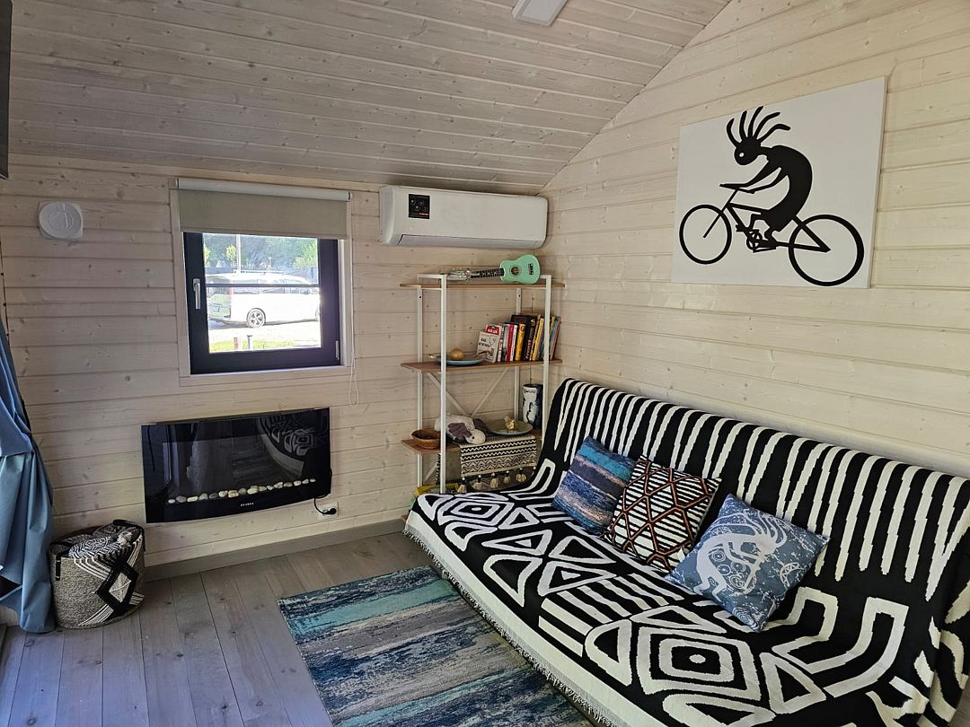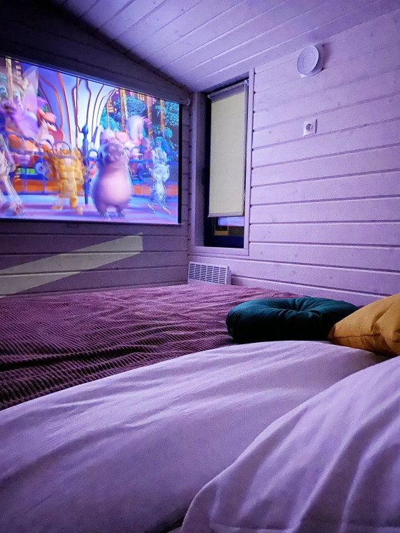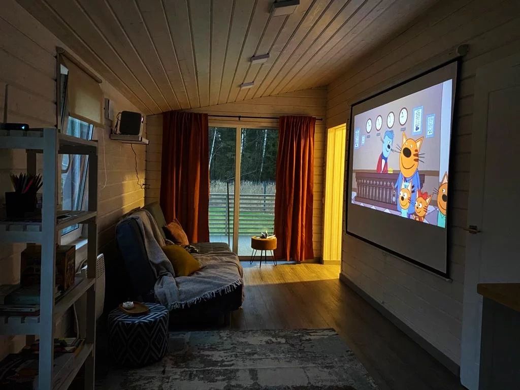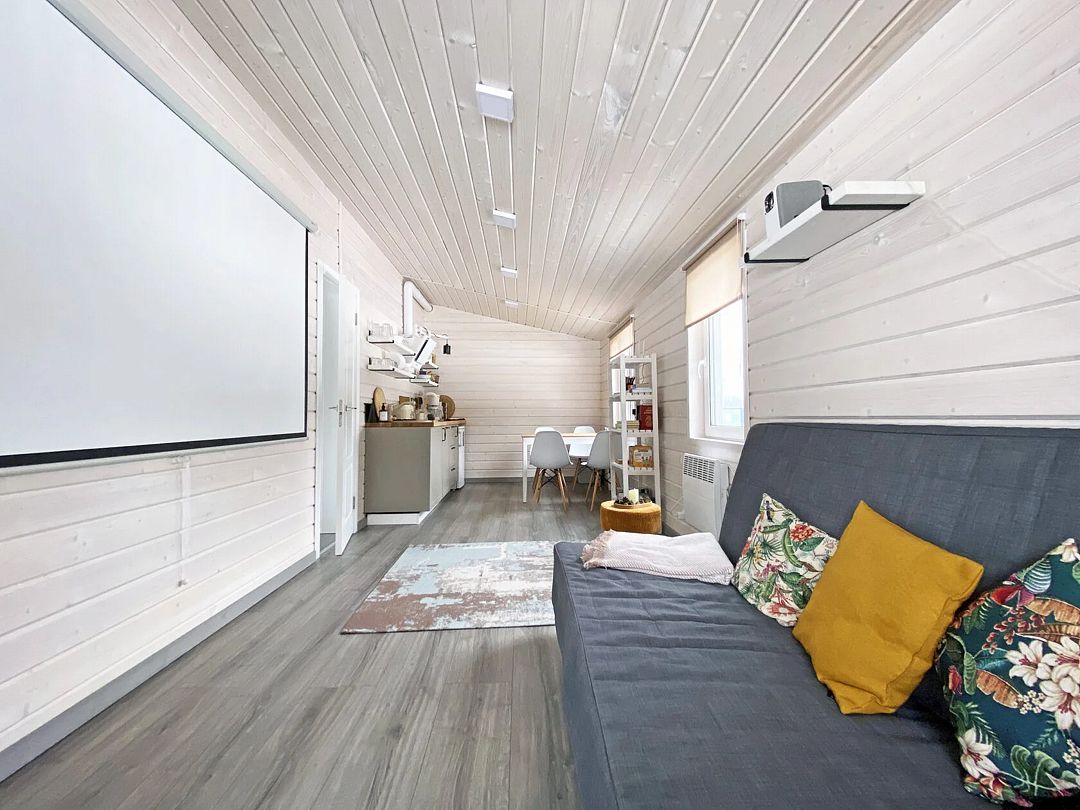 Дом с кухней-гостиной и одной спальней. Есть прихожая. Много места для хранения вещей. Проектор в гостиной.