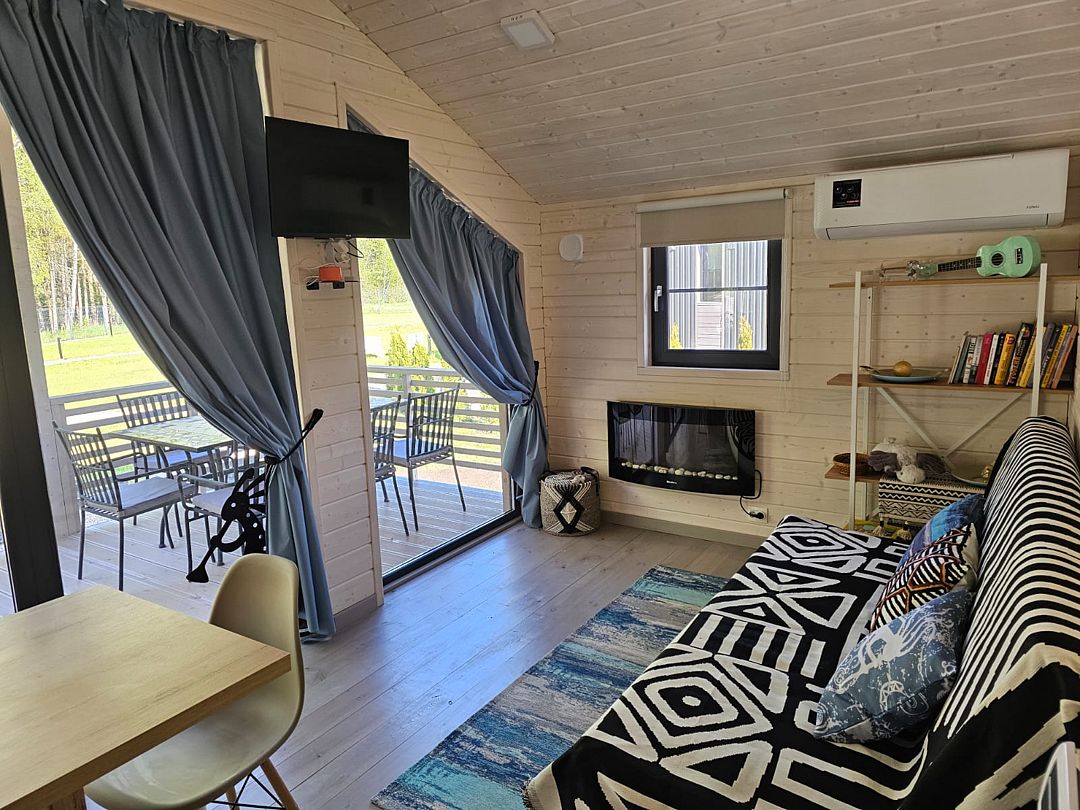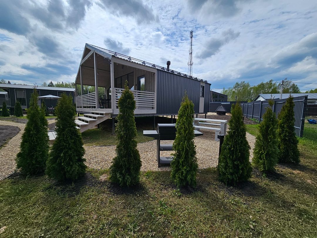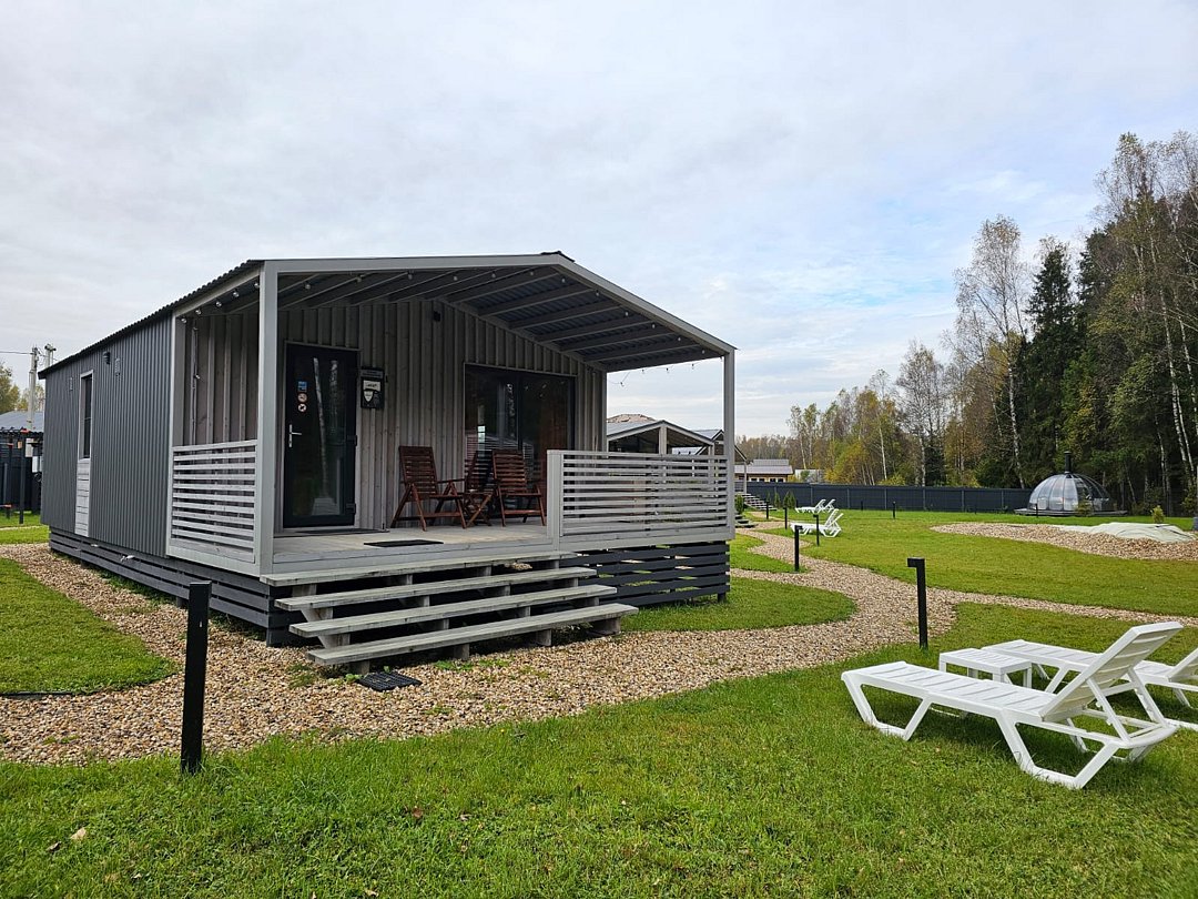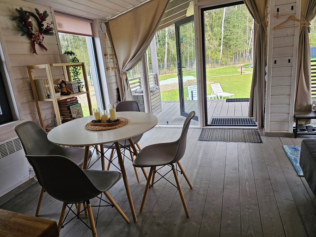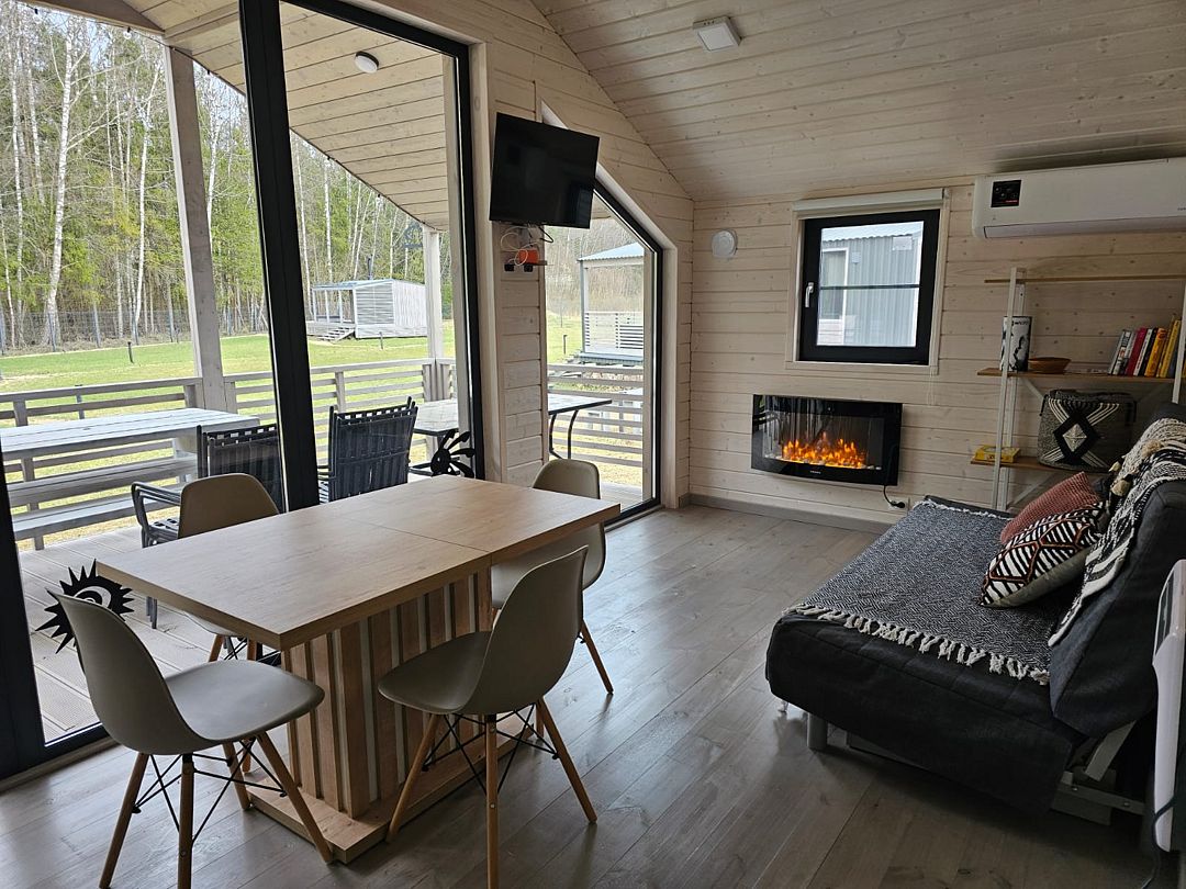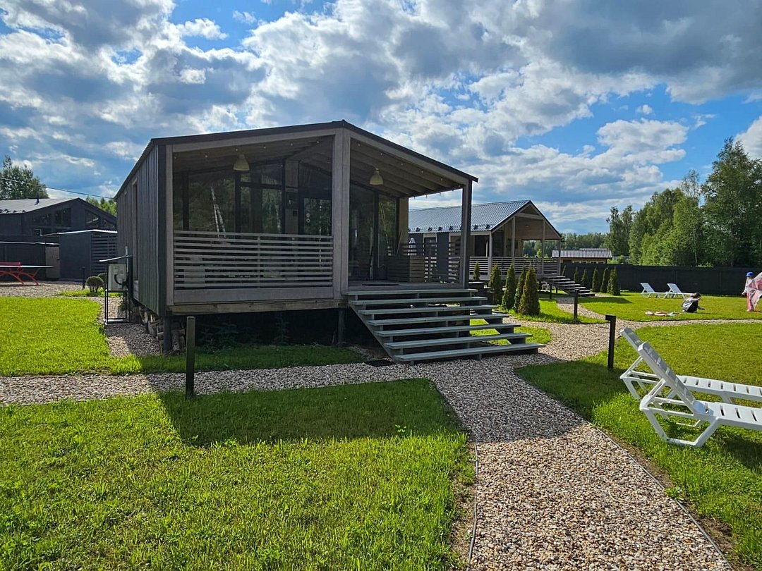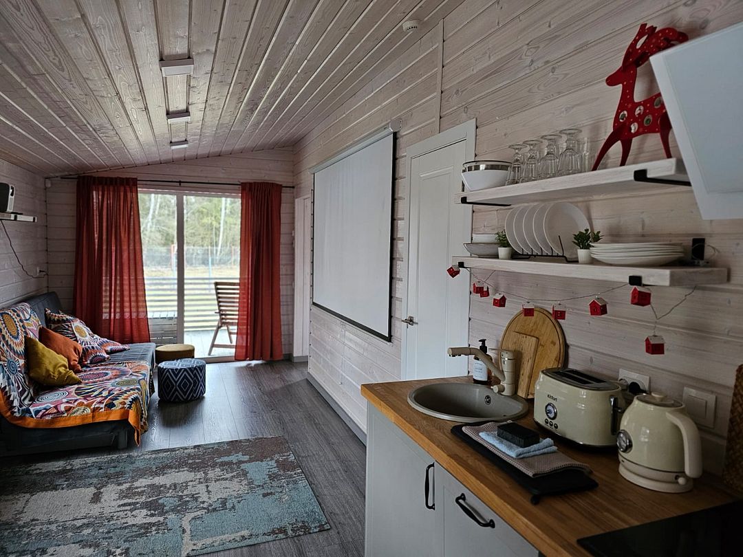 Дом с кухней-гостиной и одной спальней, панорамное остекление, проектор в спальне, двуспальная кровать queen-size 160х200 см в спальне, раскладывающийся диван 160х200 см в гостиной, детская кроватка-манеж (доп. услуга, по запросу), стульчик для кормления (бесплатно, по запросу), санузел с душевой кабиной,
