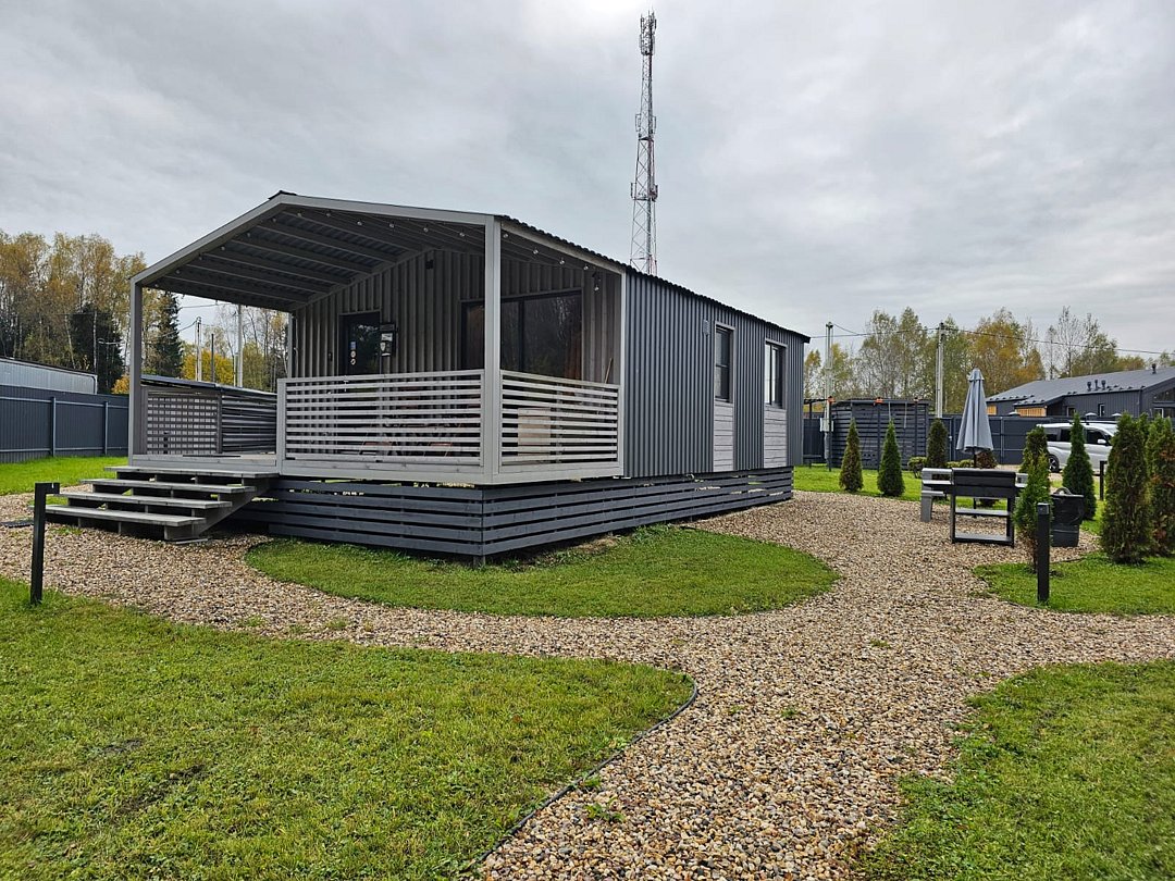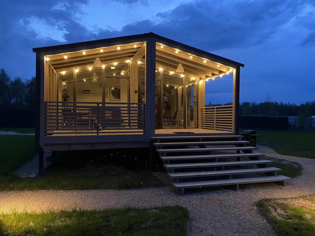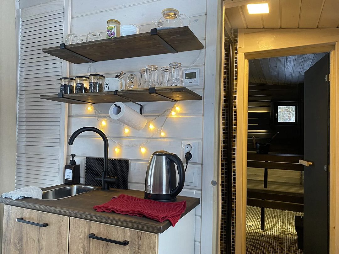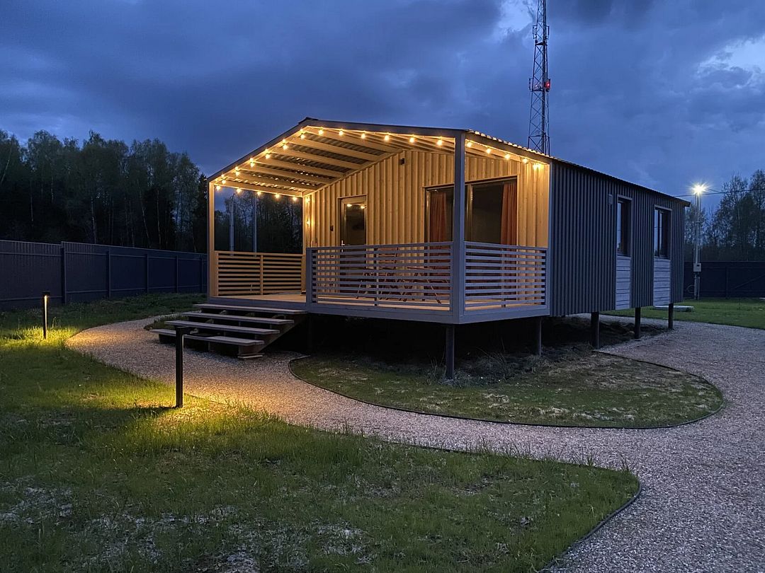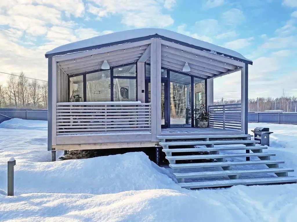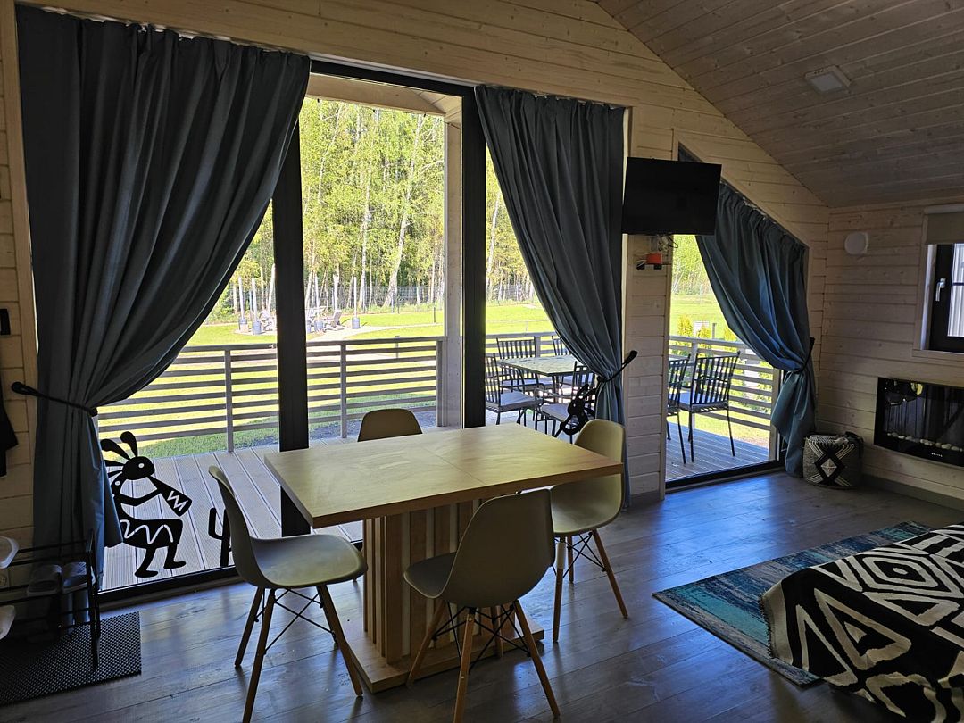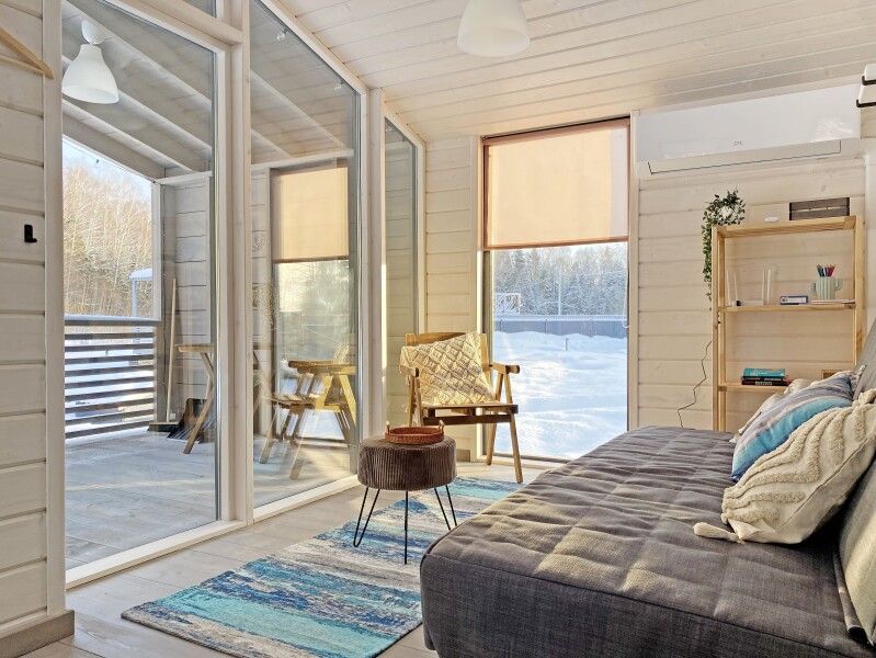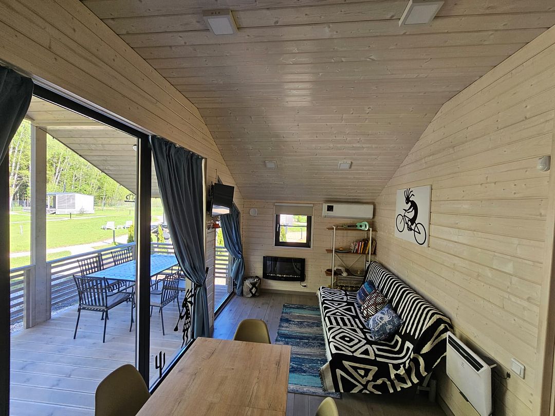 Дом с кухней-гостиной и одной спальней, панорамное остекление, проектор в спальне, двуспальная кровать queen-size 160х200 см в спальне, раскладывающийся диван 160х200 см в гостиной, детская кроватка-манеж (доп. услуга, по запросу), стульчик для кормления (бесплатно, по запросу), санузел с душевой кабиной,
