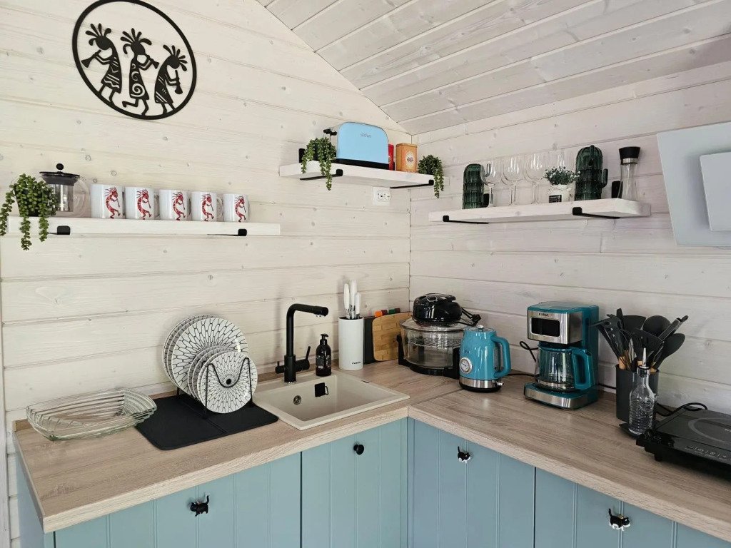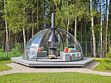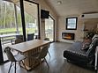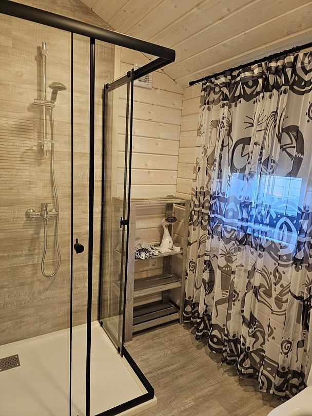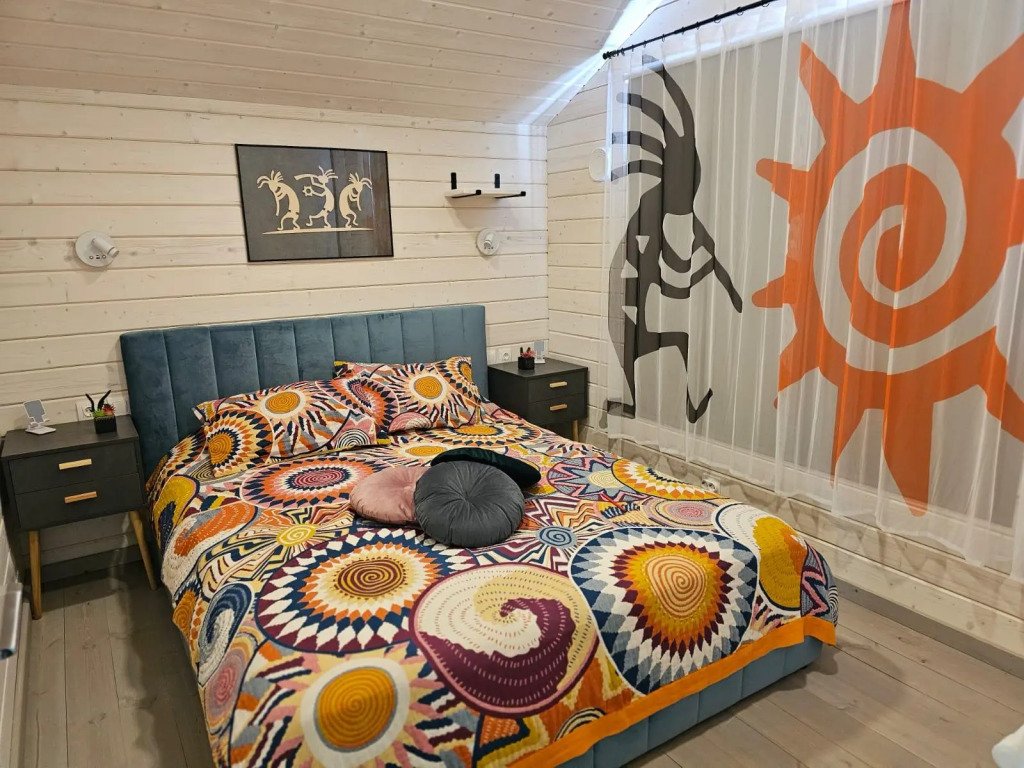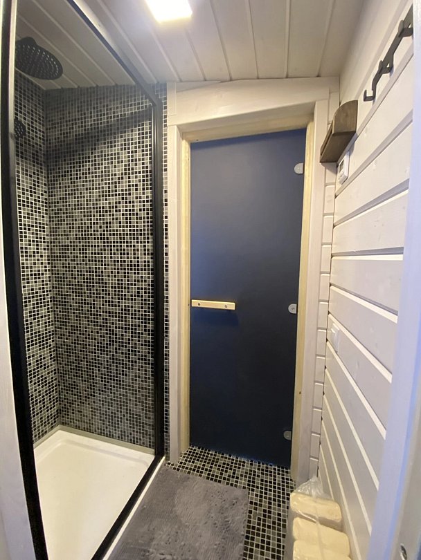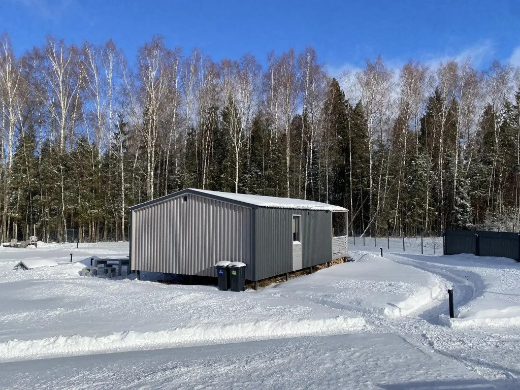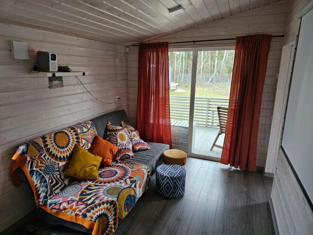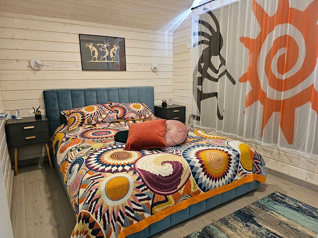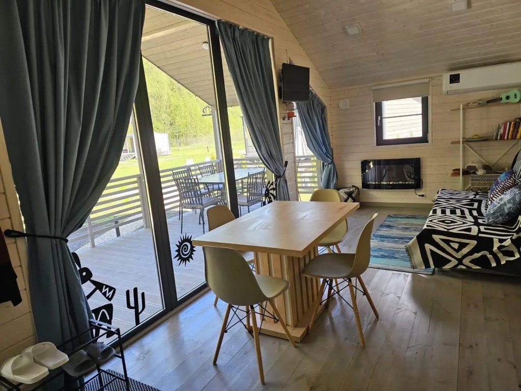 Дом с кухней-гостиной и одной спальней, панорамное остекление, проектор в спальне, двуспальная кровать queen-size 160х200 см в спальне, раскладывающийся диван 160х200 см в гостиной, детская кроватка-манеж (доп. услуга, по запросу), стульчик для кормления (бесплатно, по запросу), санузел с душевой кабиной,
