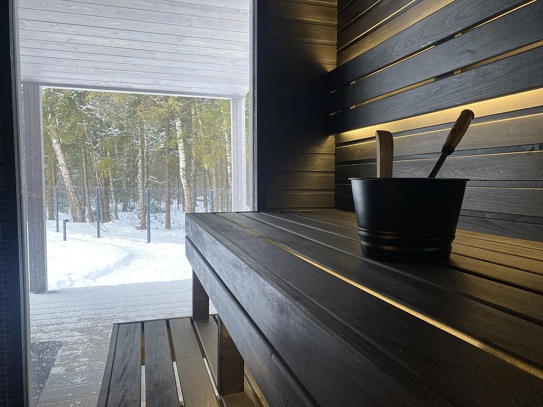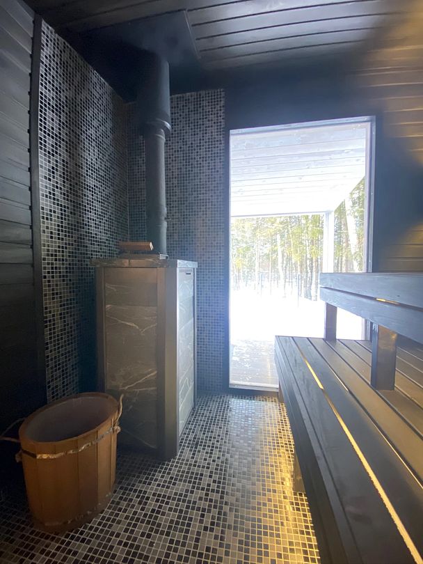 А для истинного расслабления — баня с панорамными окнами, стильной темной парной, каменкой и печью из натурального камня, обеспечивающей мягкий пар,а также круглогодично работающий фурако с гидромассажем и хромотерапией.