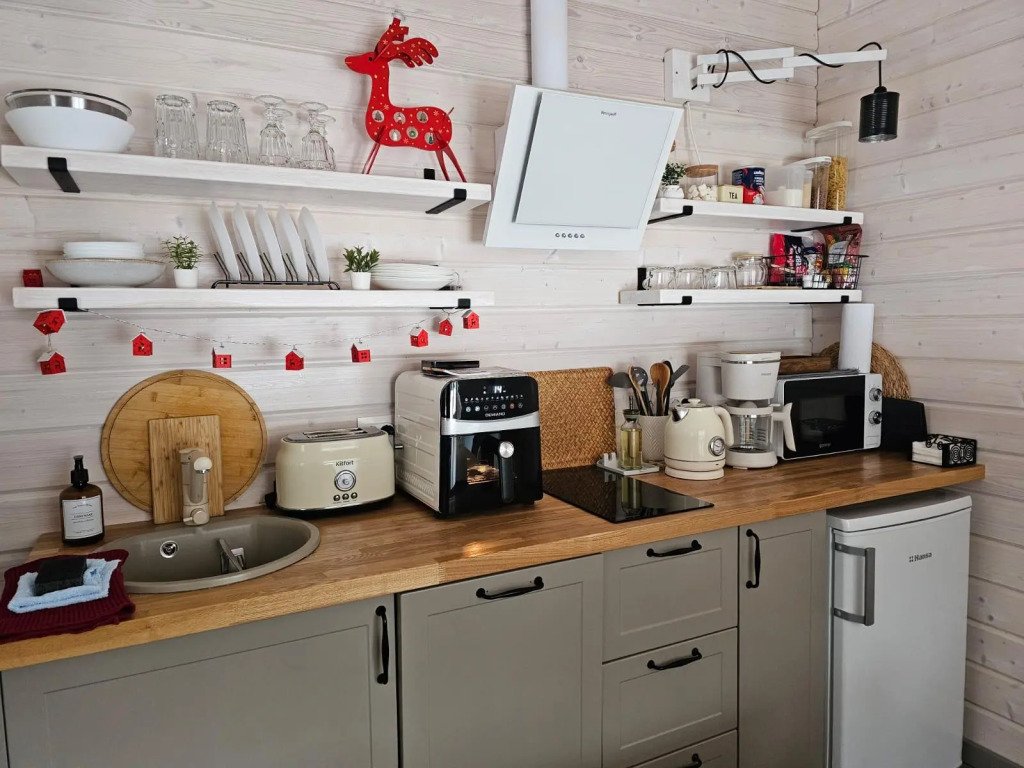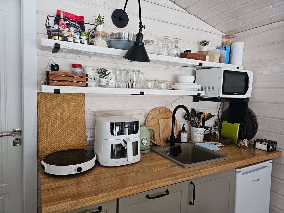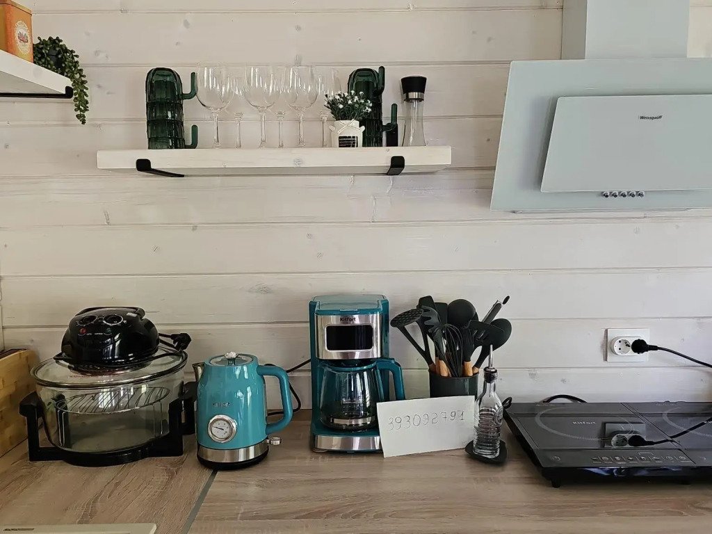 электрические обогреватели, кондиционер, фильтр для воды, индукционная плита на 1 конфорку, микроволновка, холодильник, электрический чайник, капсульная кофемашина Nespresso, посудомоечная машина, кастрюли, сковороды, ножи, посуда и столовые приборы, крупы, макароны, чай, кофе, соль, сахар, специи, масло, средства от комаров, зарядка для телефона, игры и книги,