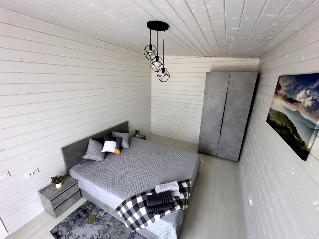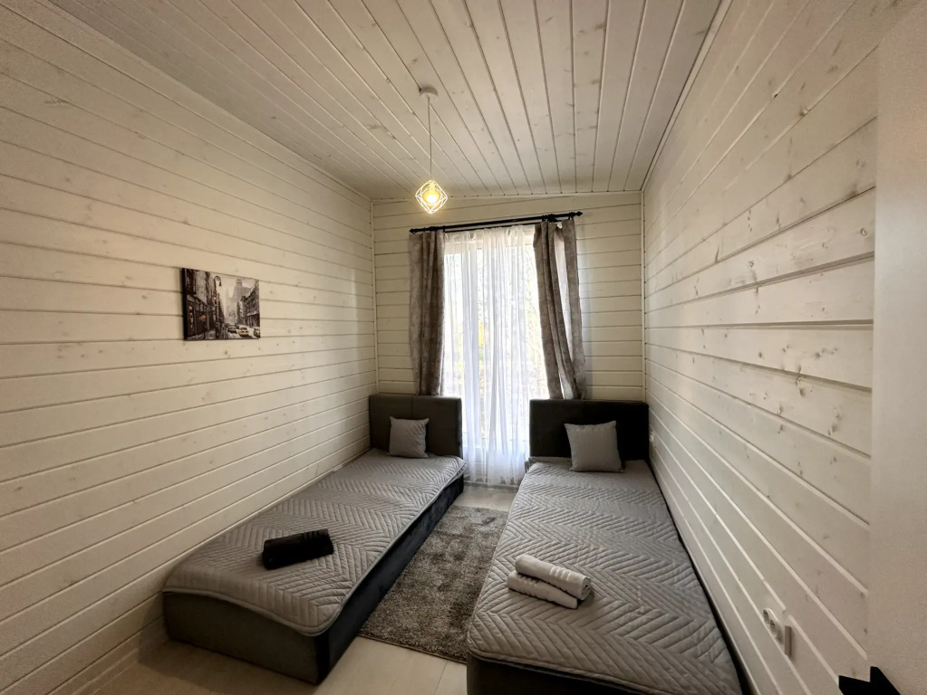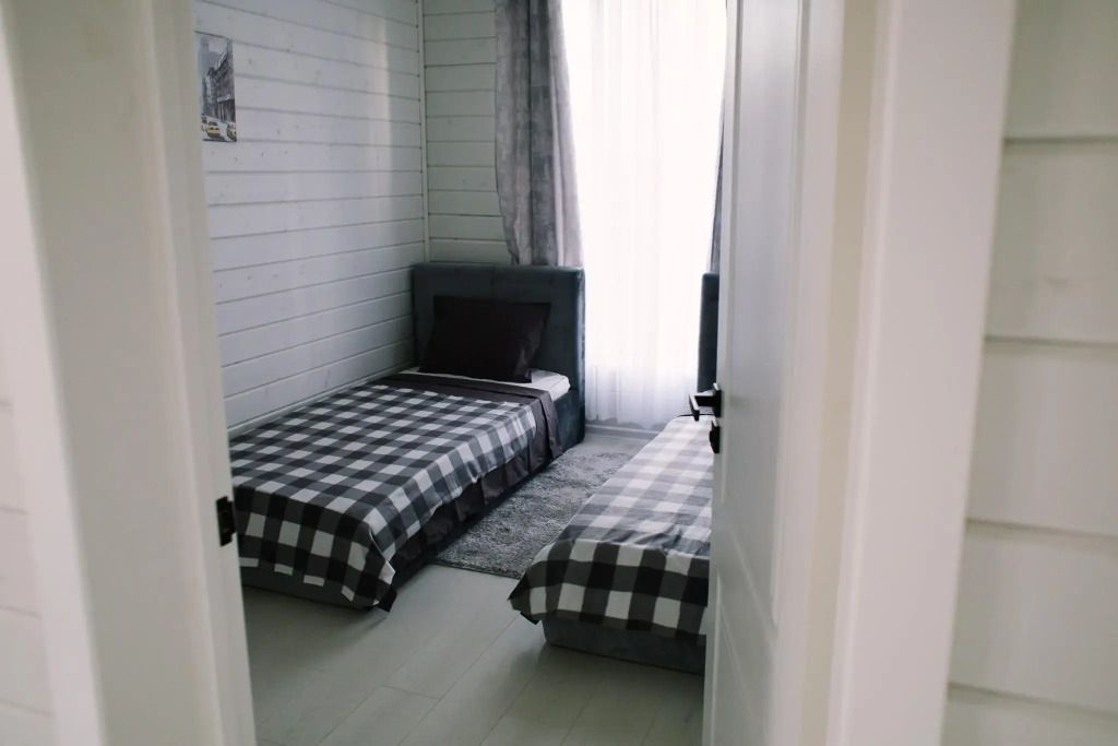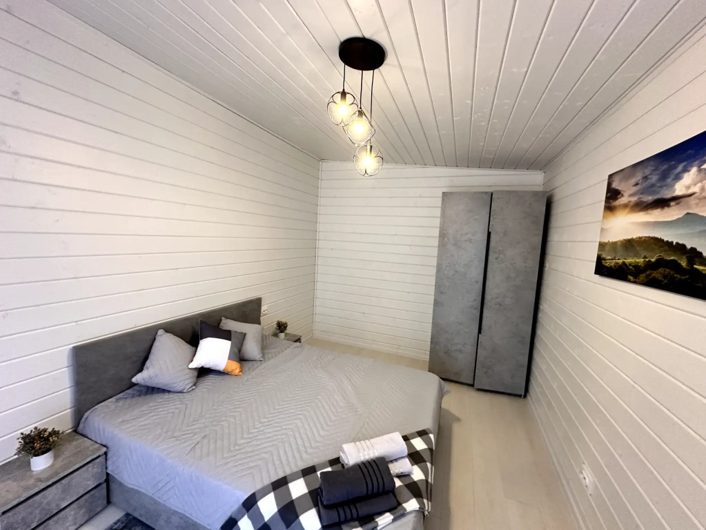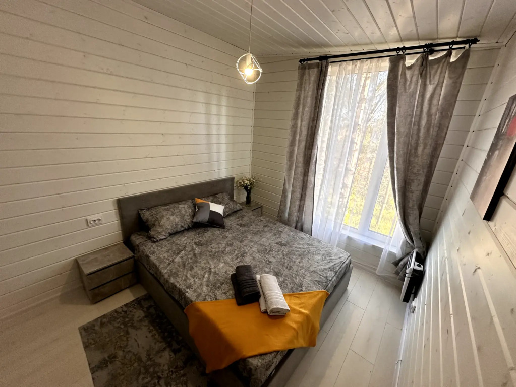 Просторный дом в коттеджном поселке рядом с Истринским водохранилищем и лесом. С 3-мя спальнями, террасой и просторной гостиной-кухней, до 8 спальных мест с финской сауной.
