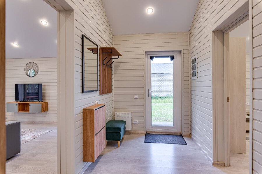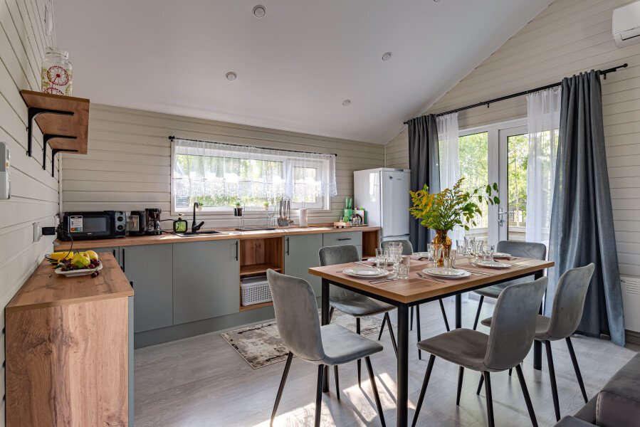 Дом полностью готов к комфортному проживанию. В нем есть две спальни: в одной установлена двуспальная кровать, а в другой — две односпальные. Для удобства предусмотрен кондиционер, а также полный набор косметических средств и банных принадлежностей, включая полотенца и тапочки. Кухня оснащена современной бытовой техникой: холодильником с морозильной камерой, плитой, кофемашиной, электрическим чайником и чайным набором, а также посудомоечной машиной.