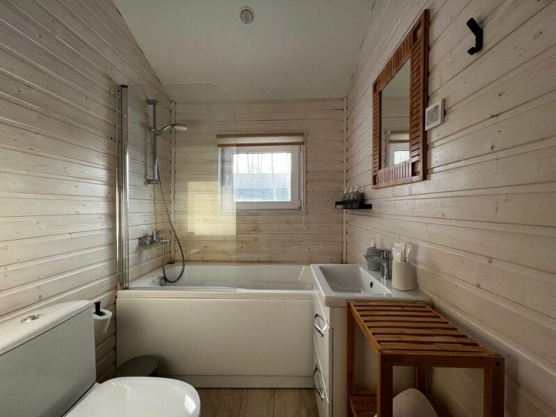 Внутреннее пространство включает в себя уютные спальные комнаты, оборудованные двуспальными и односпальными кроватями с ортопедическими матрасами и белоснежным постельным бельем. Гостиная отличается просторными размерами и оснащена двумя раскладными диванами, кондиционером, телевизором и Wi-Fi, что создает атмосферу домашнего уюта. Полностью укомплектованная кухня предоставляет возможность для кулинарных экспериментов. Веранда служит идеальным местом для утреннего кофе.