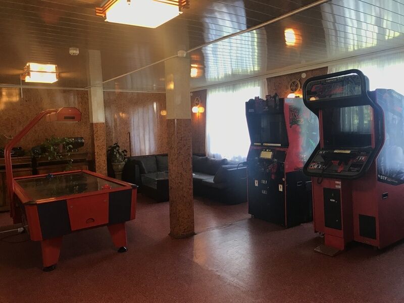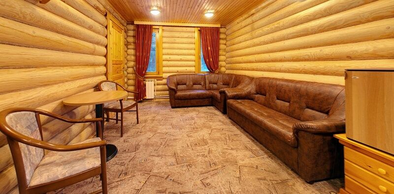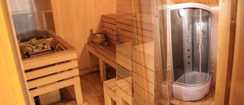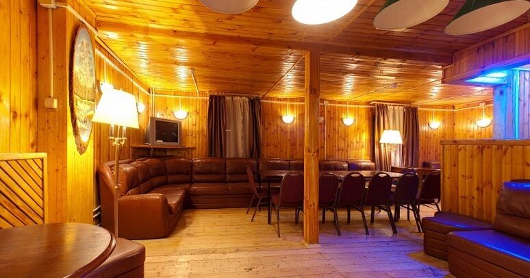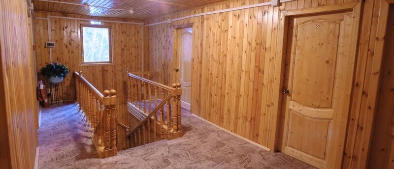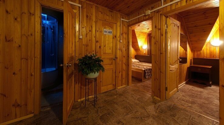На первом этаже уютная гостиная с ТВ и мягкой мебелью, бильярд, финская сауна (парная, мини-бассейн) - оплачивается отдельно, мини-кухня (холодильник, СВ печь, электрический чайник), душ, санузел.