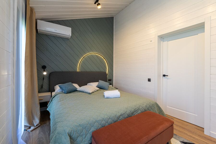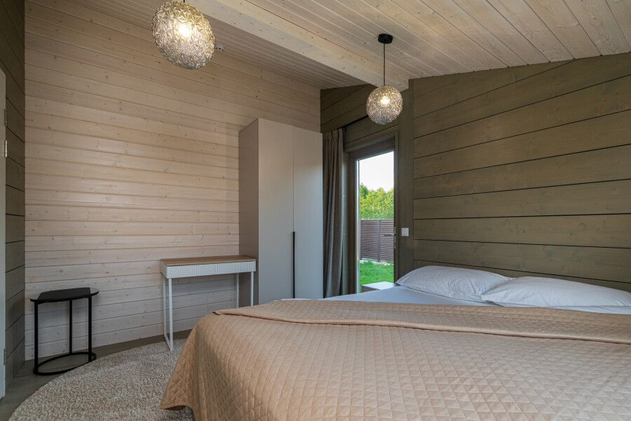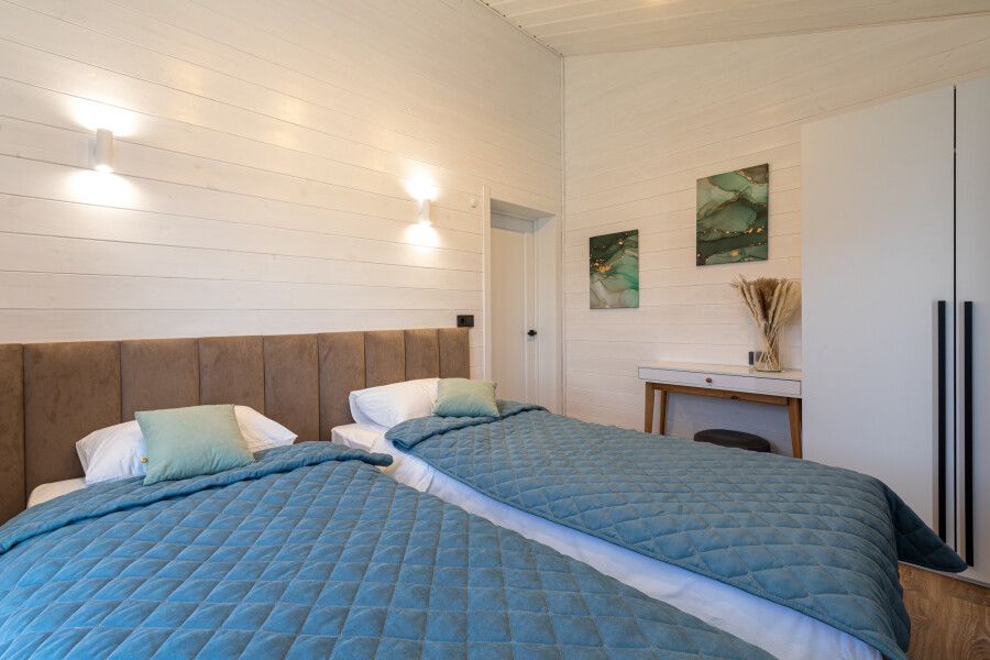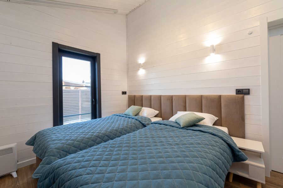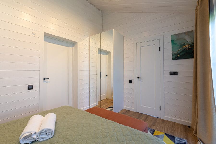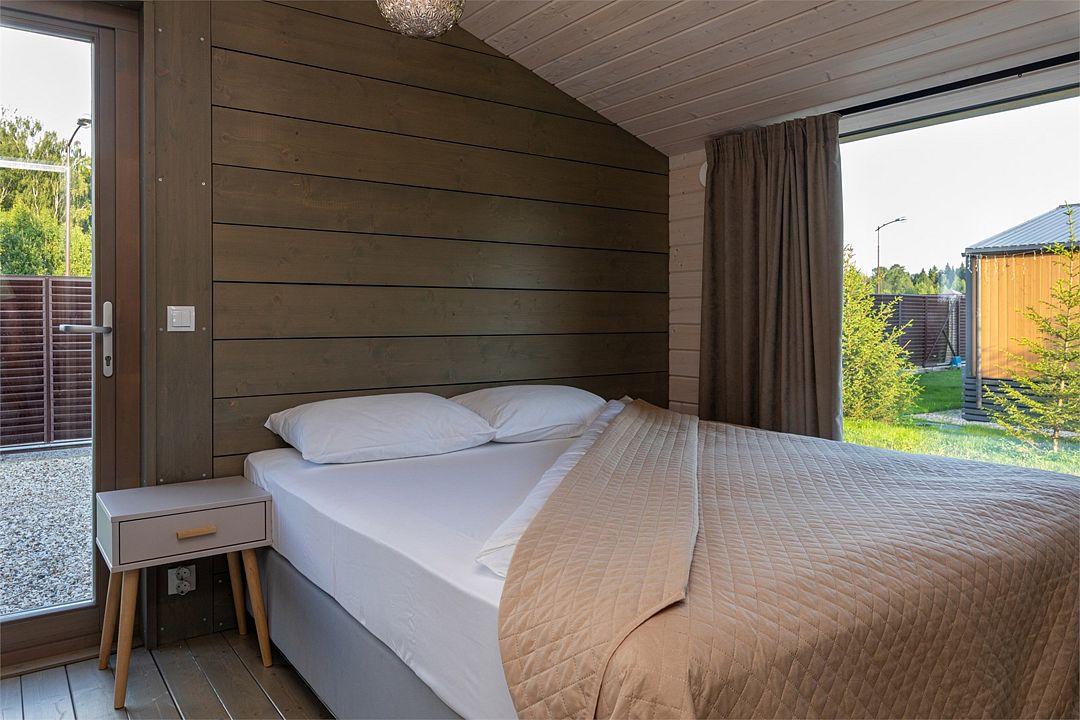 Дом XL с сауной и купелью с двумя спальнями и гостиной с дополнительным диваном. Стоит отметить отличительные особенности: мастер-спальню (спальня с собственным санузлом и душем) и небольшой душ-лапомойку для питомцев при входе.