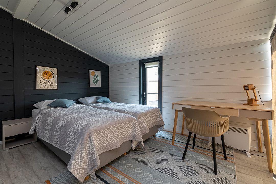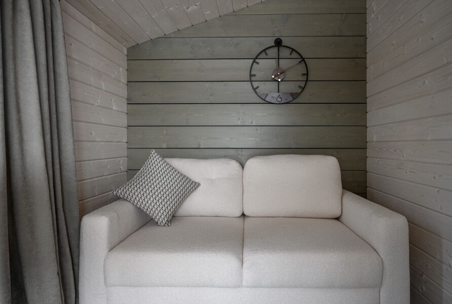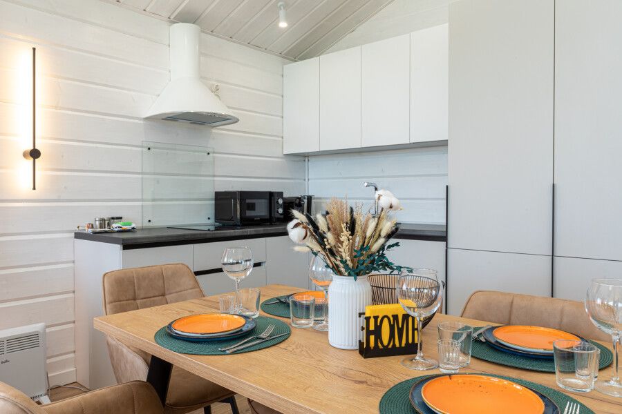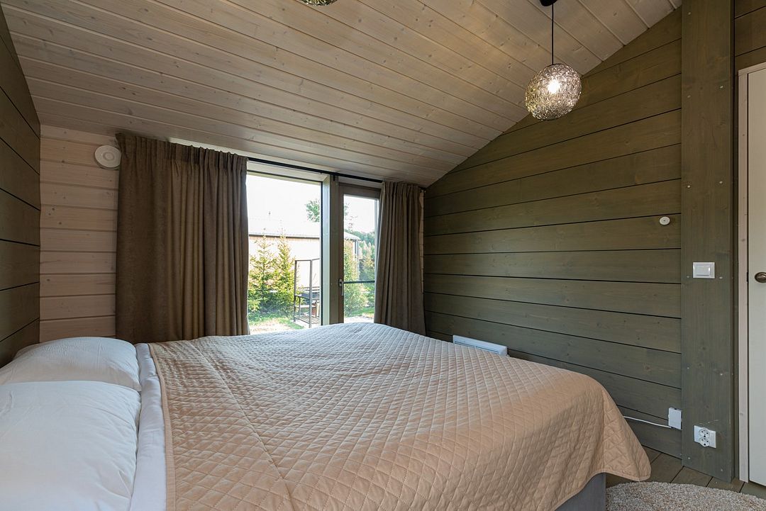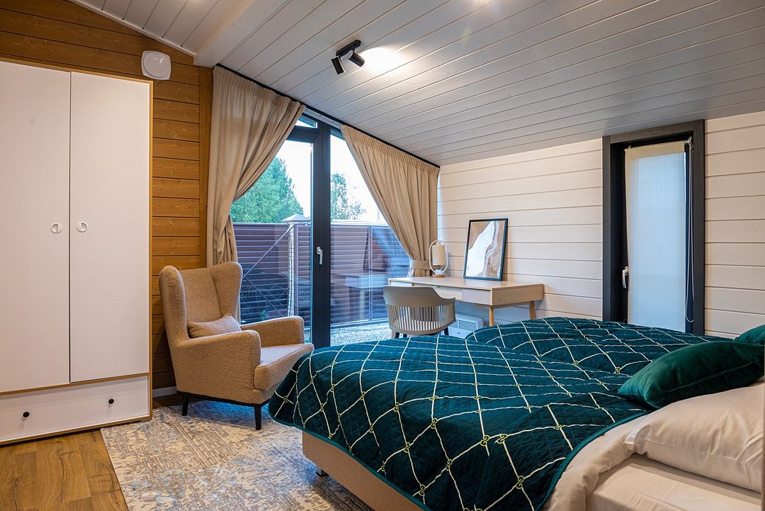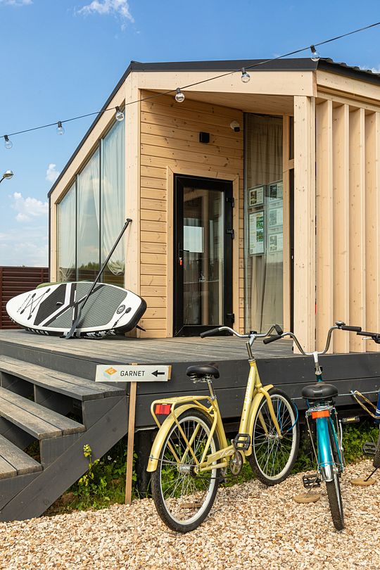Дом XL с сауной и купелью с двумя спальнями и гостиной с дополнительным диваном. Стоит отметить отличительные особенности: мастер-спальню (спальня с собственным санузлом и душем) и небольшой душ-лапомойку для питомцев при входе.