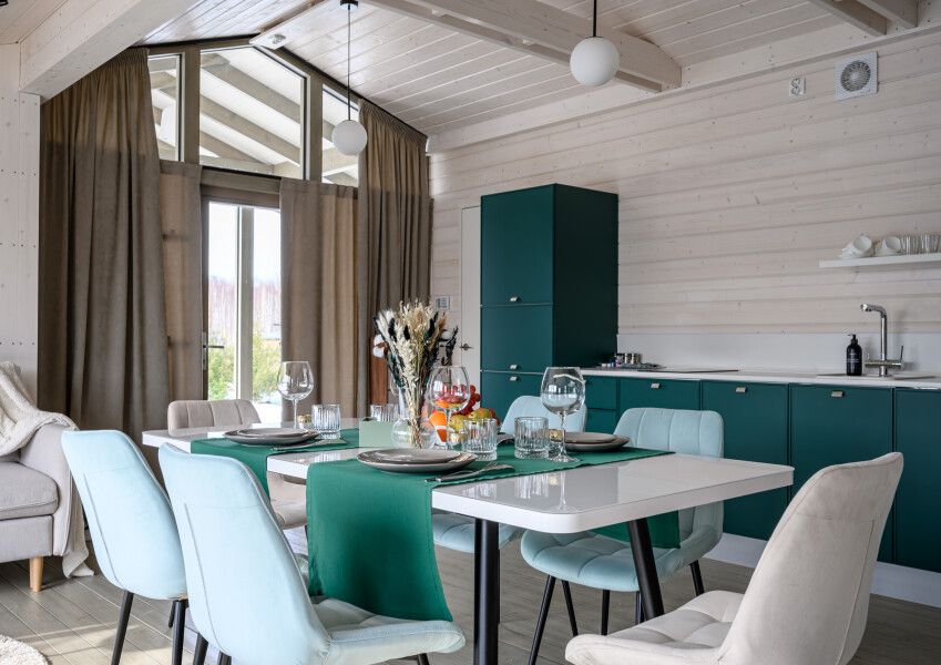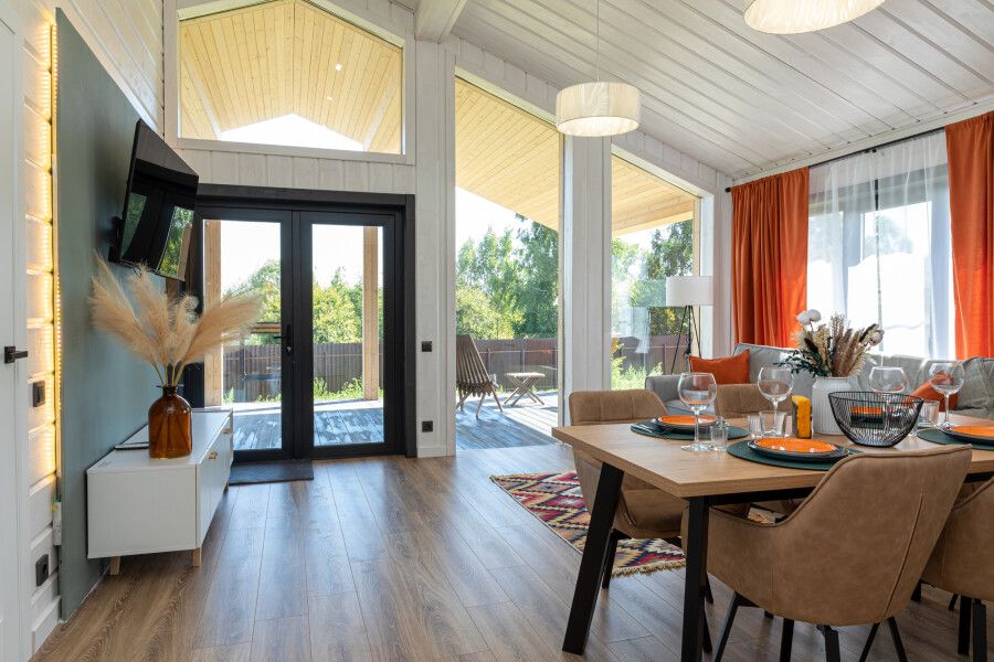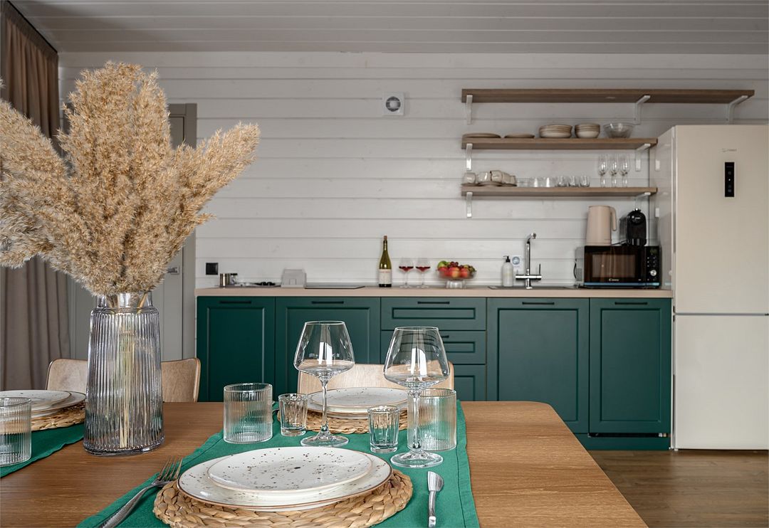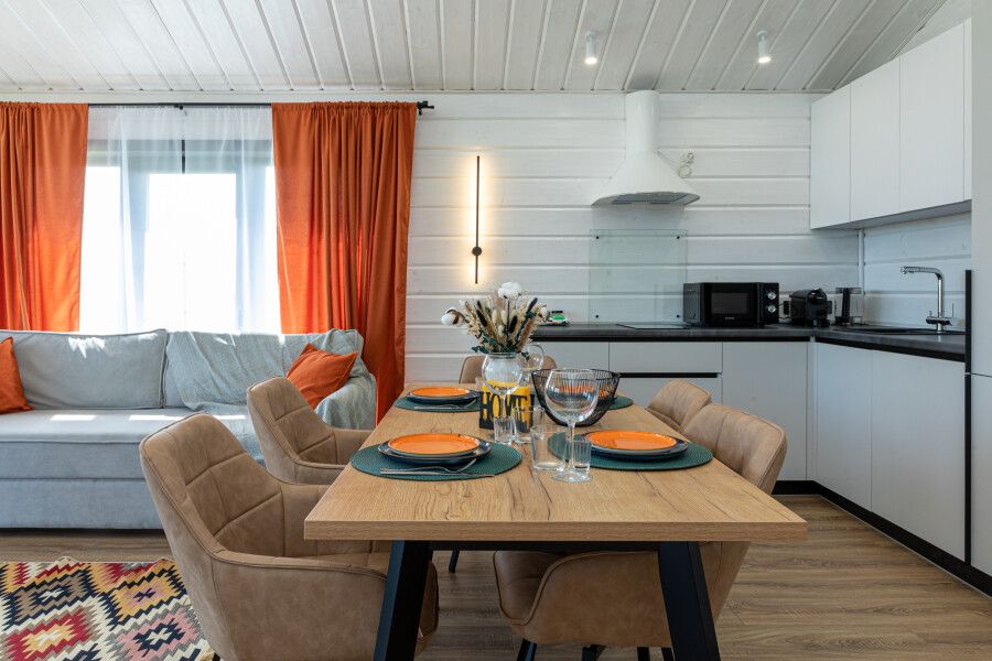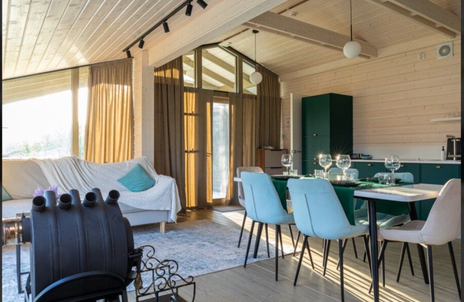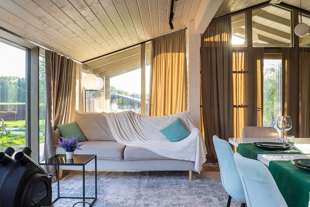 В гостиной — функциональная кухня, обеденная зона, зона отдыха с диваном. Дом оборудован собственной сауной. Интерьер выполнен в современном стиле. Экологичные материалы в отделке, натуральные фактуры в каждом элементе декора и светлые тона в интерьере дополняют ощущение единения с природой.