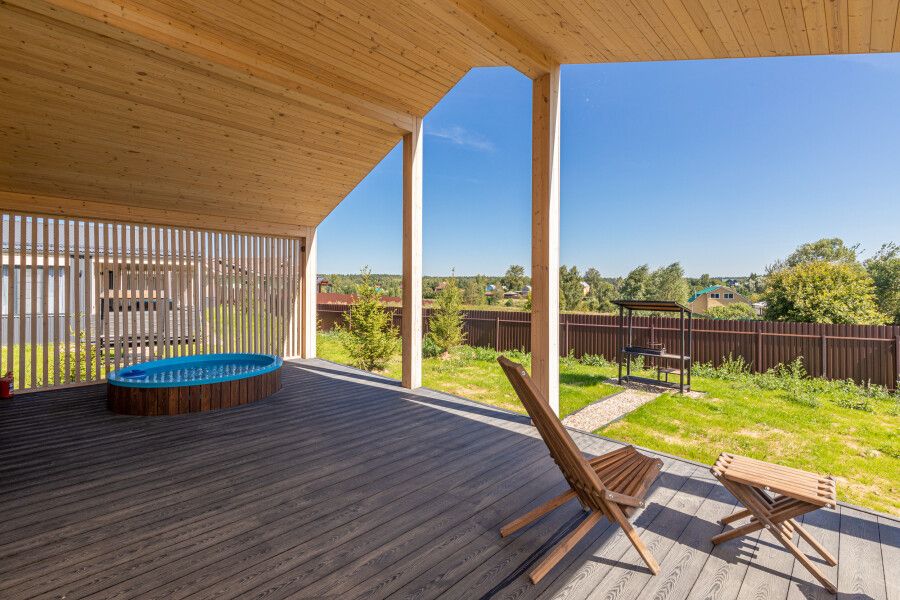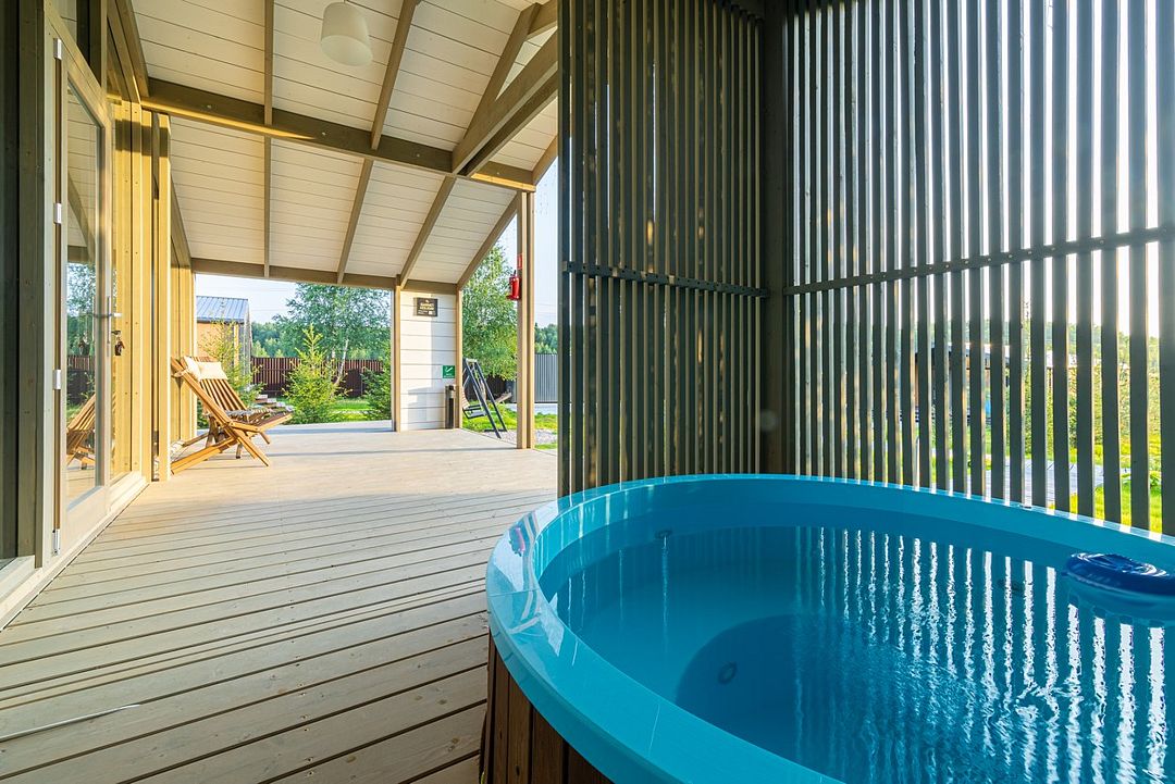 На террасе дома возвышается купель с подогревом — Фурако, способная вместить до четырех человек. Освещенная подсветкой, она создает атмосферу уюта и умиротворения, а рядом расположилась уличная мебель, приглашая к комфортному отдыху.