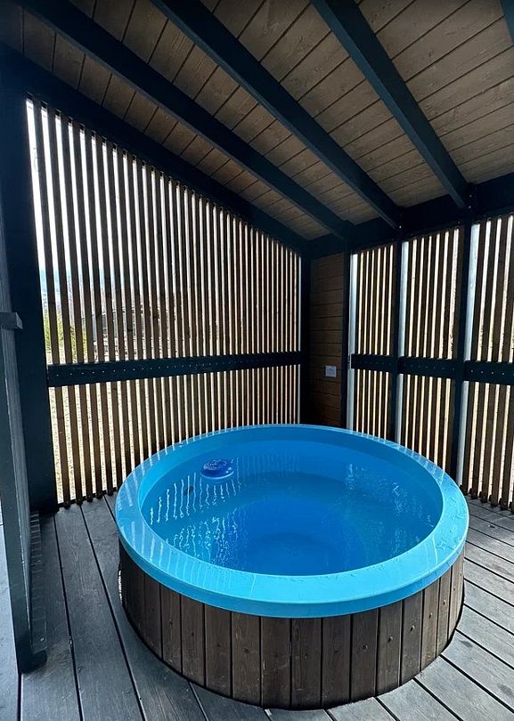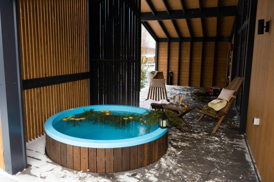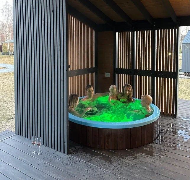 Купель идеально подходит для наслаждения свежим воздухом, даже в зимние дни, даря ощущение тепла и покоя.