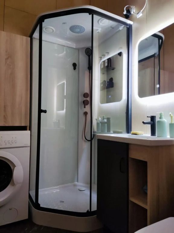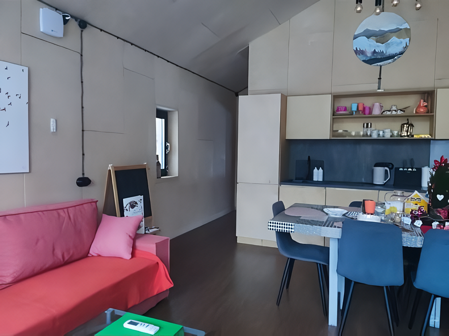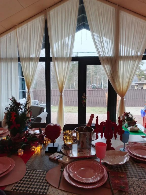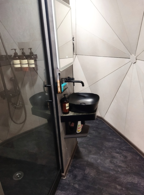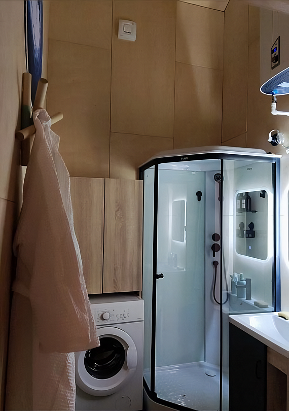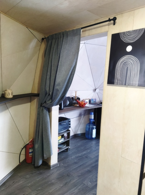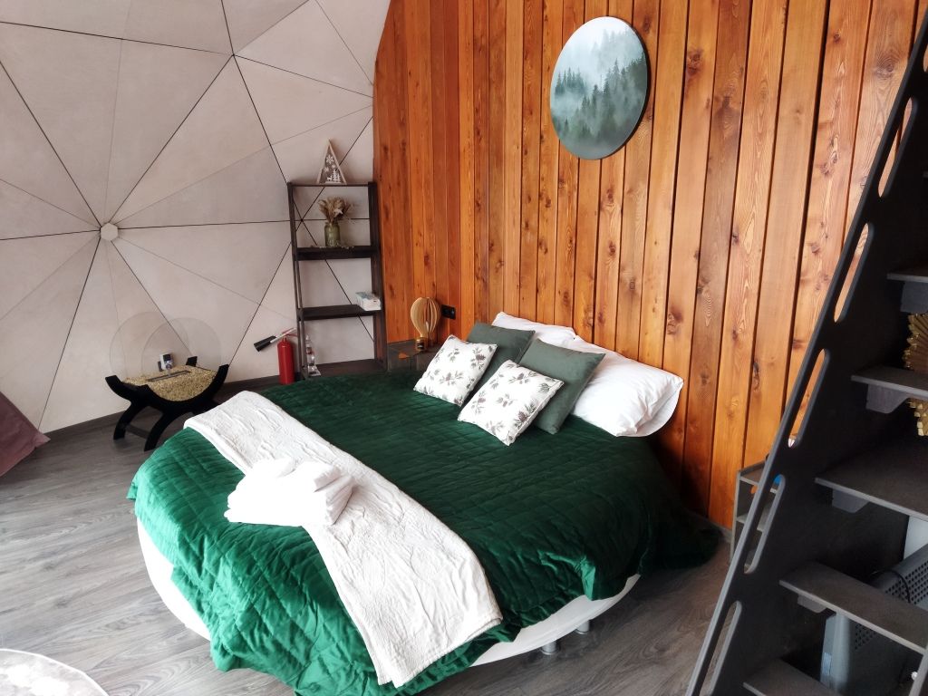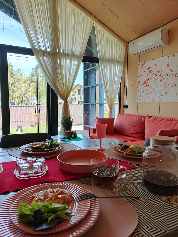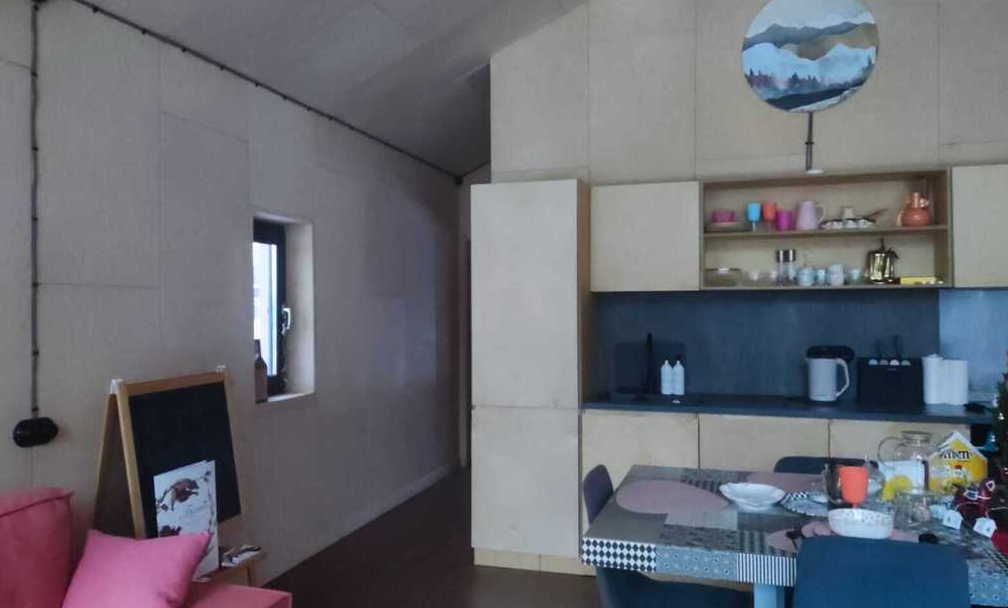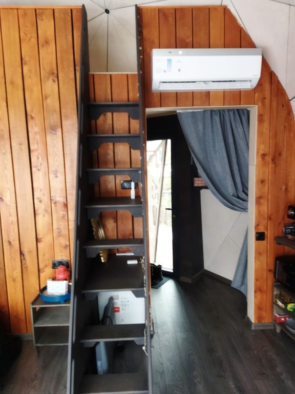 Спальня-студия с панорамным видом на лес, с круглой кроватью диаметром 2 м, кухонной зоной, антресолью для детей и/или взрослых со спальным местом 140*200, санузел, прихожая, терраса 12*9,5 м. Удобная и стильная мебель, техника, вся необходимая посуда, чистое белье, банные халаты и полотенца, также мыльные принадлежности.