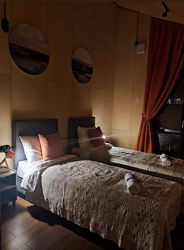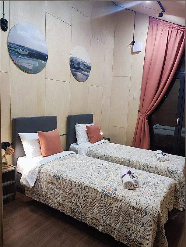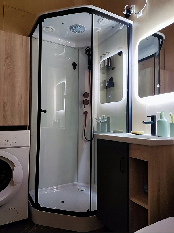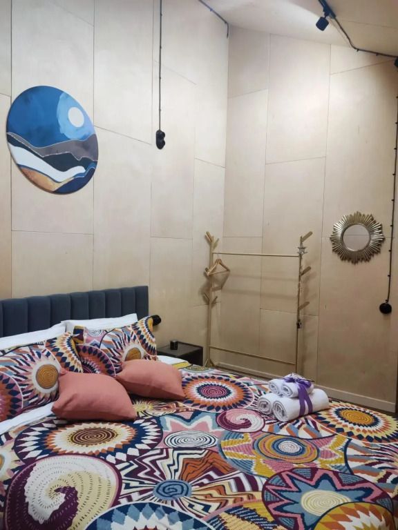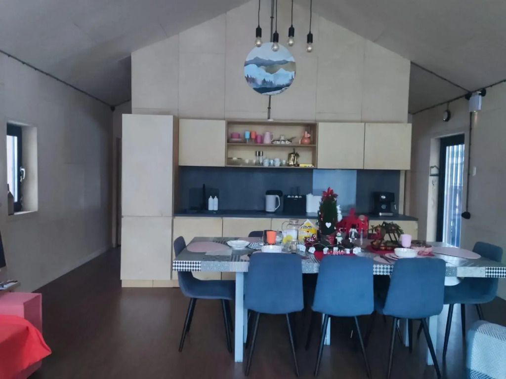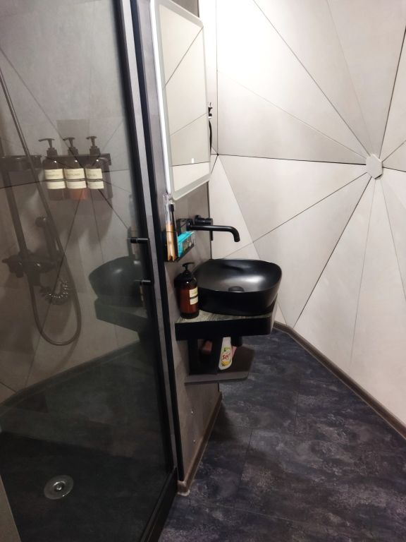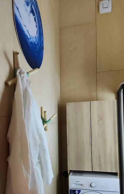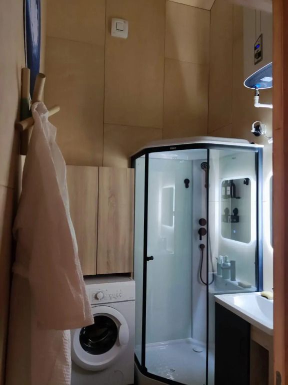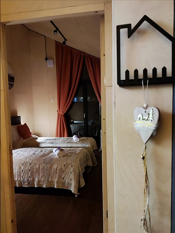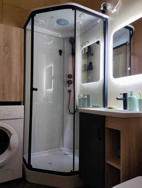 Спальня-студия с панорамным видом на лес, с круглой кроватью диаметром 2 м, кухонной зоной, антресолью для детей и/или взрослых со спальным местом 140*200, санузел, прихожая, терраса 12*9,5 м. Удобная и стильная мебель, техника, вся необходимая посуда, чистое белье, банные халаты и полотенца, также мыльные принадлежности.