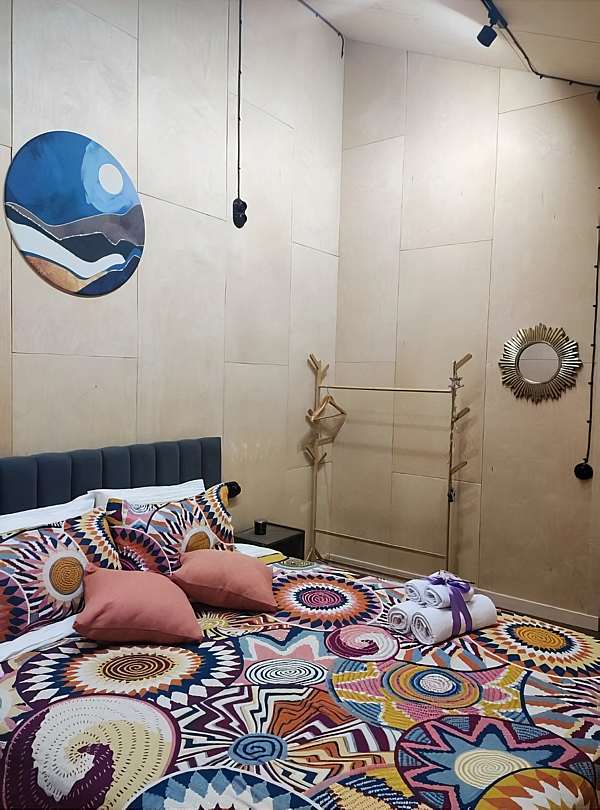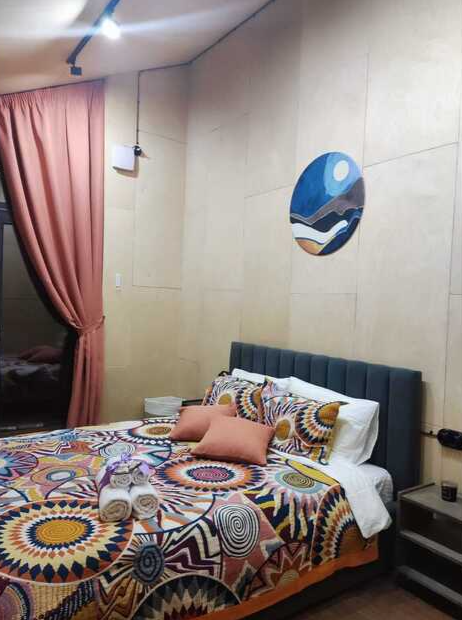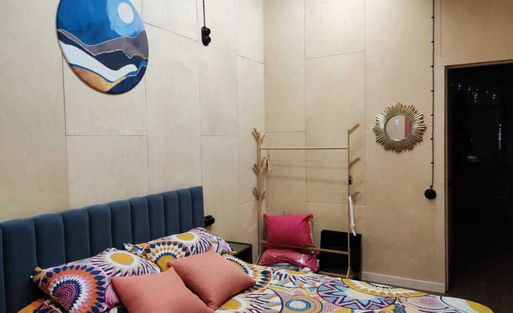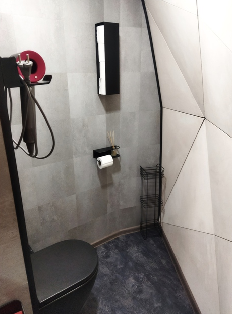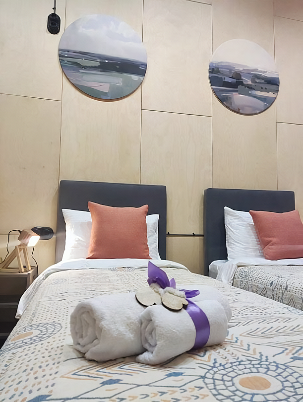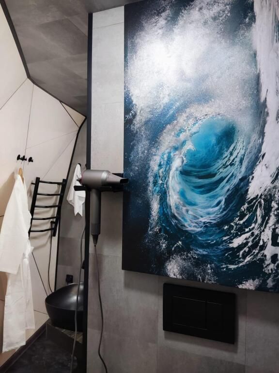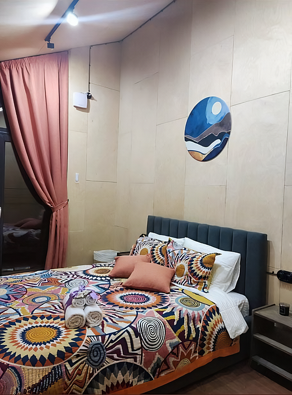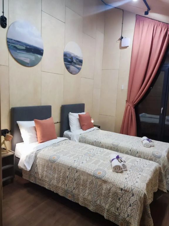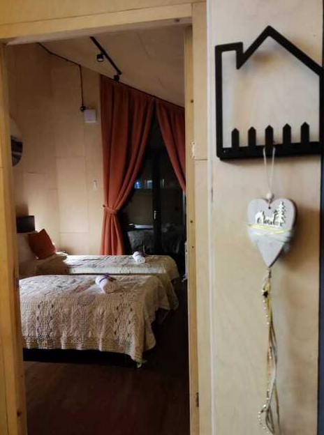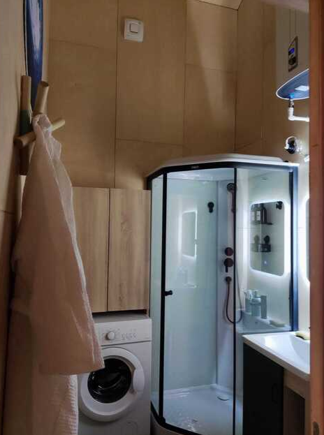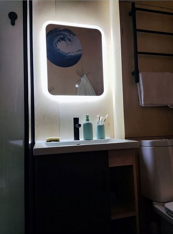 Спальня-студия с панорамным видом на лес, с круглой кроватью диаметром 2 м, кухонной зоной, антресолью для детей и/или взрослых со спальным местом 140*200, санузел, прихожая, терраса 12*9,5 м. Удобная и стильная мебель, техника, вся необходимая посуда, чистое белье, банные халаты и полотенца, также мыльные принадлежности.