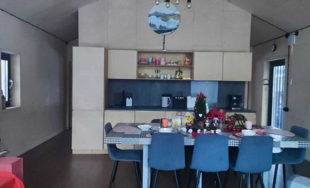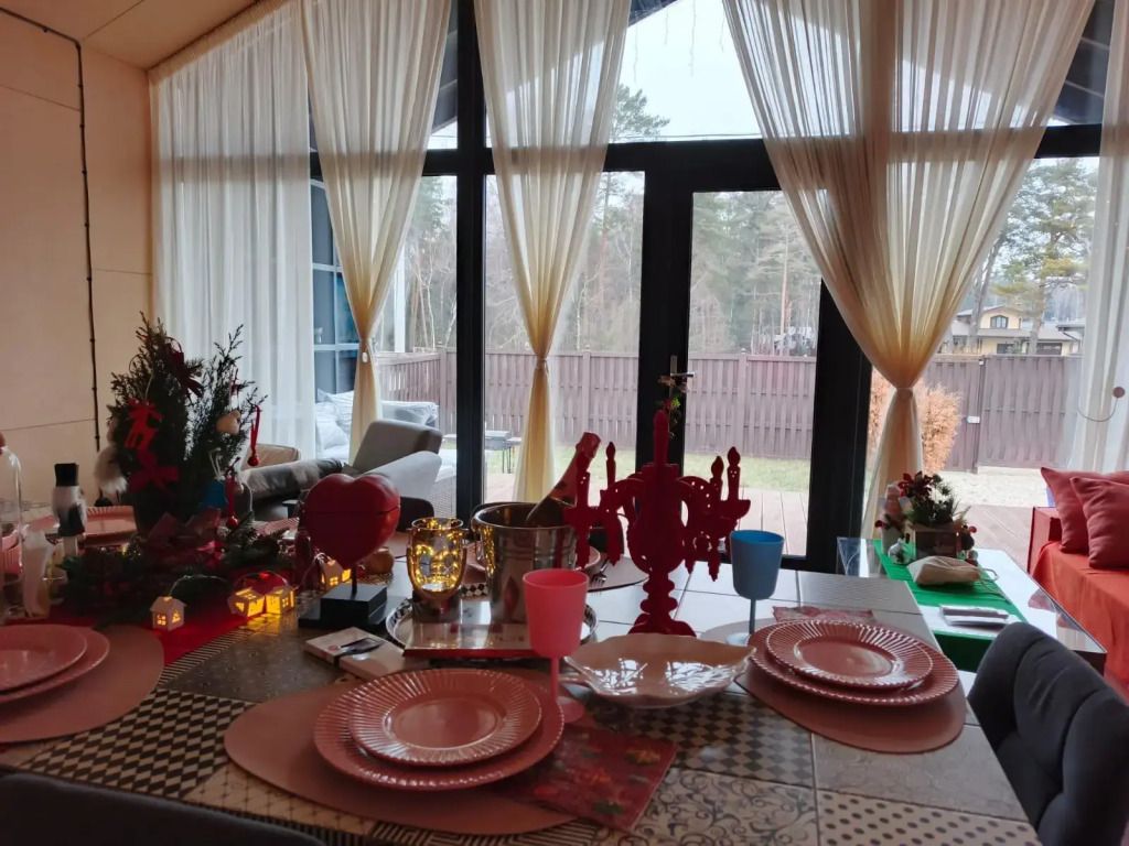 Две спальни по 12 кв. м. с панорамным видом и выходом на веранду, 1 двуспальная кровать и 2 односпальные кровати, кухня-гостиная 28 кв. м. с огромным дизайнерским столом на 10 человек, диваном со спальным местом 150*200, всей встроенной техникой, включая большой холодильник с морозилкой, посудомойка , духовка, варочная плита, санузел с душевой, стиралкой, гардеробная с утюгом, гладилкой, веранда 2,4х5,5м с диваном и столиком. Удобная и стильная мебель, вся необходимая посуда, чистое белье, банные халаты и полотенца, также мыльные принадлежности.