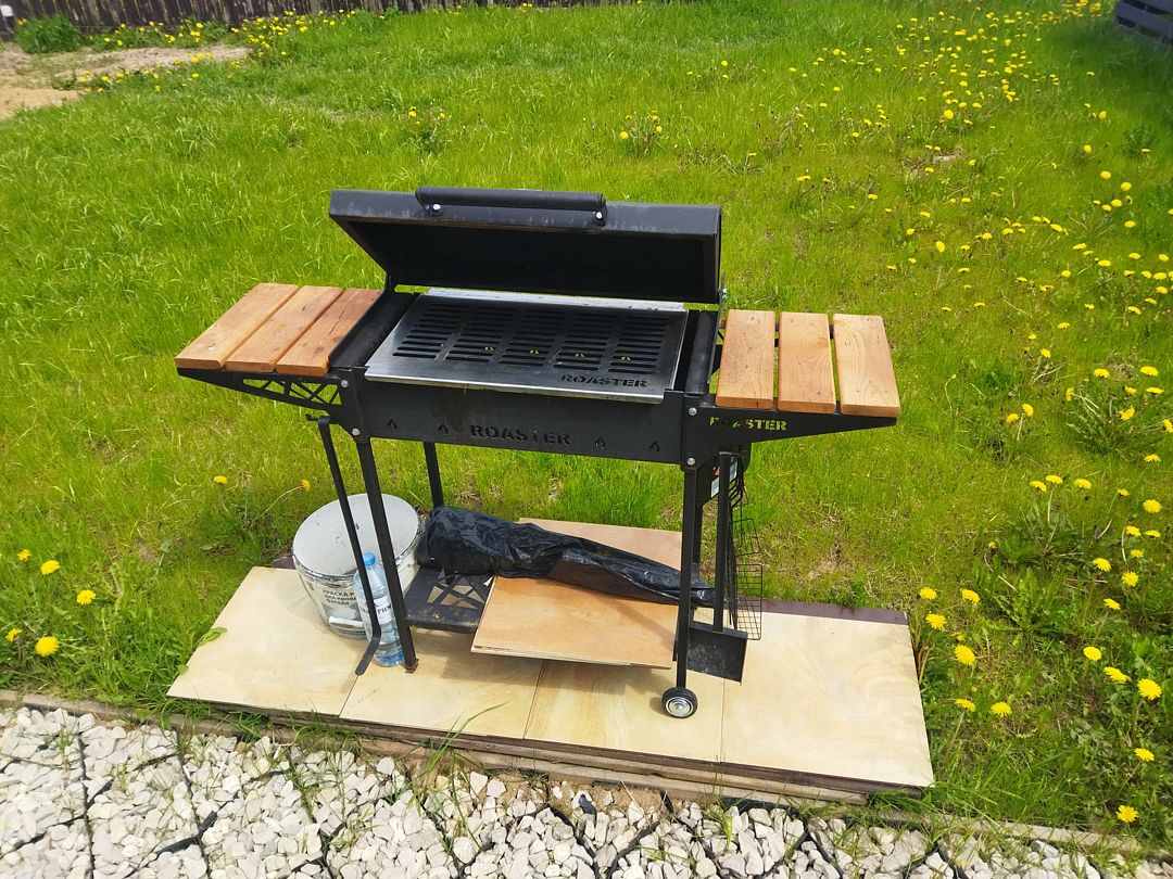 На террасе кресла-шезлонги со столиком, рядом костровая чаша-мангал с решеткой для шашлыков и барбекю, 4 кресла-шезлонга вокруг.