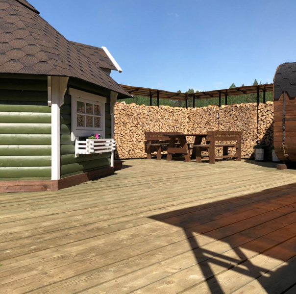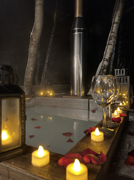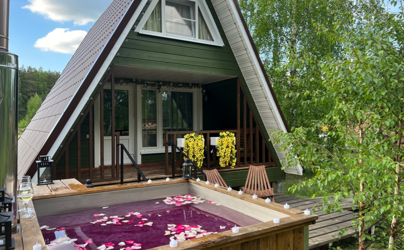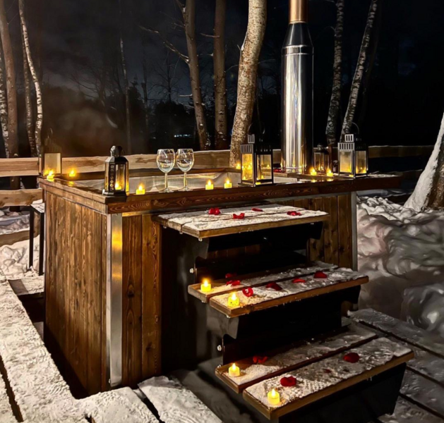 При бронировании домика вам доступна аренда горячей купели. Воду в купели подогревают до 40 °С и вы можете пользоваться ей весь срок аренды домика.