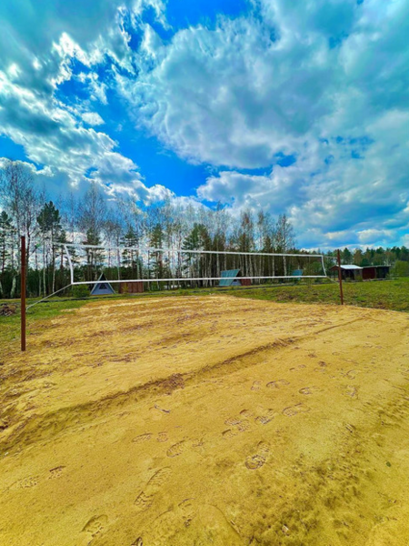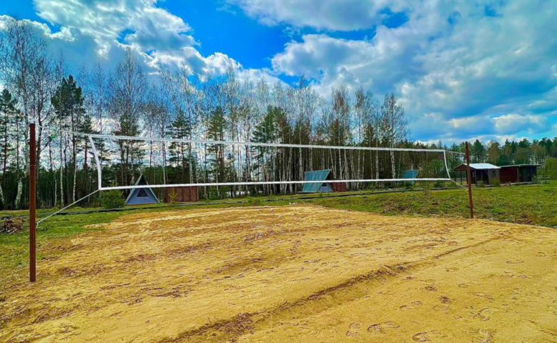 На территории есть волейбольная площадка с сеткой, на которой также можно поиграть в мини футбол.