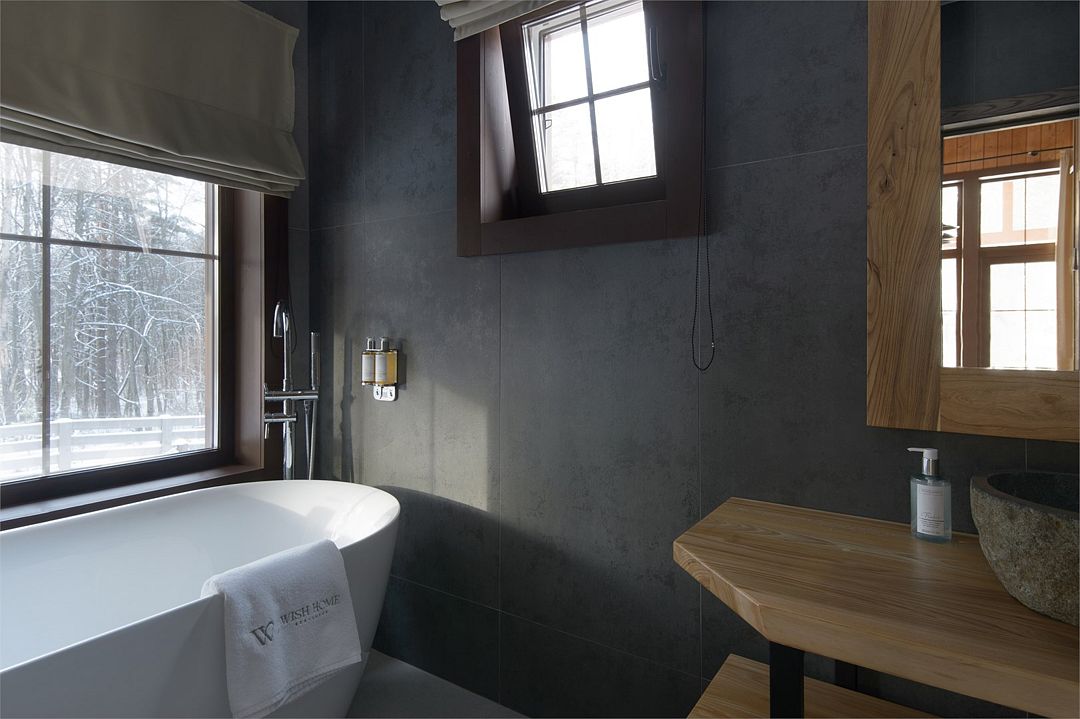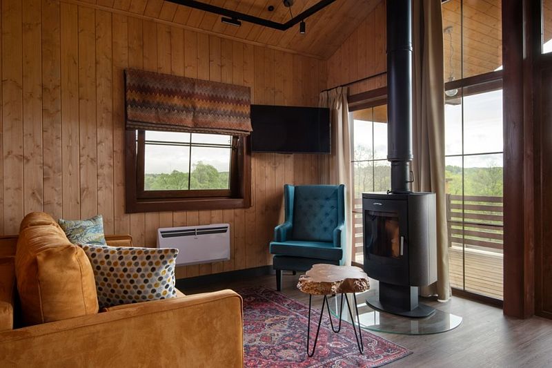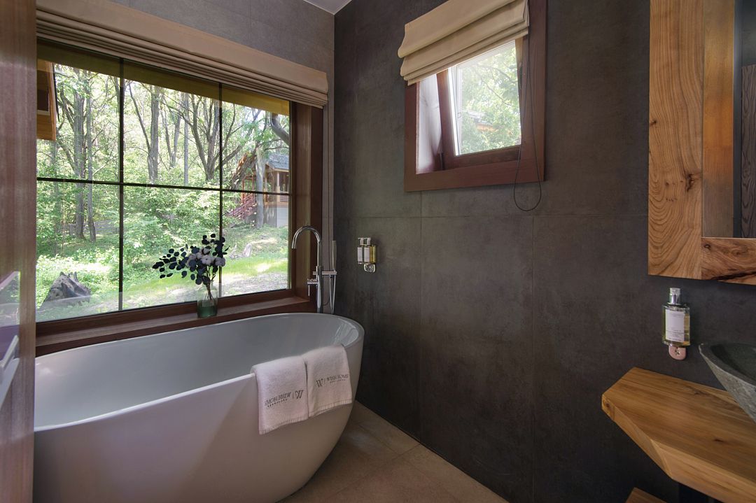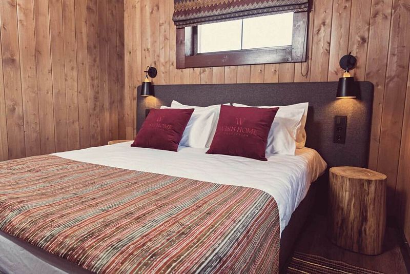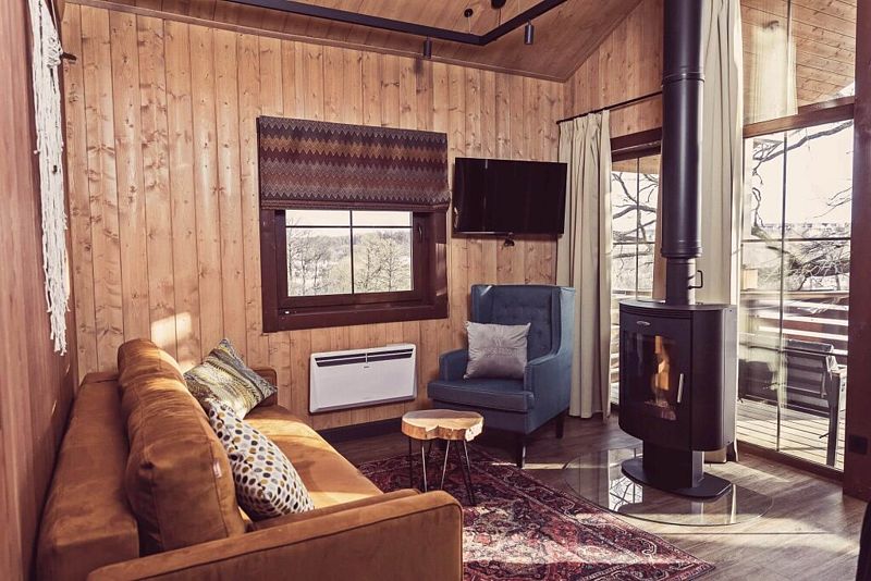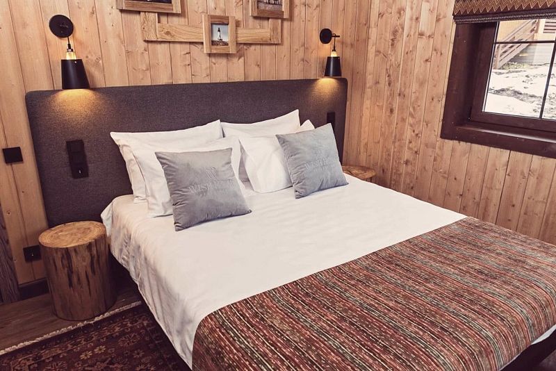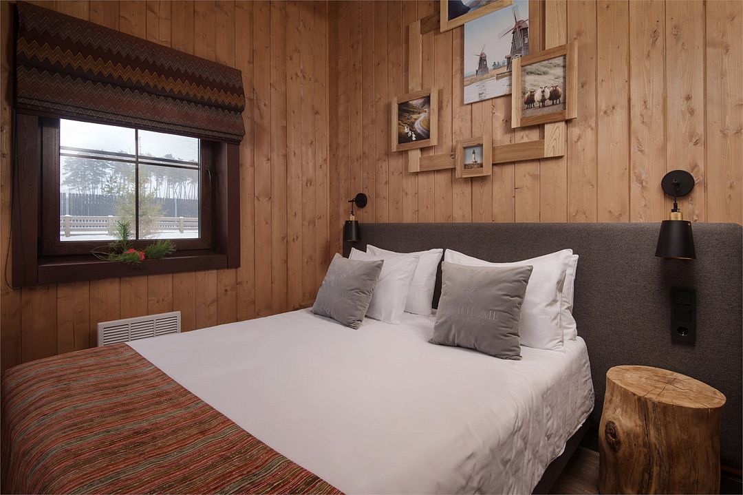 Лодж категории «S с ванной» c одной спальней и одной ванной комнатой с панорамным окном.