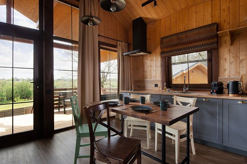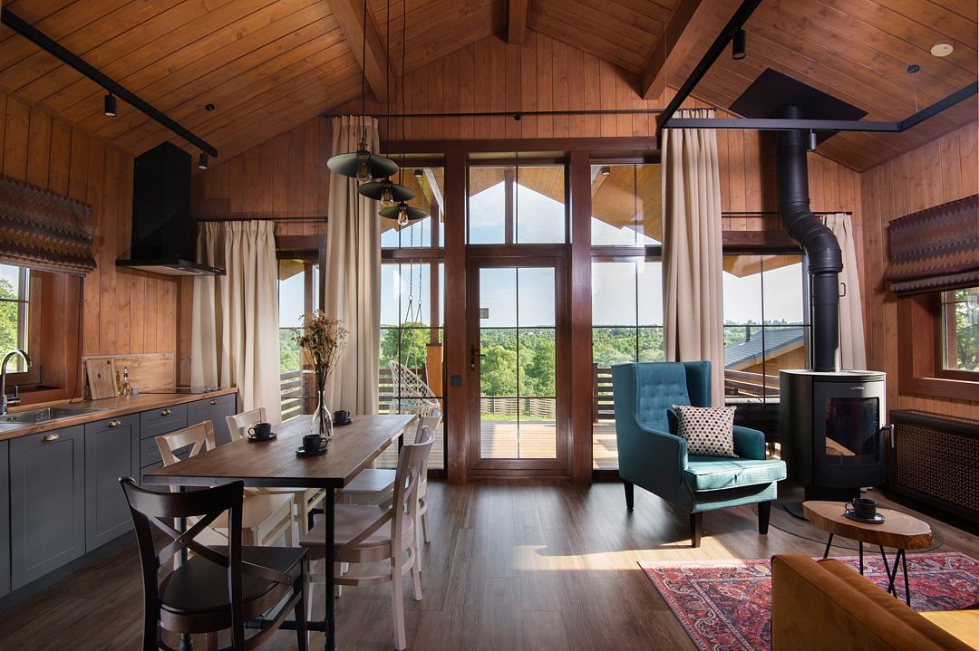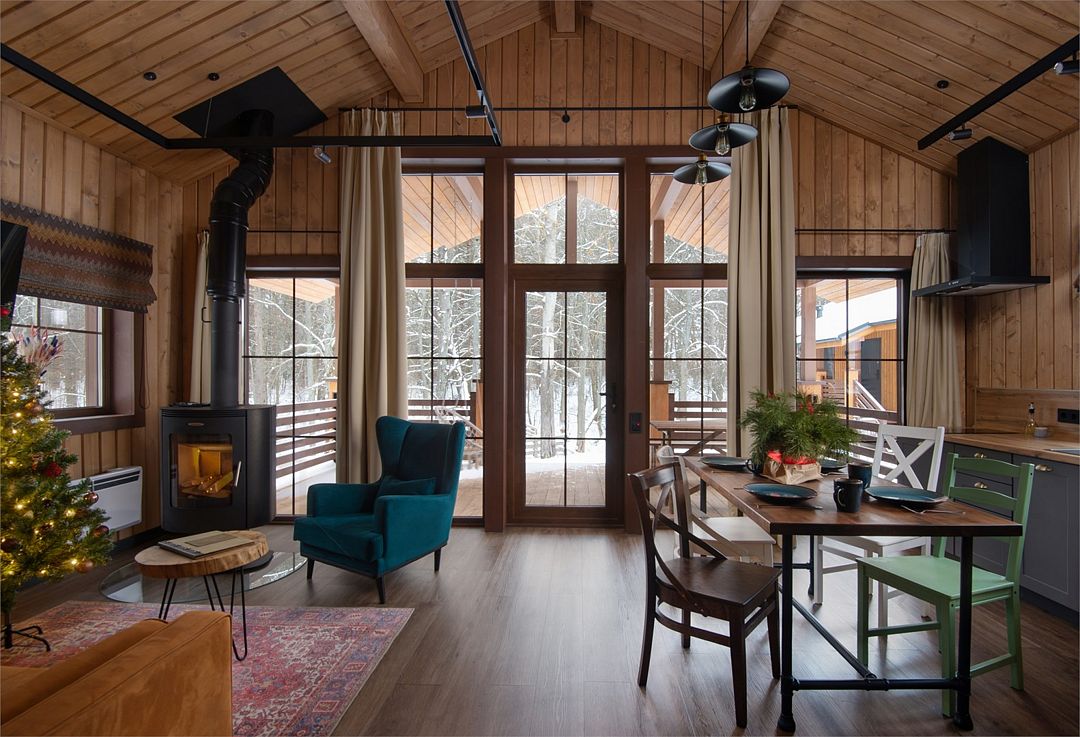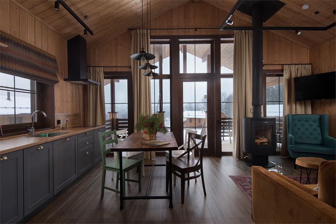 В гостиной — функциональная мини-кухня, обеденная зона, зона отдыха с диваном и камином.